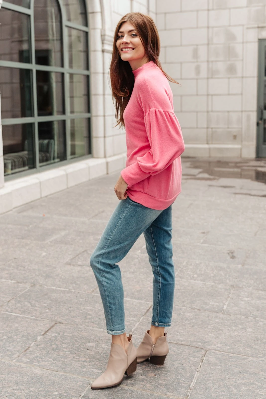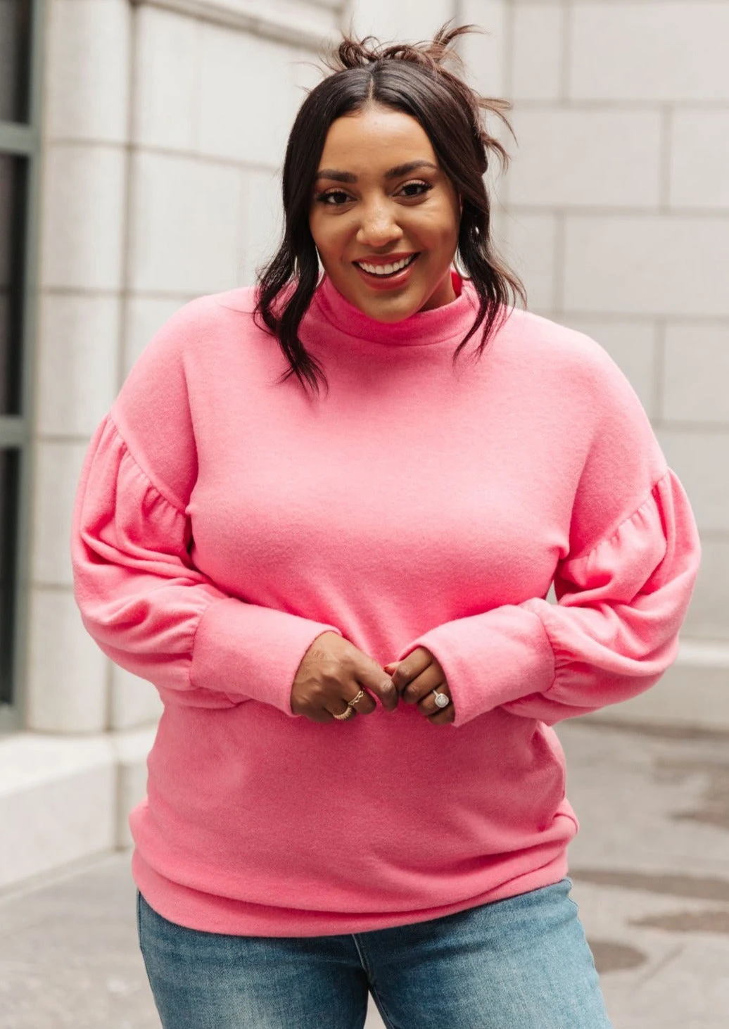 Rocking a fun pop of color during the winter months is a great way to brighten your winter blues! The Elle Sweater is a show stopping bright pink sweater that you’ll LOVE. This soft sweater has a mock neckline and billowing sleeves with a fitted wrist that give it an extra fun flare. Pair this top with jeans or leggings.