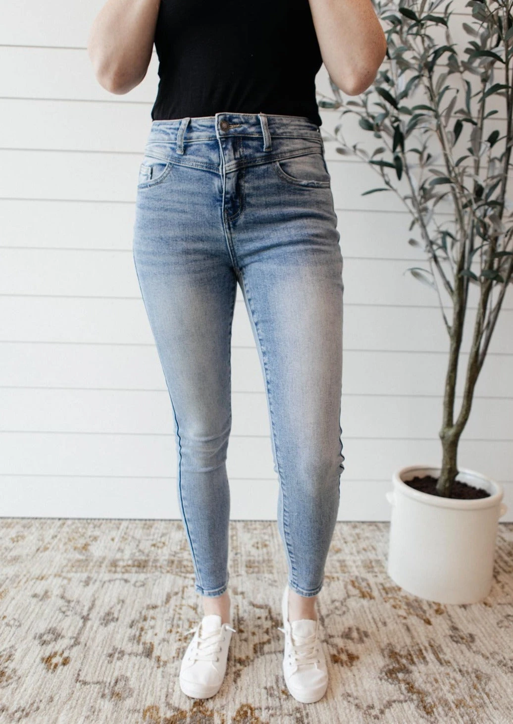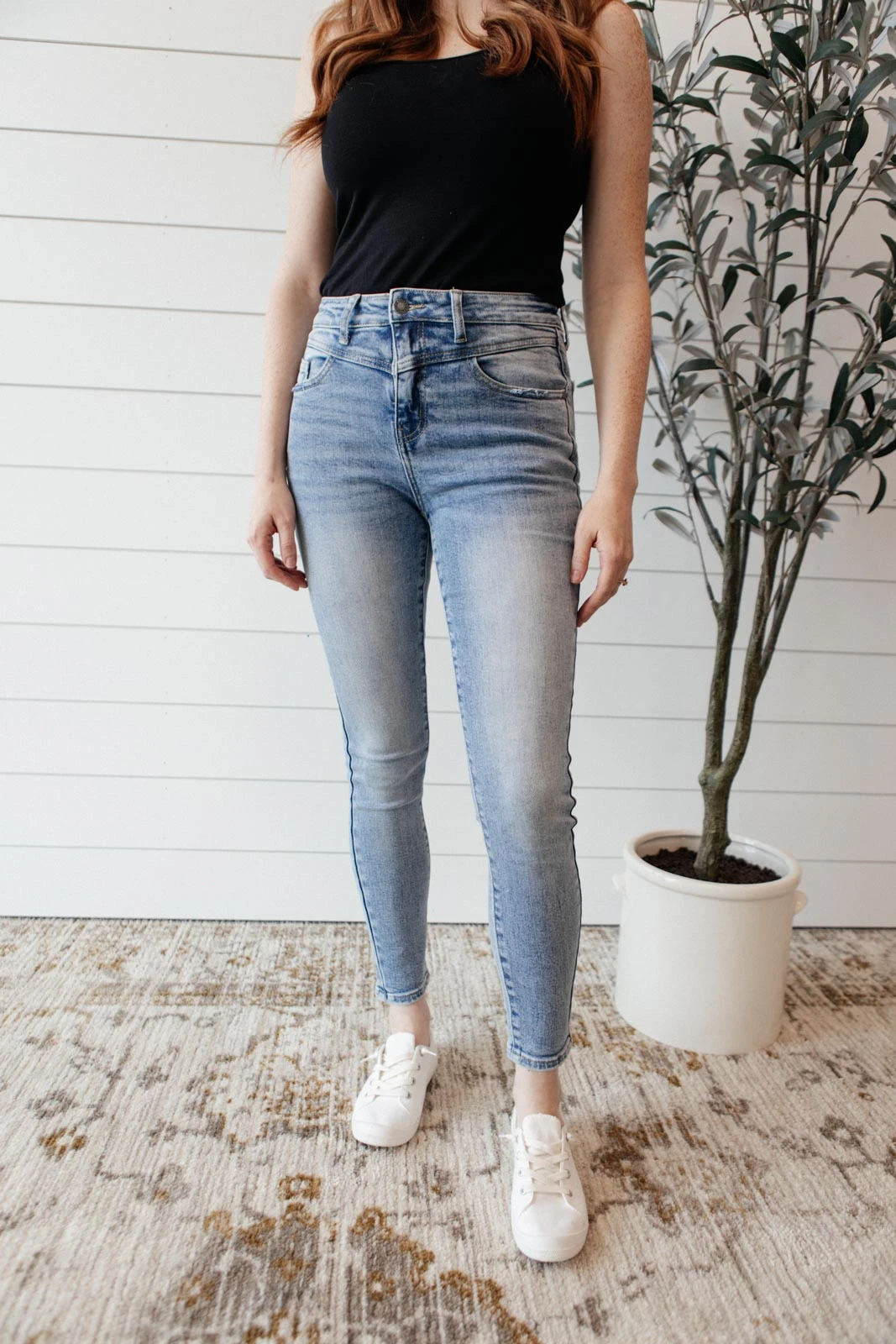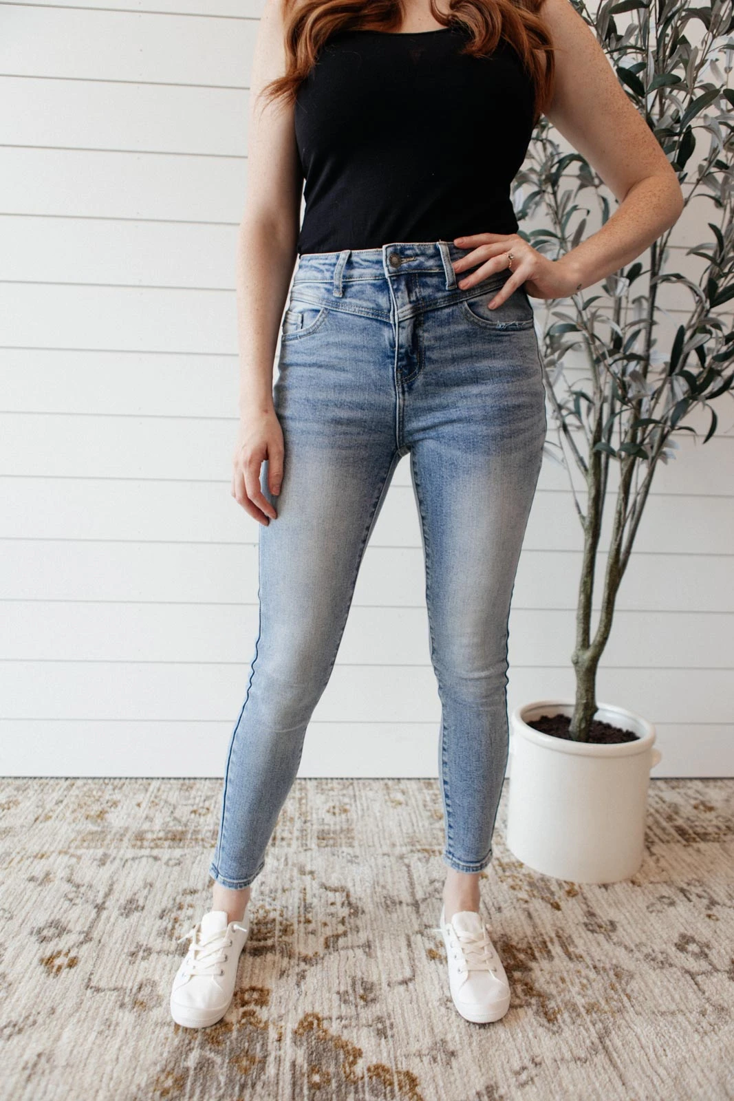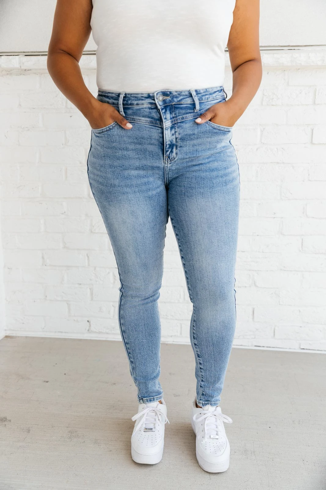 The Feeling Blue Jeans are a light wash skinny jean with four way stretch and a cute yoke detail at the waist. It’s a style to set yourself apart and a classic jean to spice up your casual day to day outfits!Â