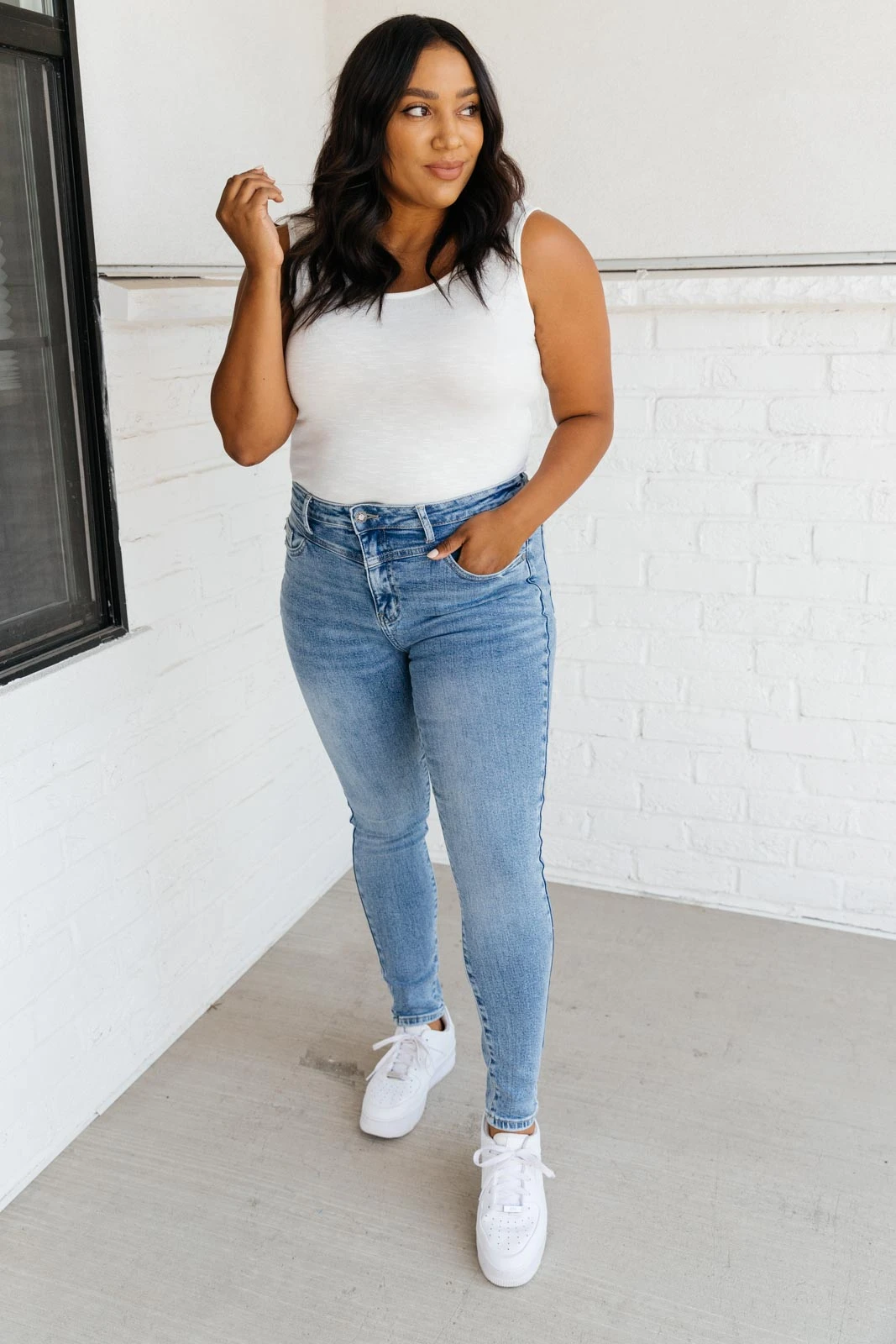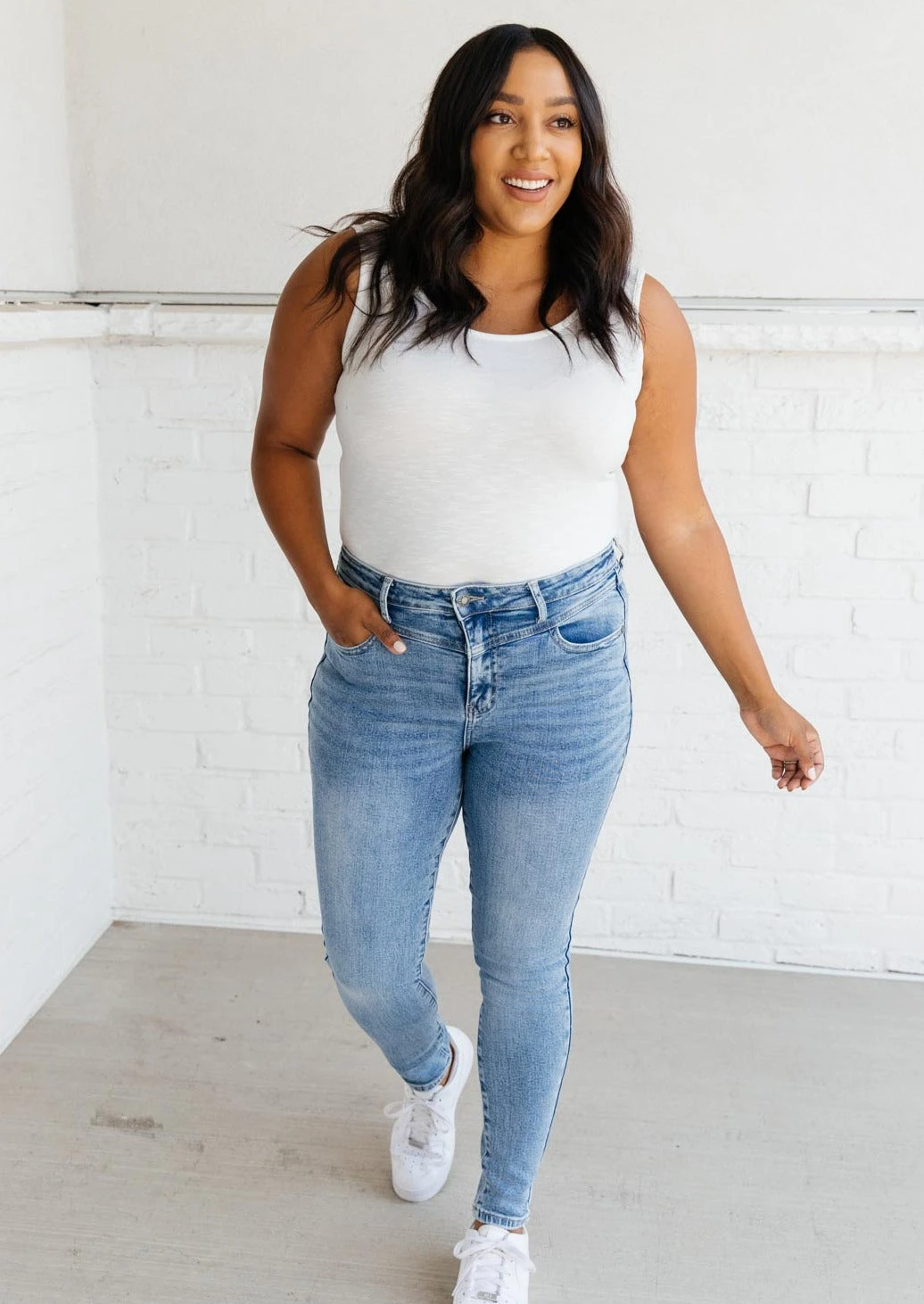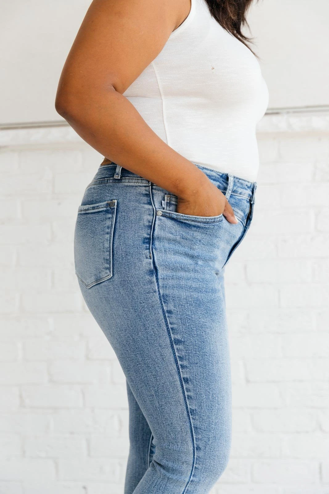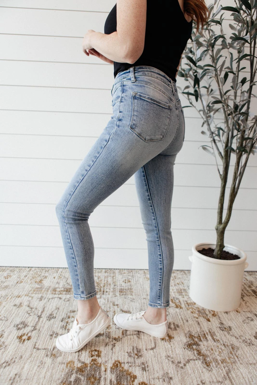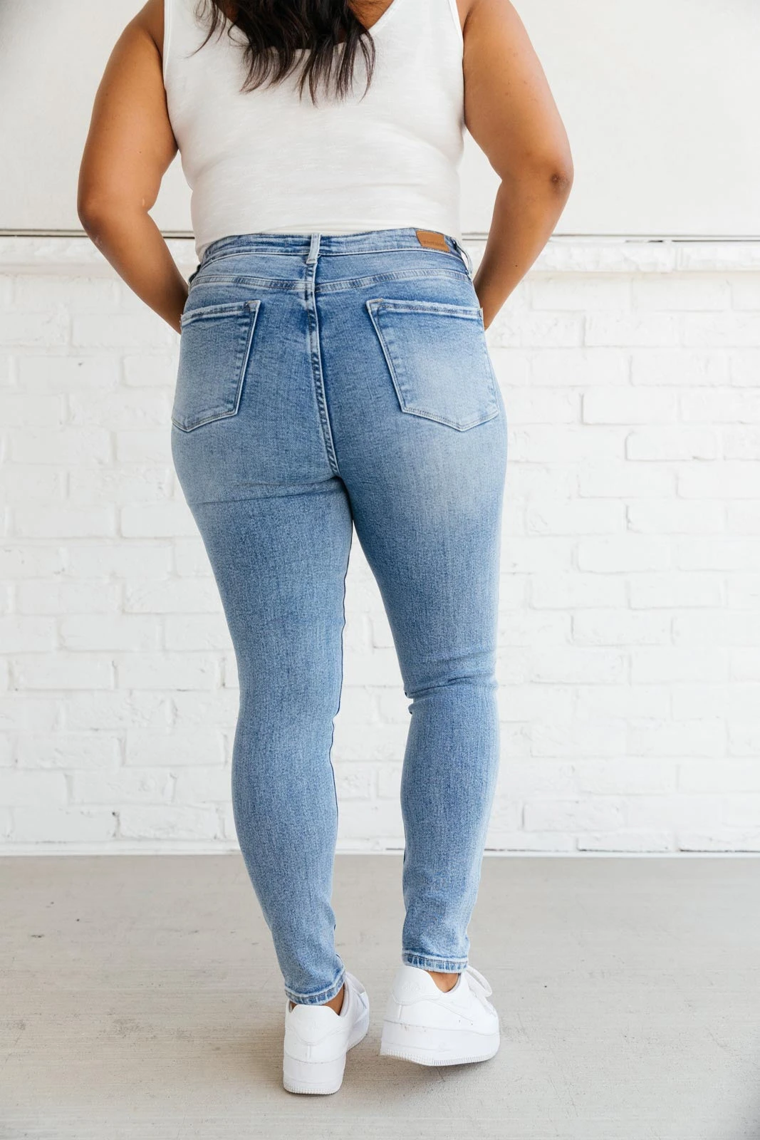 The Feeling Blue Jeans are a light wash skinny jean with four way stretch and a cute yoke detail at the waist. It’s a style to set yourself apart and a classic jean to spice up your casual day to day outfits!Â