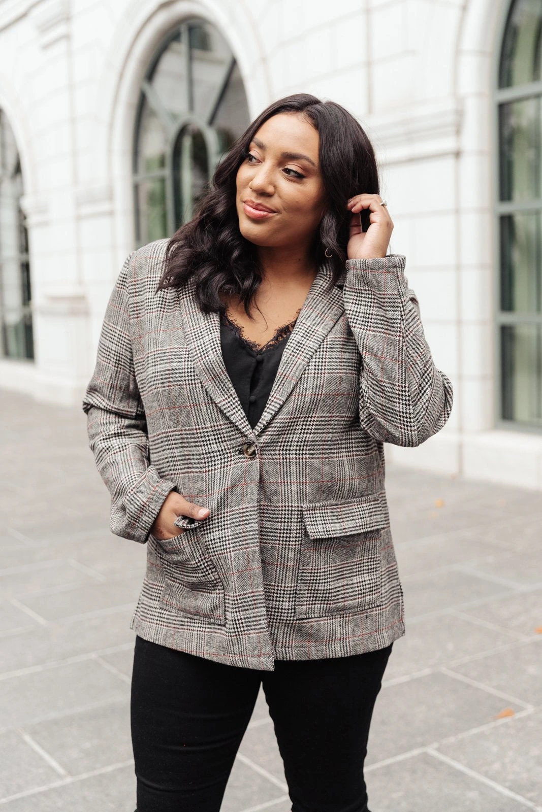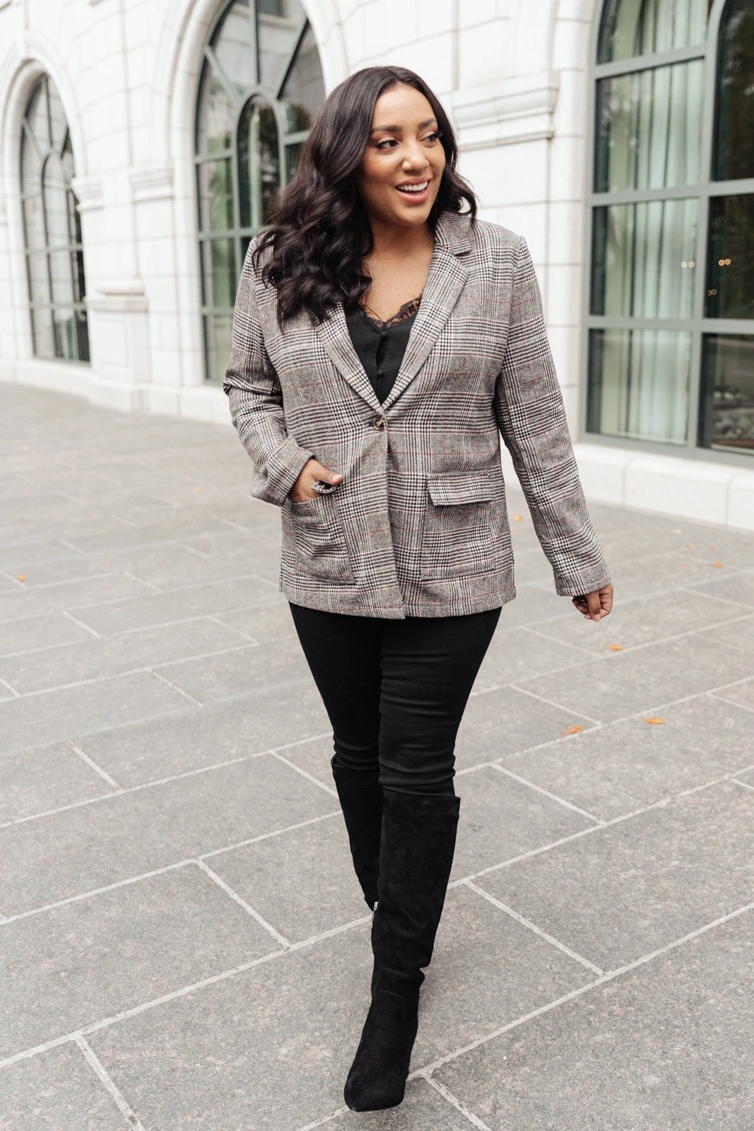 Keywords: Blazer, Workwear, Plaid, Layering, Outerwear