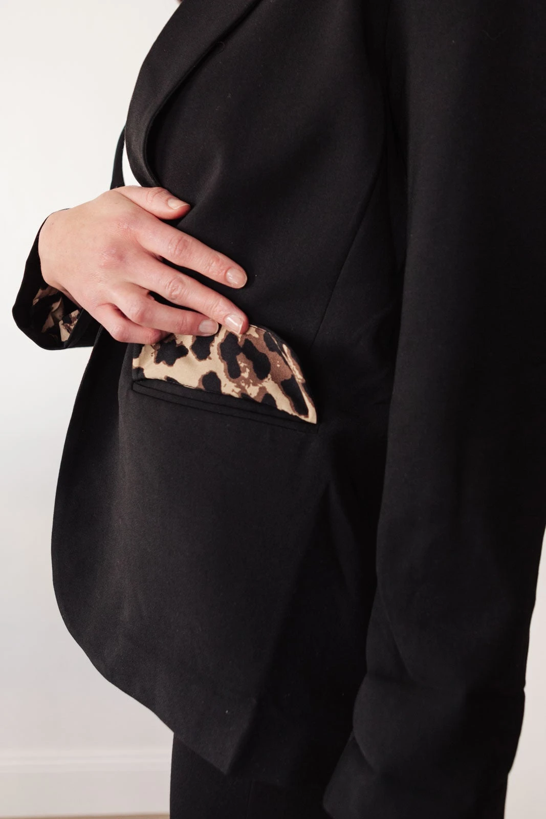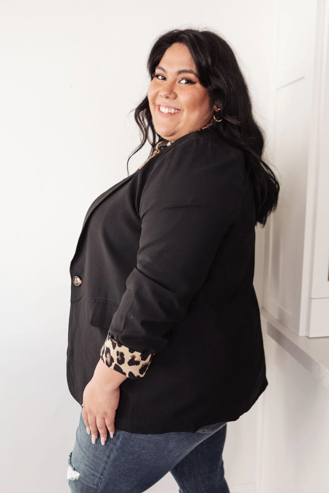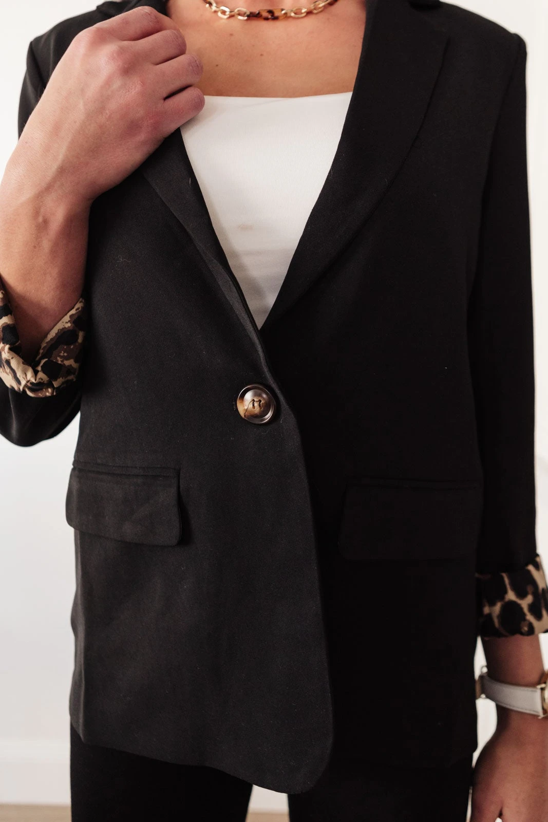 We are absolutely loving adding blazers to everyday wear. Chic will be your new middle name when you show up in this blazer. It has a fun pop of animal print lining the inside. Roll up the cuff for that peekaboo of sass, or you can keep the sleeves down for the classic black blazer style. This blazer features a lapel collar with notches and a kick pleat at the back, with two front flap faux pockets. Style with a tee and jeans for a casual business look, or dress it up with a mini dress and heels.