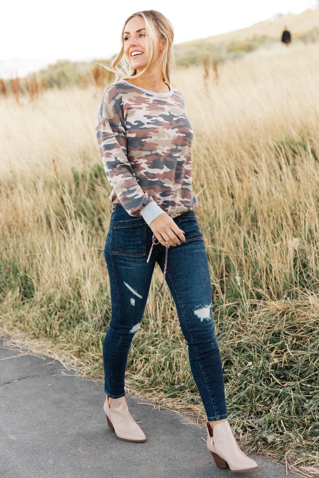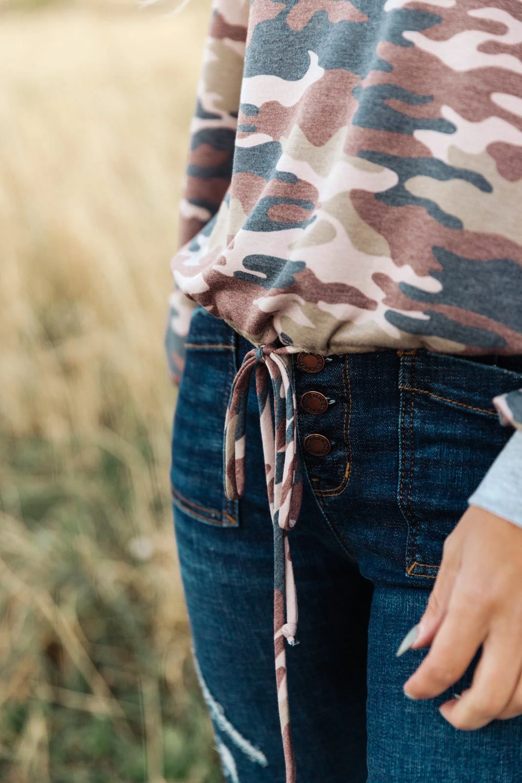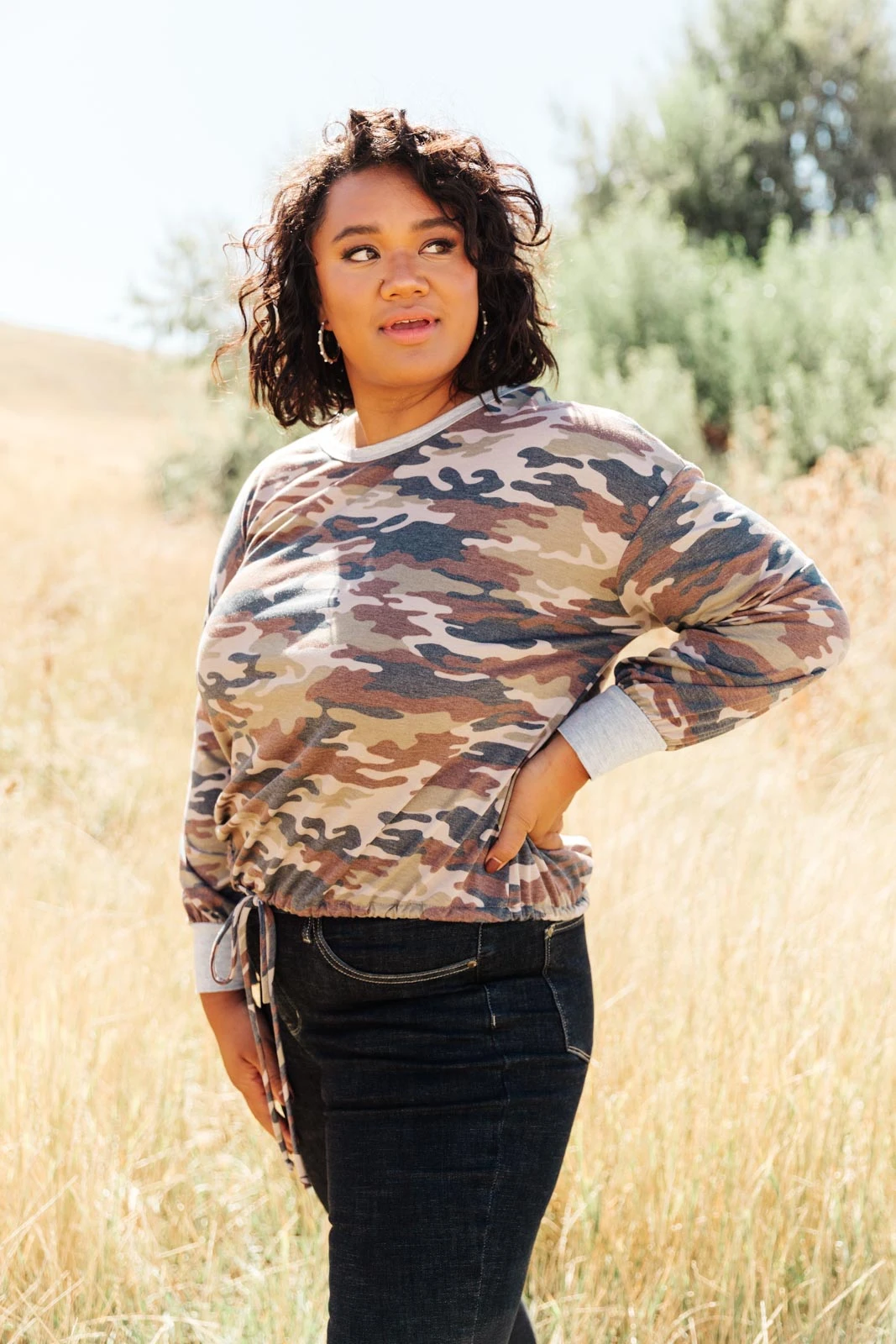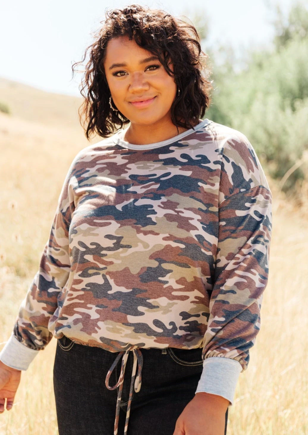 This camo print top is a great throw on and go top. The Find Me In The Woods Top is a comfortable pullover with details that make it special! The drawstring waist and dropped shoulder give this top a unique silhouette. This top pairs perfectly with joggers or jeans.