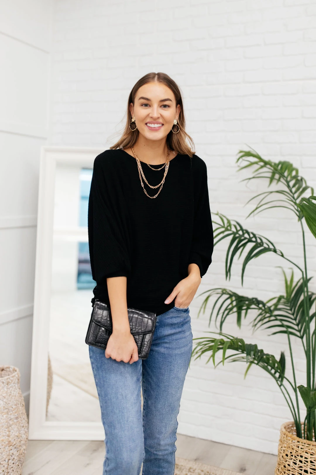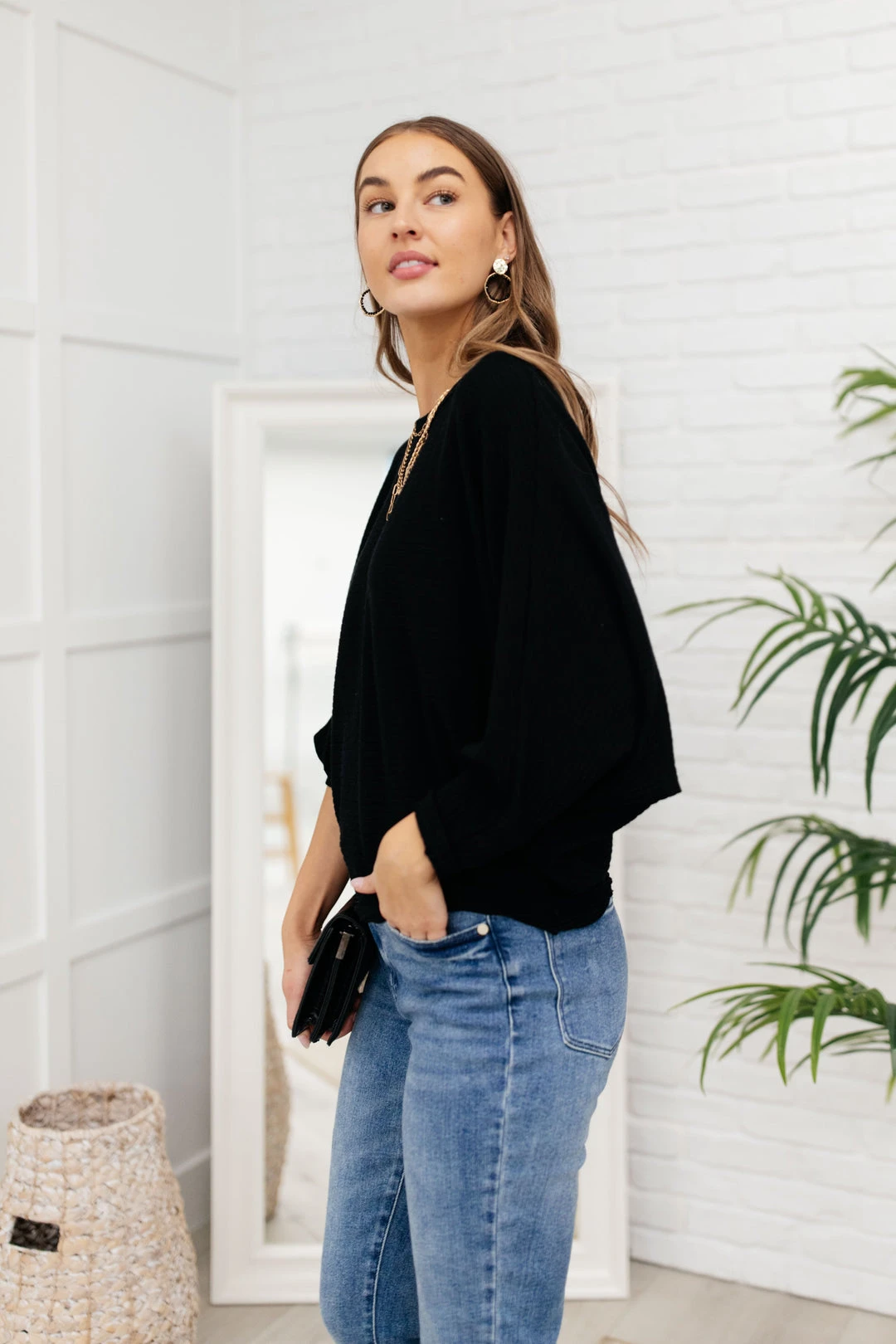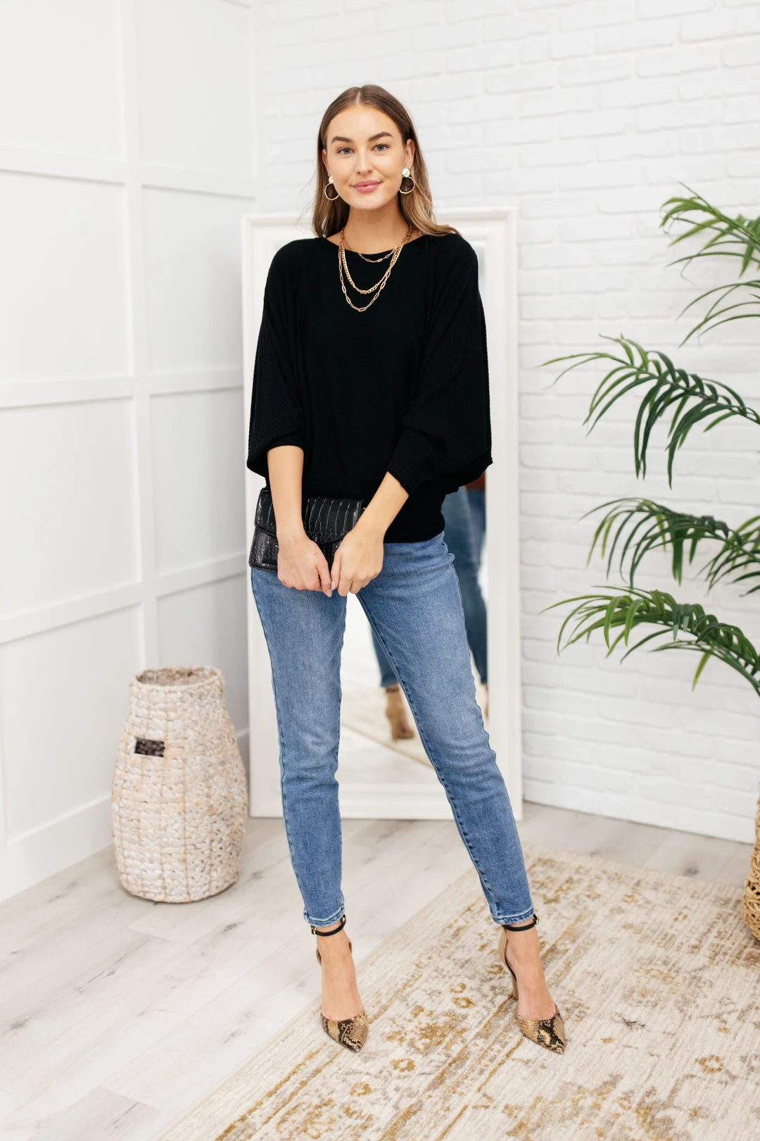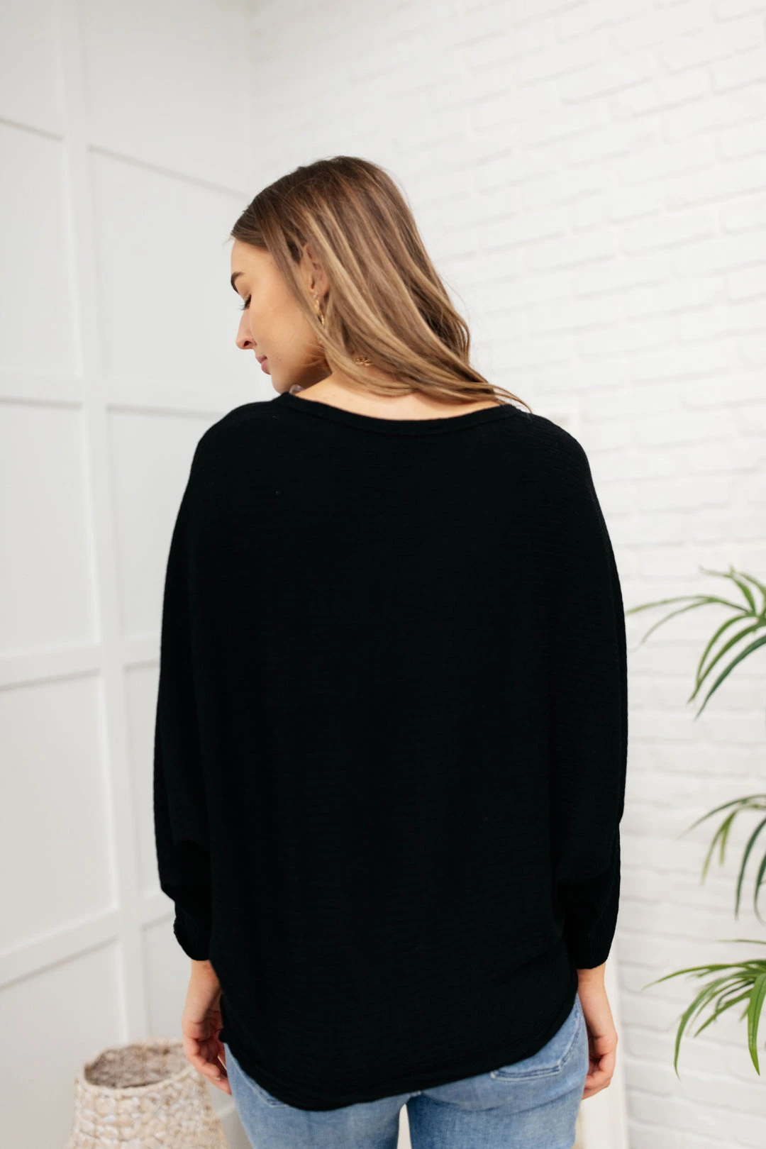 When the chilly winds roll in, you can find us bundled up in the Flying Free Top. The stretchy ribbed knit material creates a wide boat neck and a boxy bodice. We’re in love with the dolman sleeves and extra fitted cuffs as well!
