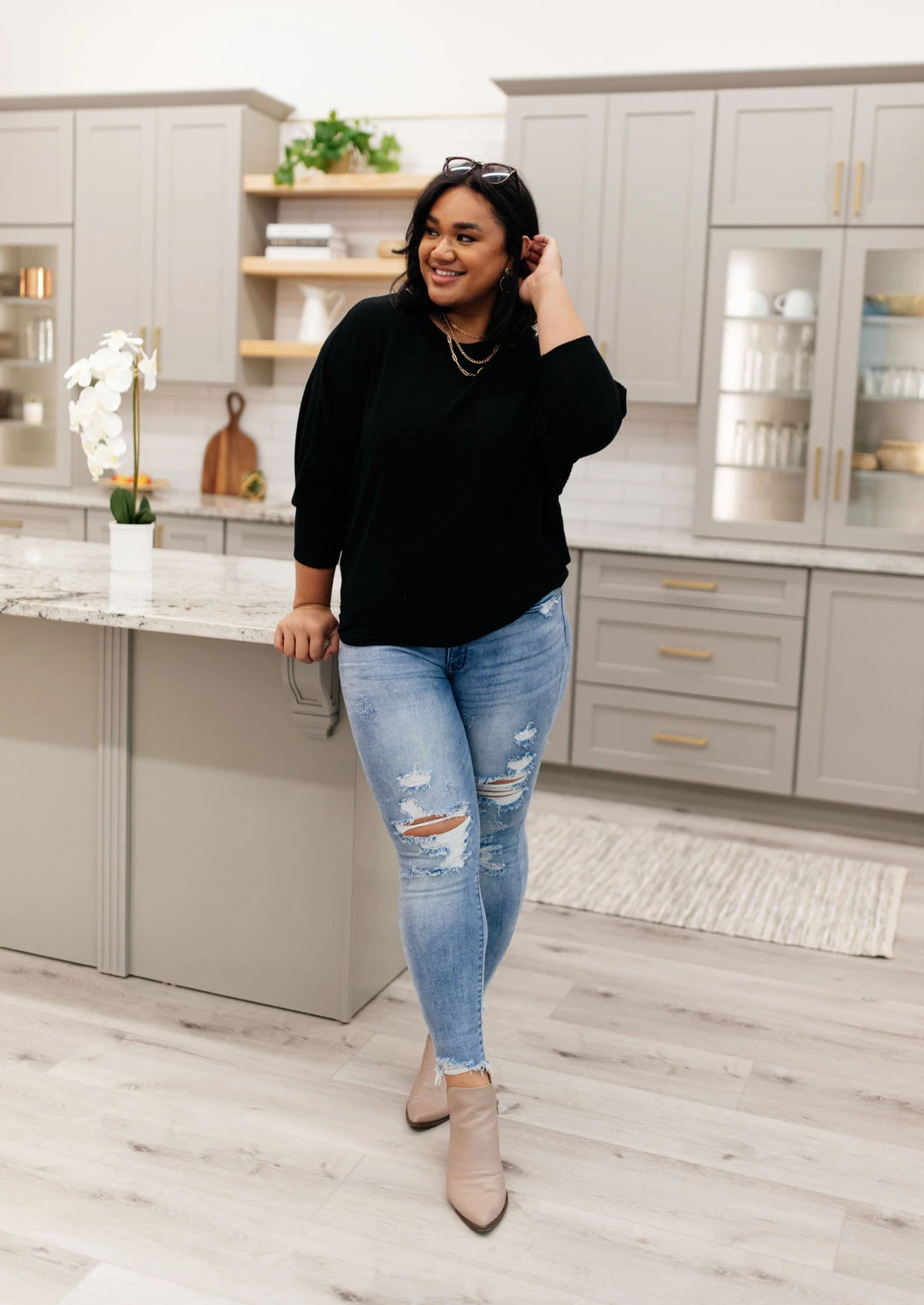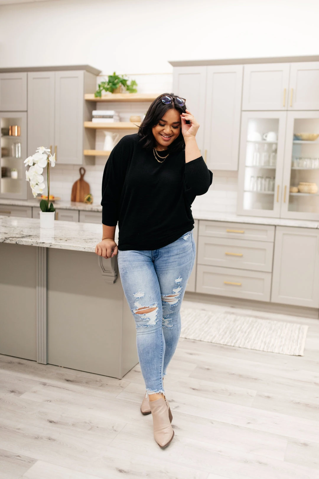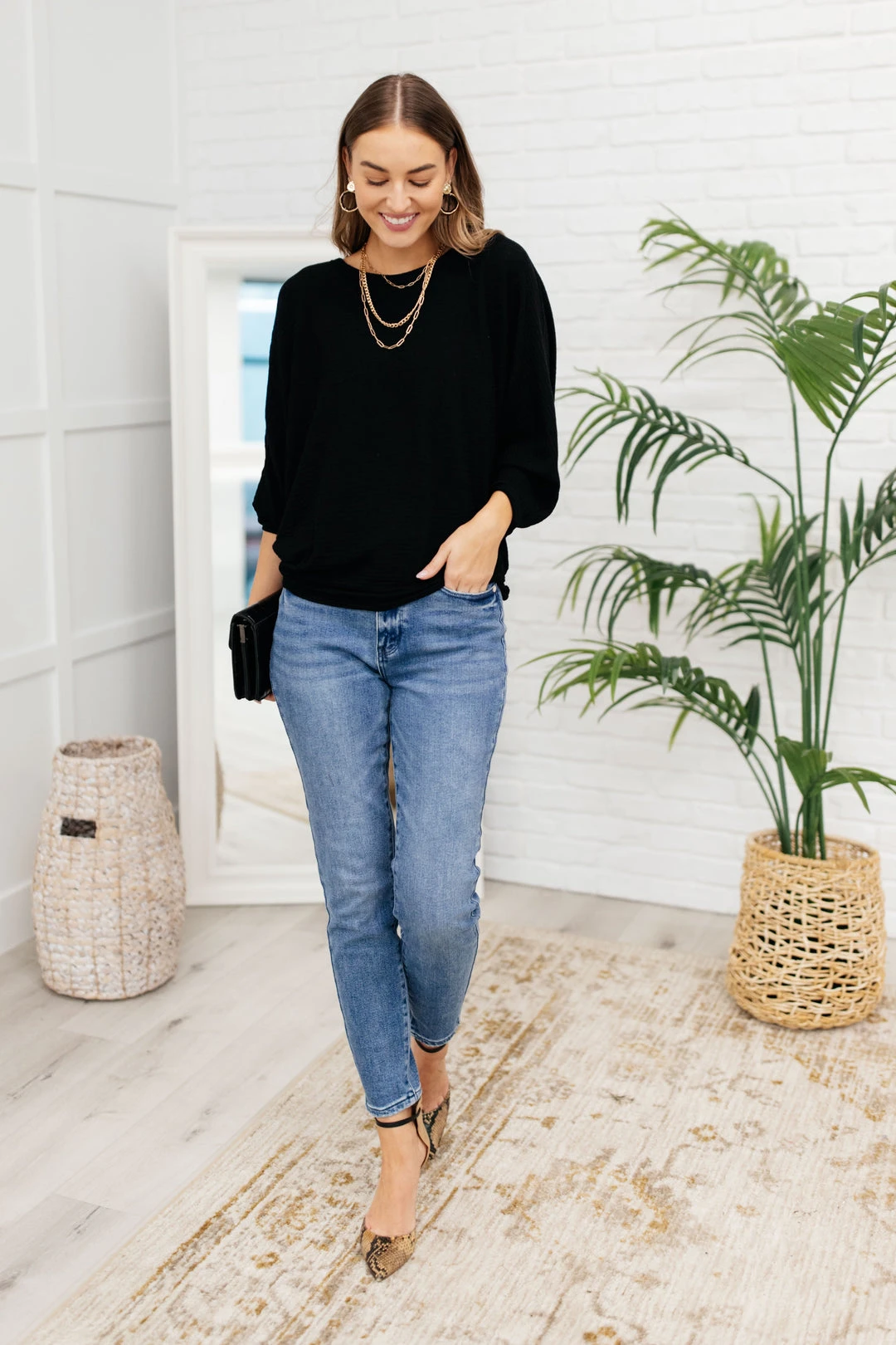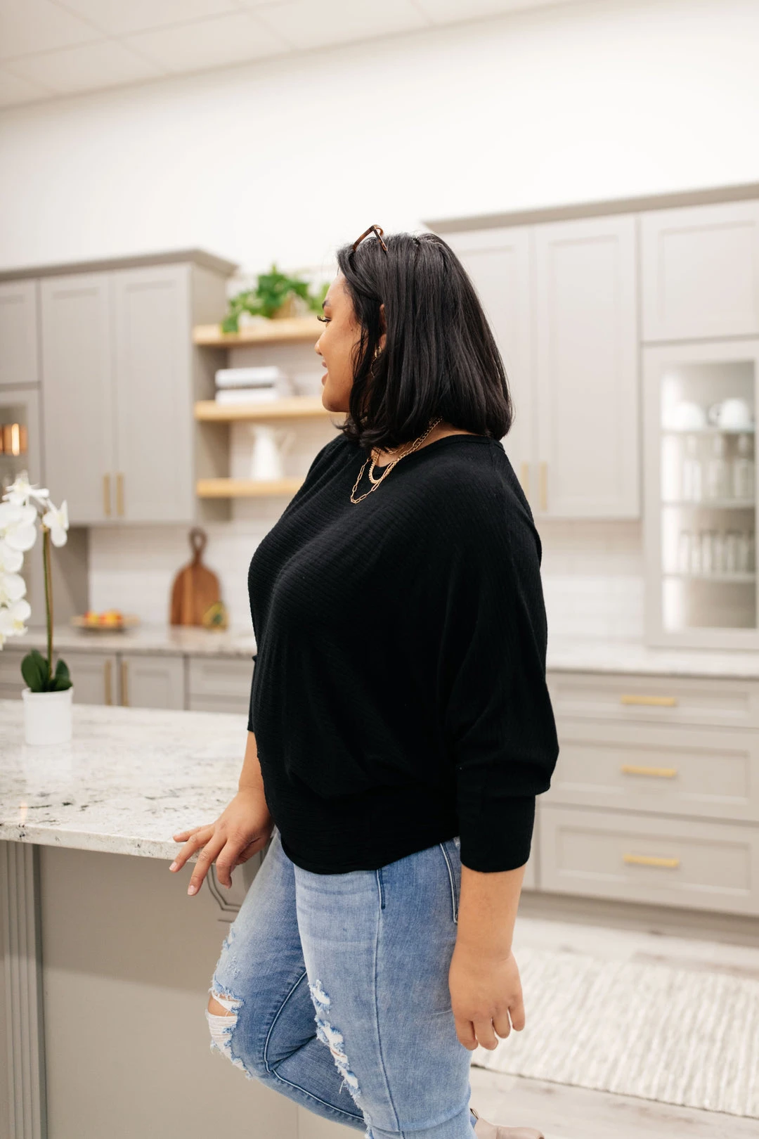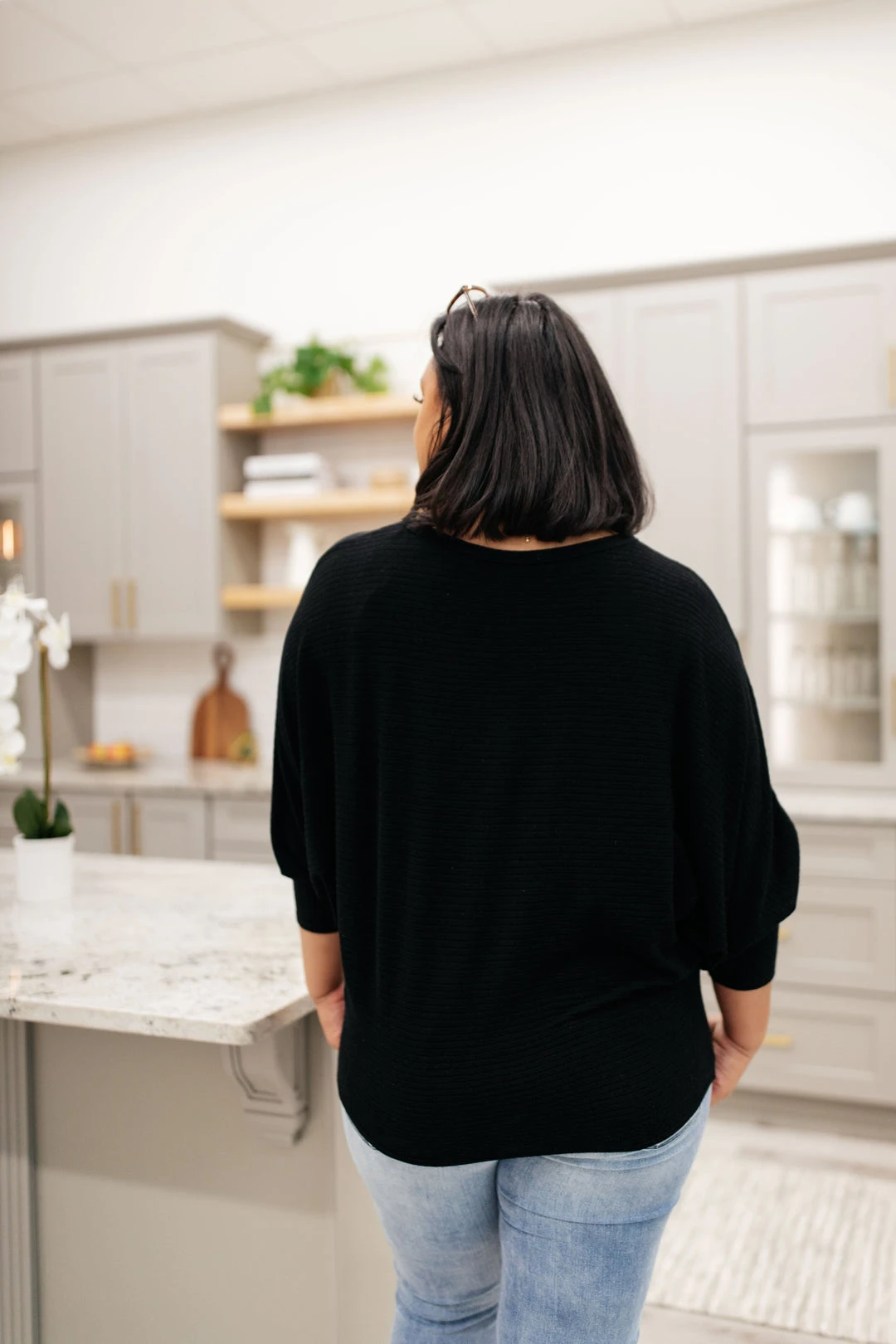 When the chilly winds roll in, you can find us bundled up in the Flying Free Top. The stretchy ribbed knit material creates a wide boat neck and a boxy bodice. We’re in love with the dolman sleeves and extra fitted cuffs as well!