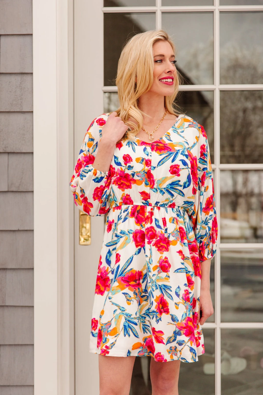 The Found My Forever Dress is a recipe for happiness! This lightweight flowy dress features a pink and red floral print all over, shaping a v-neckline, elastic waistline, and dolman sleeves with elastic cuffs. This adorable dress looks so cute paired with off-white heels and a matching bag!