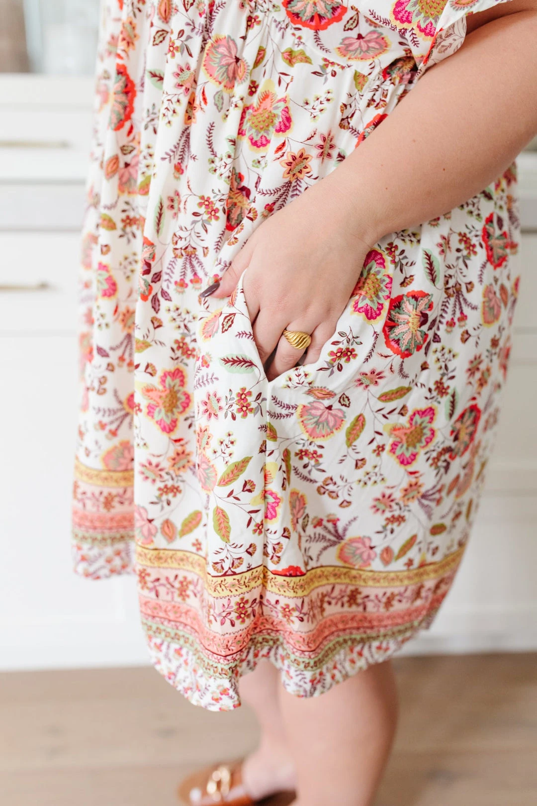 Roam wild in the Free Spirit Sun Dress! This bohemian chic piece features a v-neckline, dolman short sleeves, side seam pockets, and babydoll style silhouette. A boho floral print paints this perfect dress all over. Pair with white sandals and a bag or dress down with sneakers and a denim jacket!