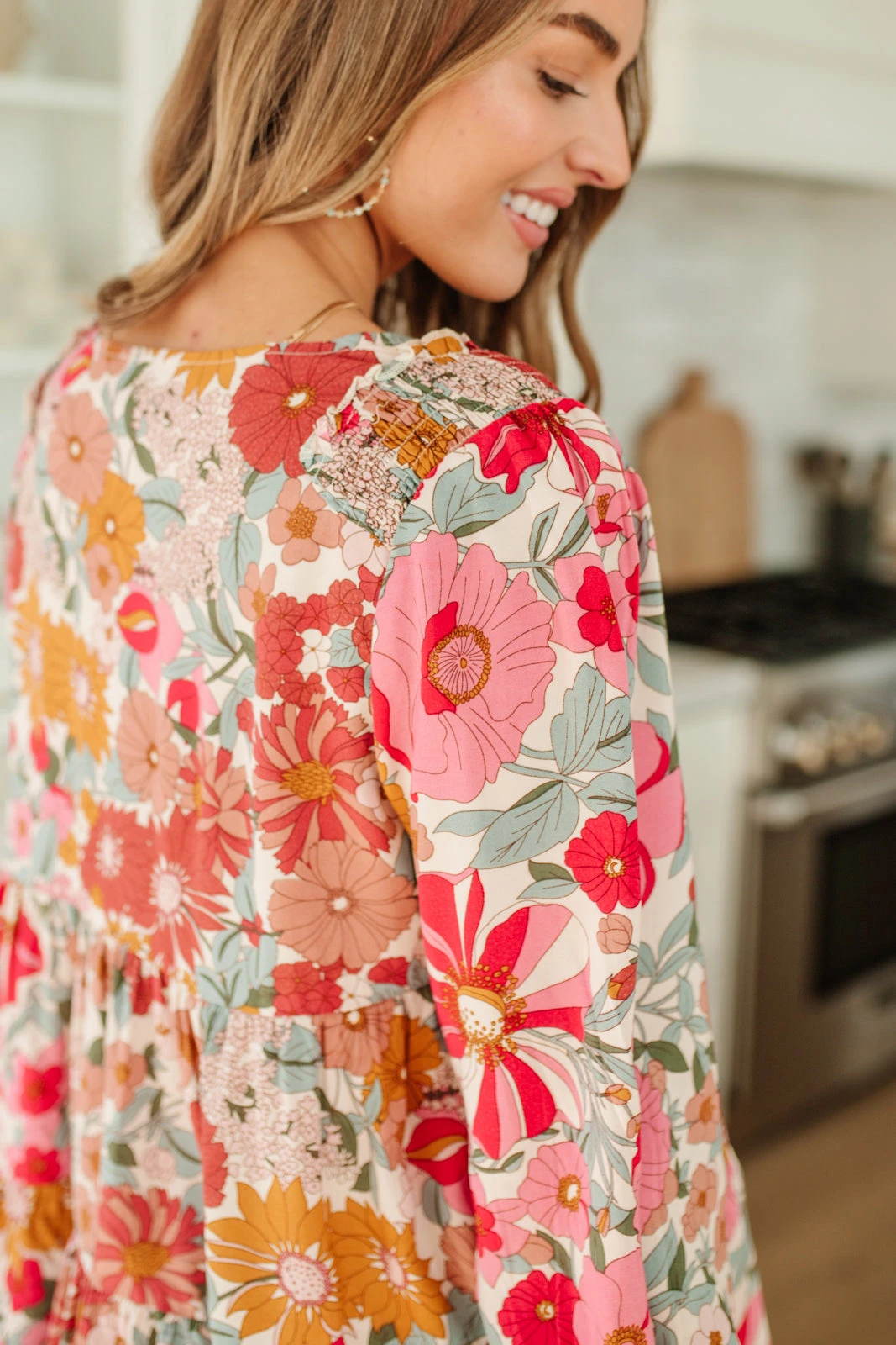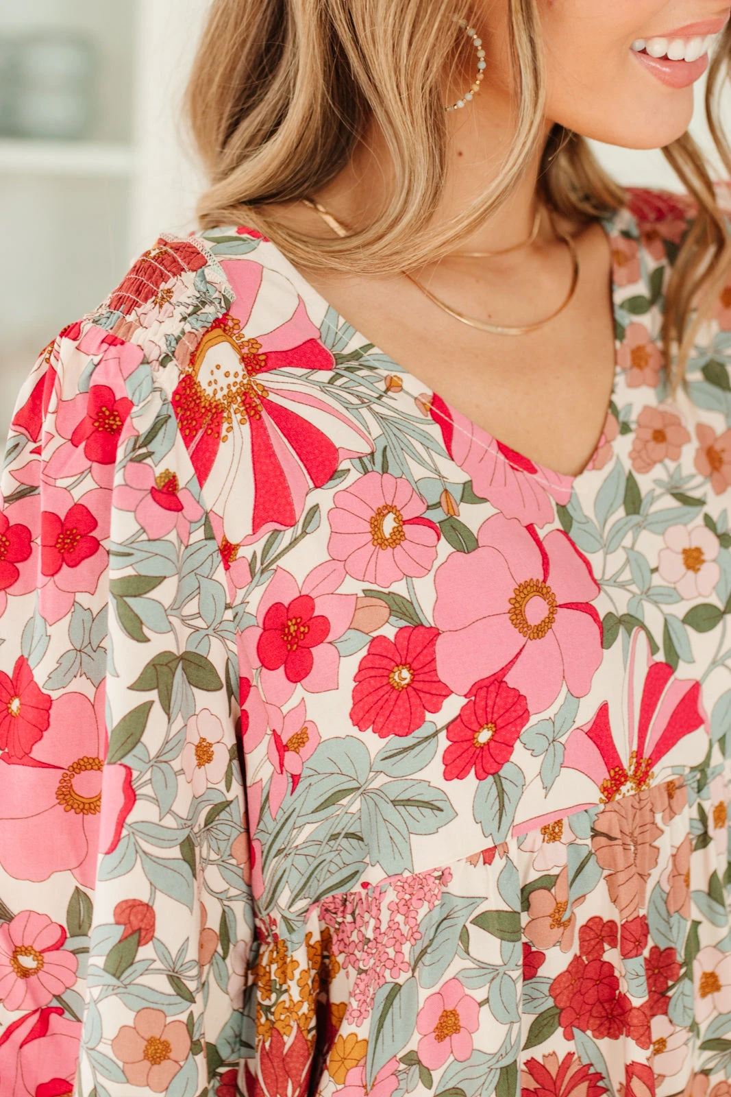 Keywords: Floral, Pink, Tiered, Balloon Sleeve