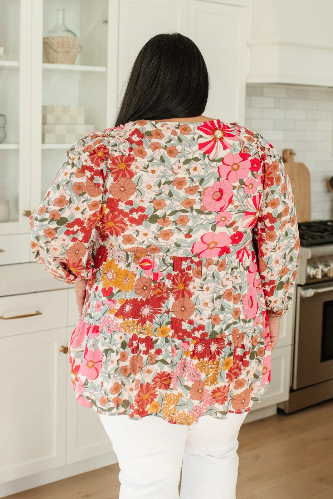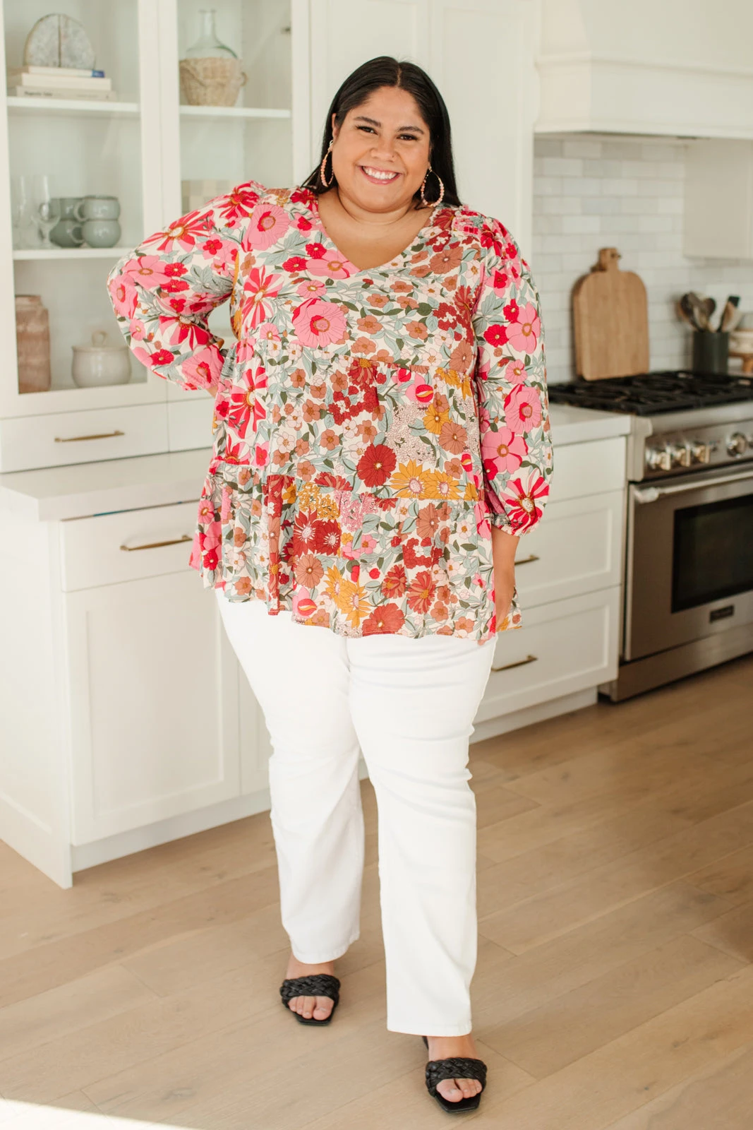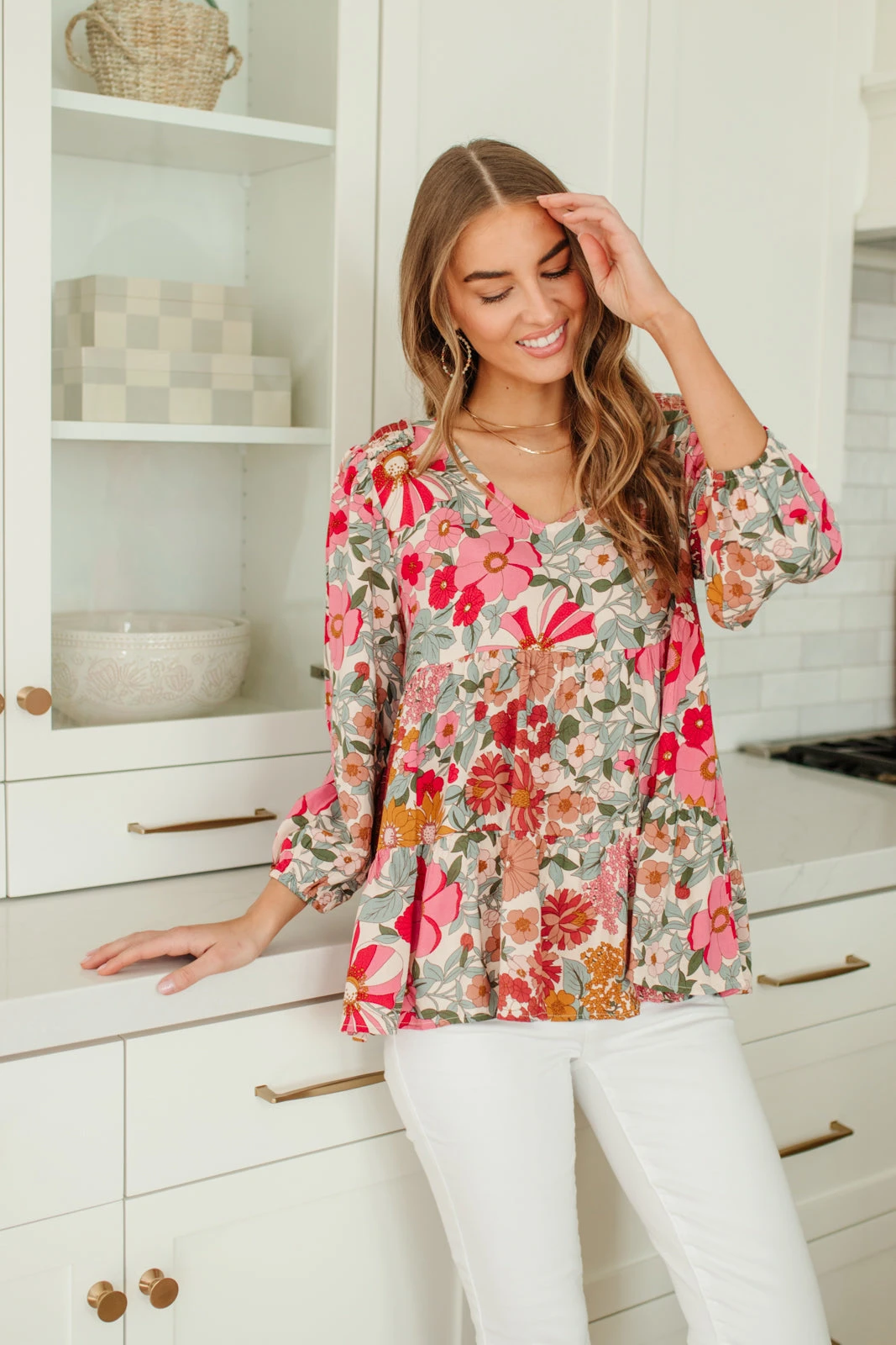 You’re going to fall in love with all the details on the Full Bloom Top! A lightweight fabric painted in a darling floral print, shapes a v-neckline, three-quarter balloon sleeve, and shirred tiered bodice. This transitional top will look adorable with white jeans and nude sandals!