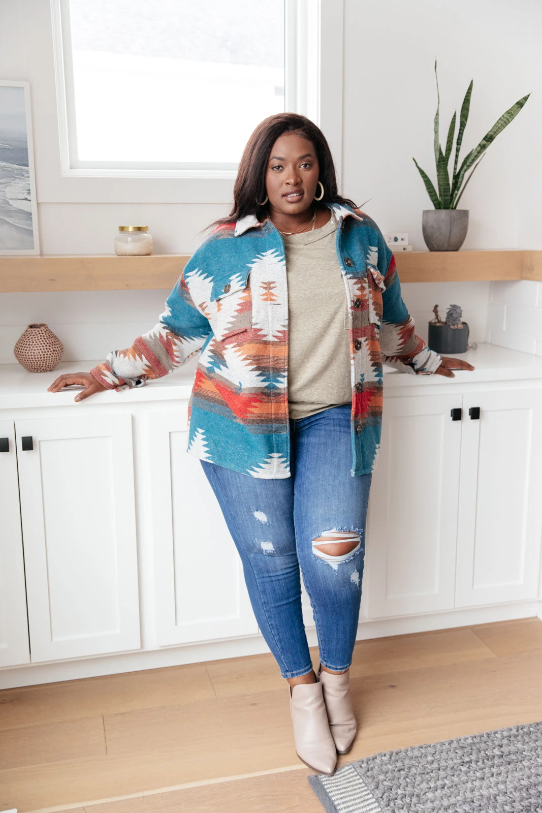 Venture in style in our Geo Sands Jacket. This jacket features two fully functional front pockets, button up front, button cuffs, and collared neckline. This jacket will keep you warm and cozy all while elevating your outfit. We love this layered over a tee or crewneck, or button it up and leave as is!