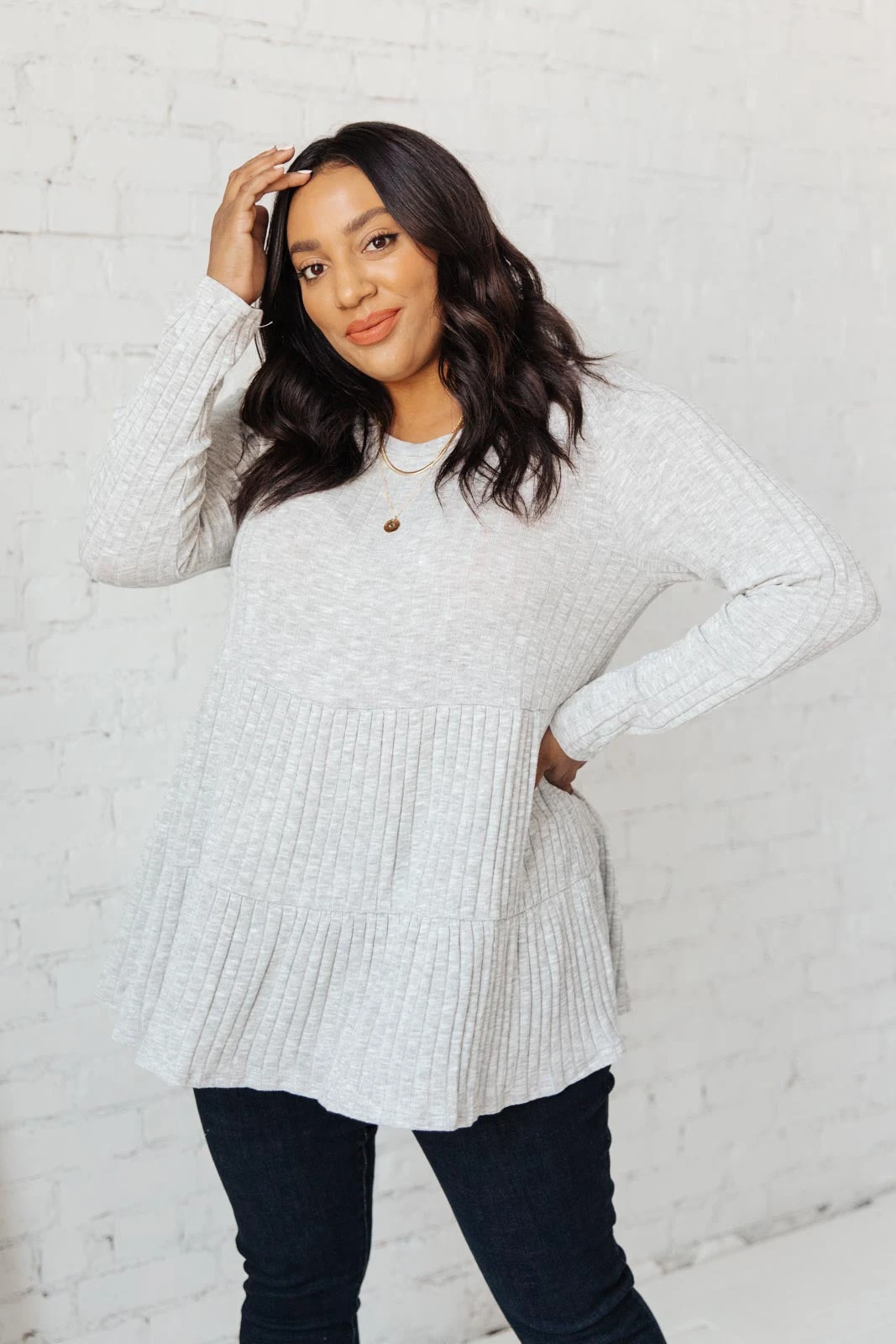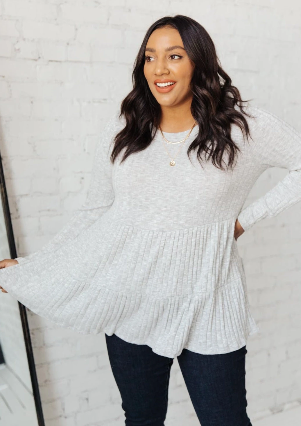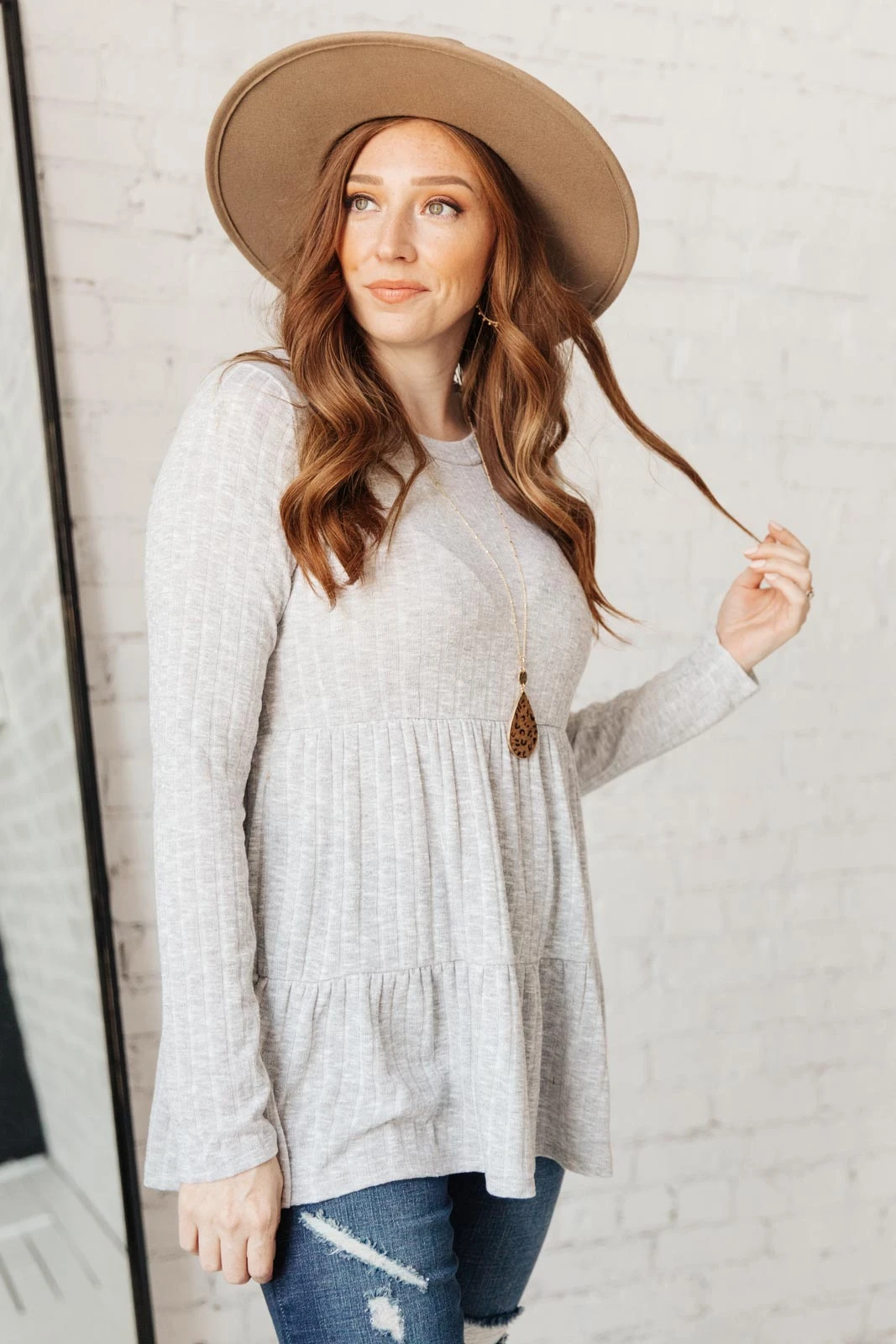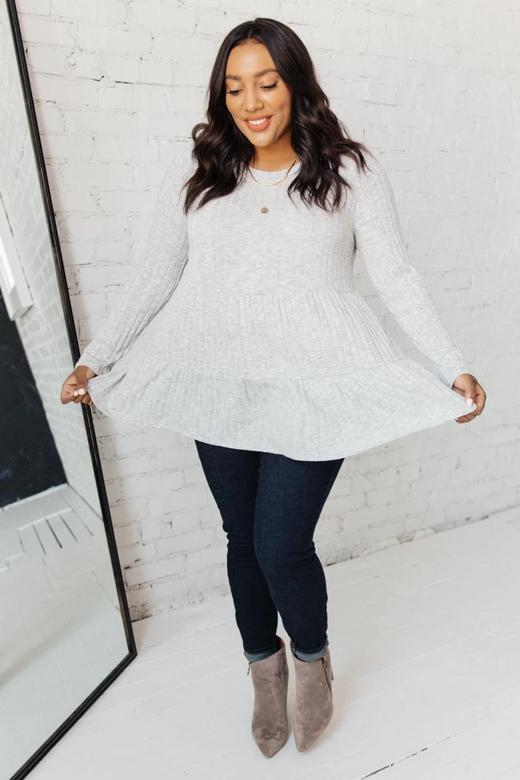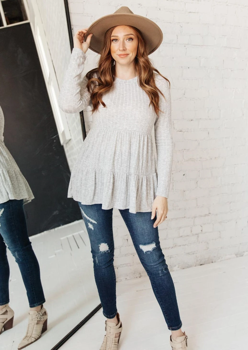 Keywords: Gray Top, Long Sleeve Top, Tiered Top, Gray Sweater, Fall