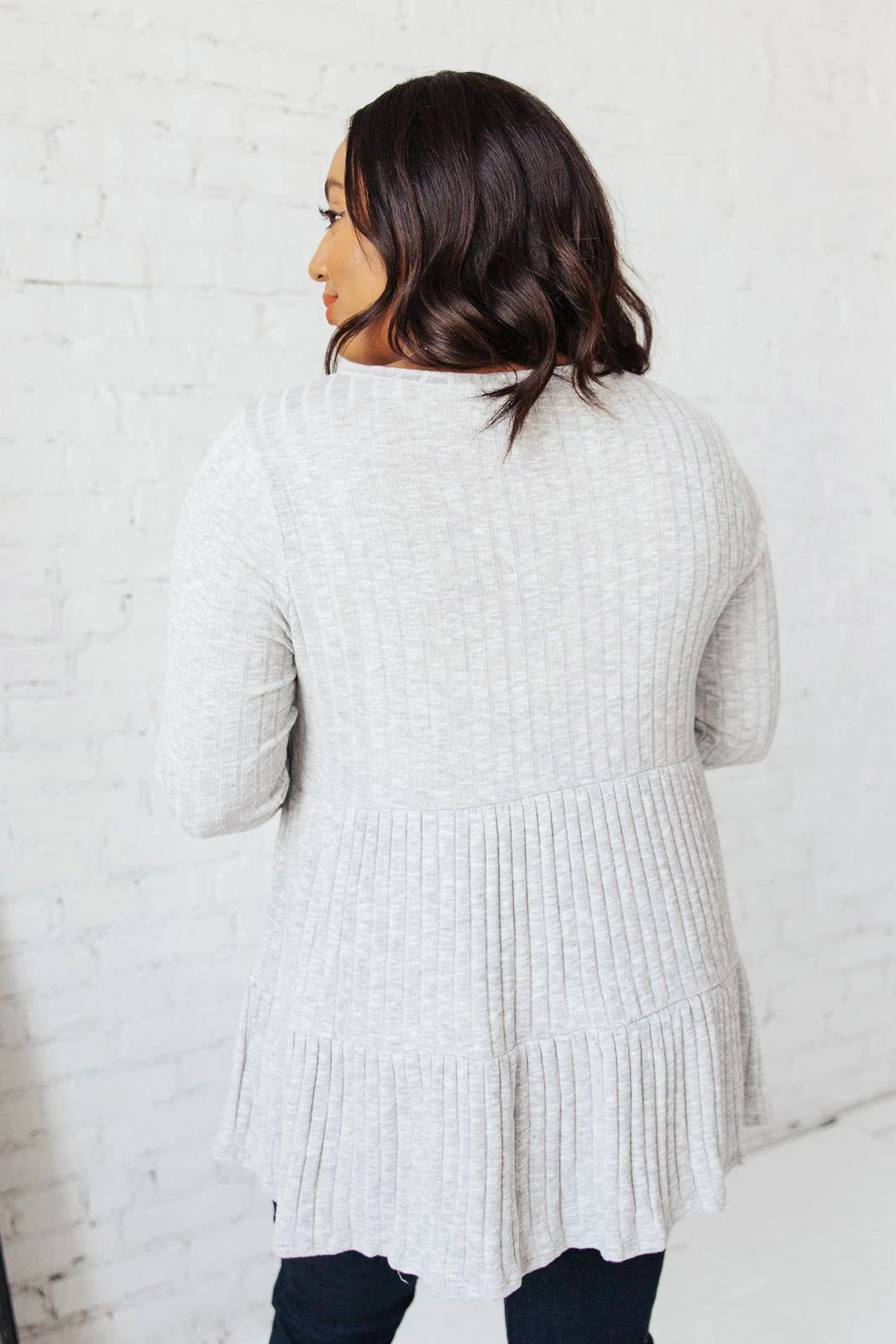 The Give A Twirl Sweater is made up of tiers of super soft gray fabric. This sweater has a beautiful flowy silhouette and fitted sleeves. Pair it with jeans and a fall jacket.