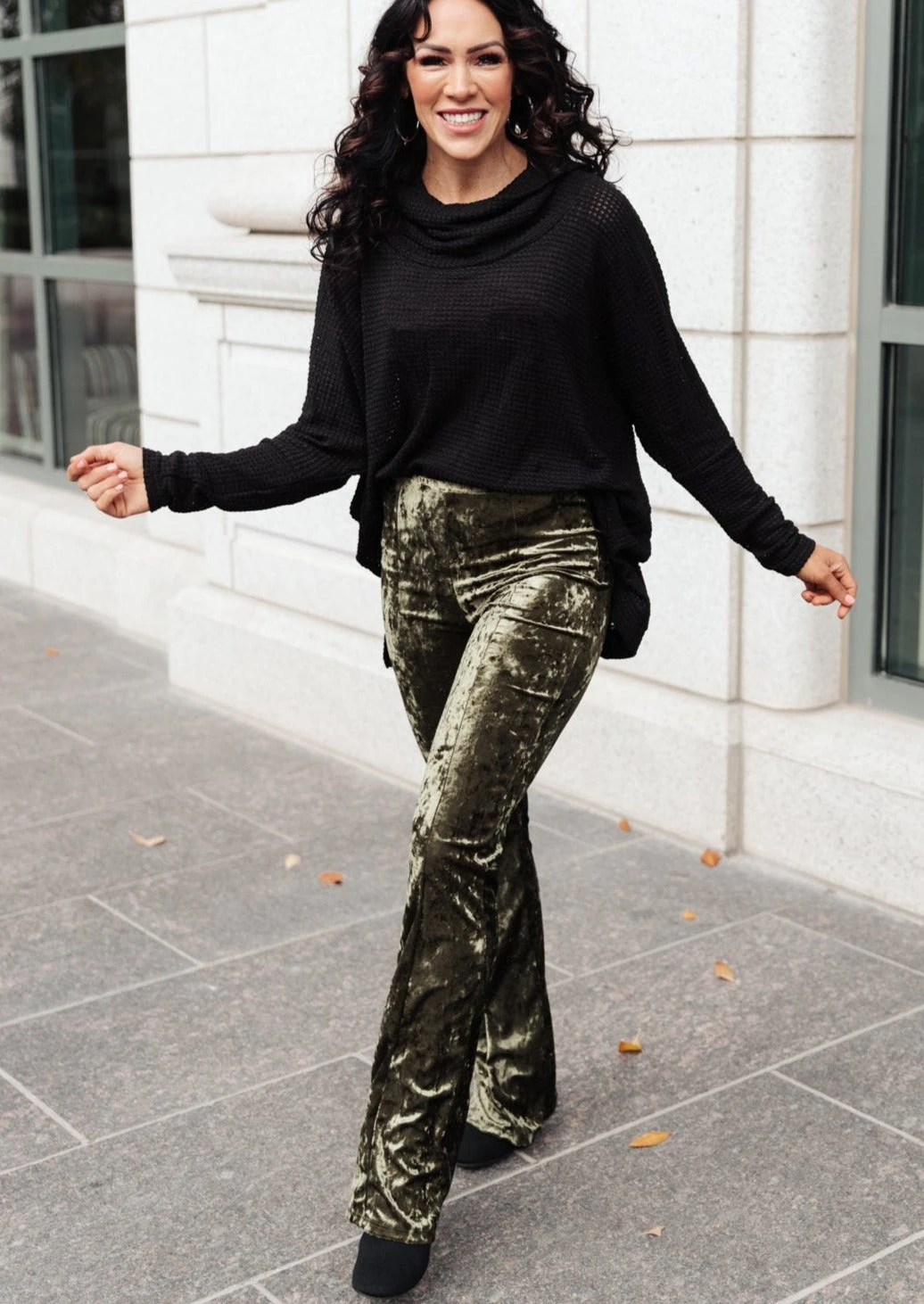 It’s the most wonderful time of the year and these olive colored crushed velvet wide-leg pants are perfect to celebrate in! These velvet pants have a flattering high-waisted fit, elastic waistband and full length flared pant legs. Throw on a cozy sweater over it or tuck in your favorite bodysuit!