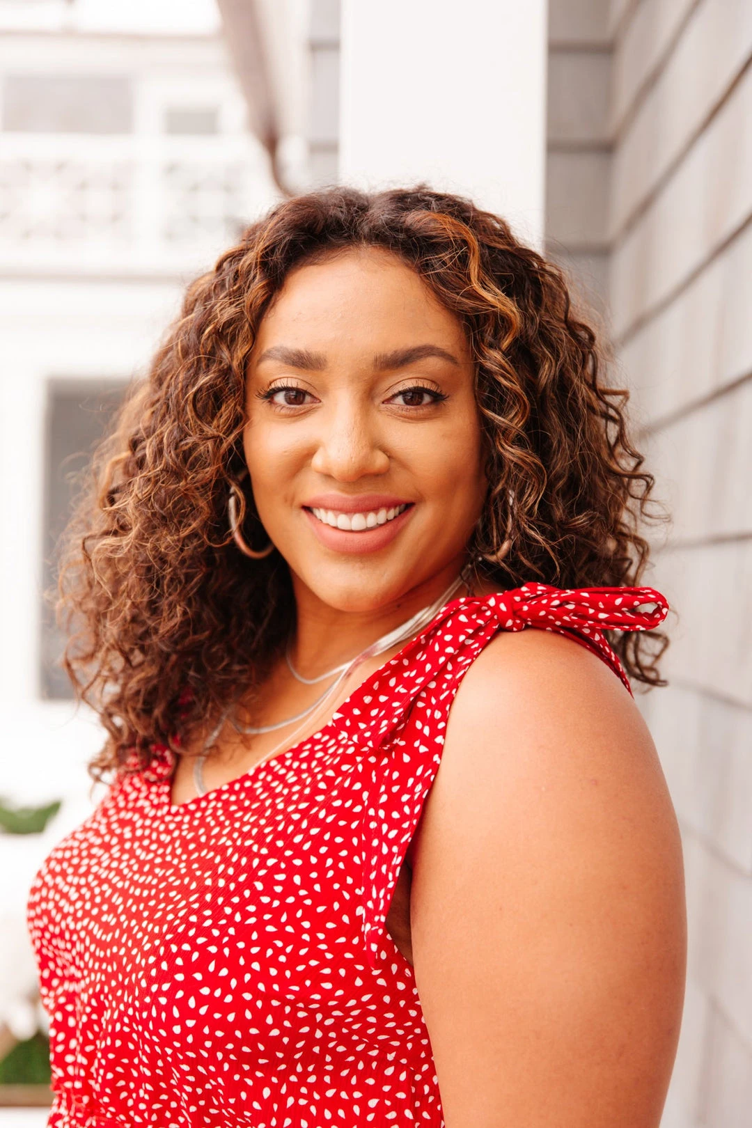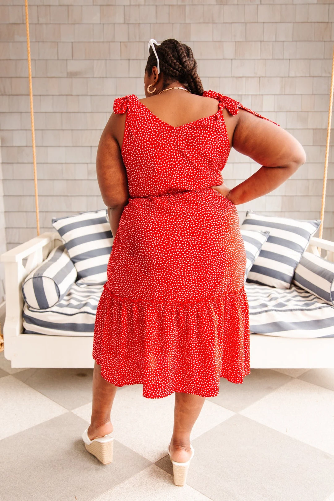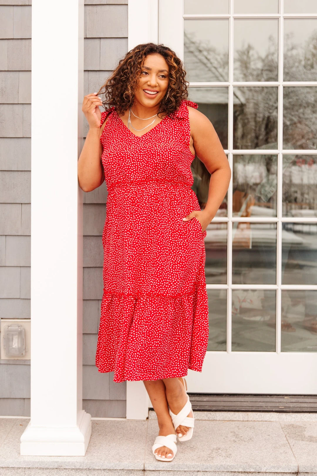 No one will be able to stop talking about this dress! The Heard About This Dress is stunning in a bold red and white polka dot print, that features a v-neckline, shoulder tie straps, and tiered midi skirt. Pair this with white heels, dainty gold jewelry, and a matching bag for a girly chic look!