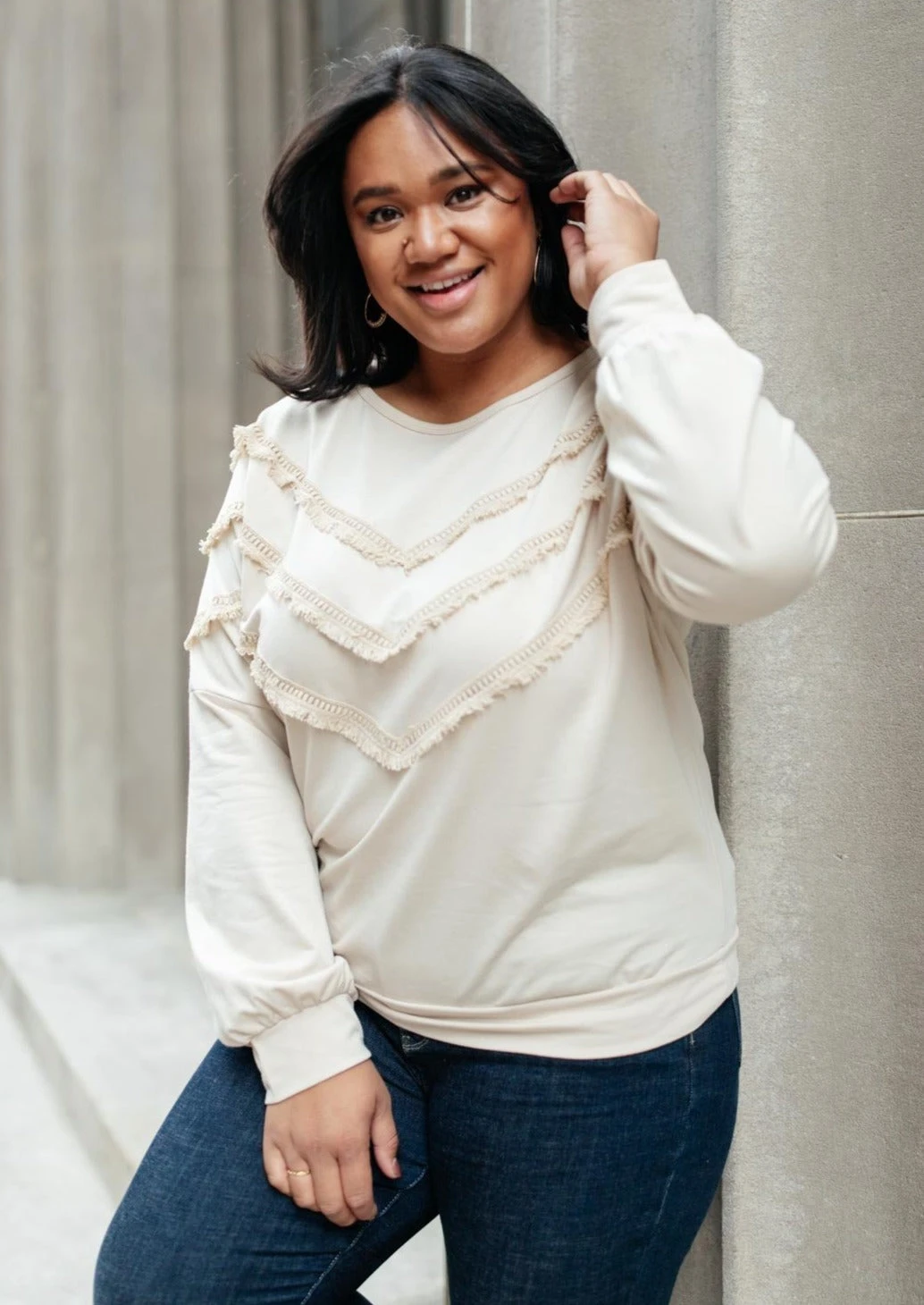 The Into The Fringe Top is one of our newest faves because it fits and feels like a comfy pullover sweatshirt, but has the cutest fringe details! This top is a unique statement piece and looks incredible when paired with statement earrings and a hat.