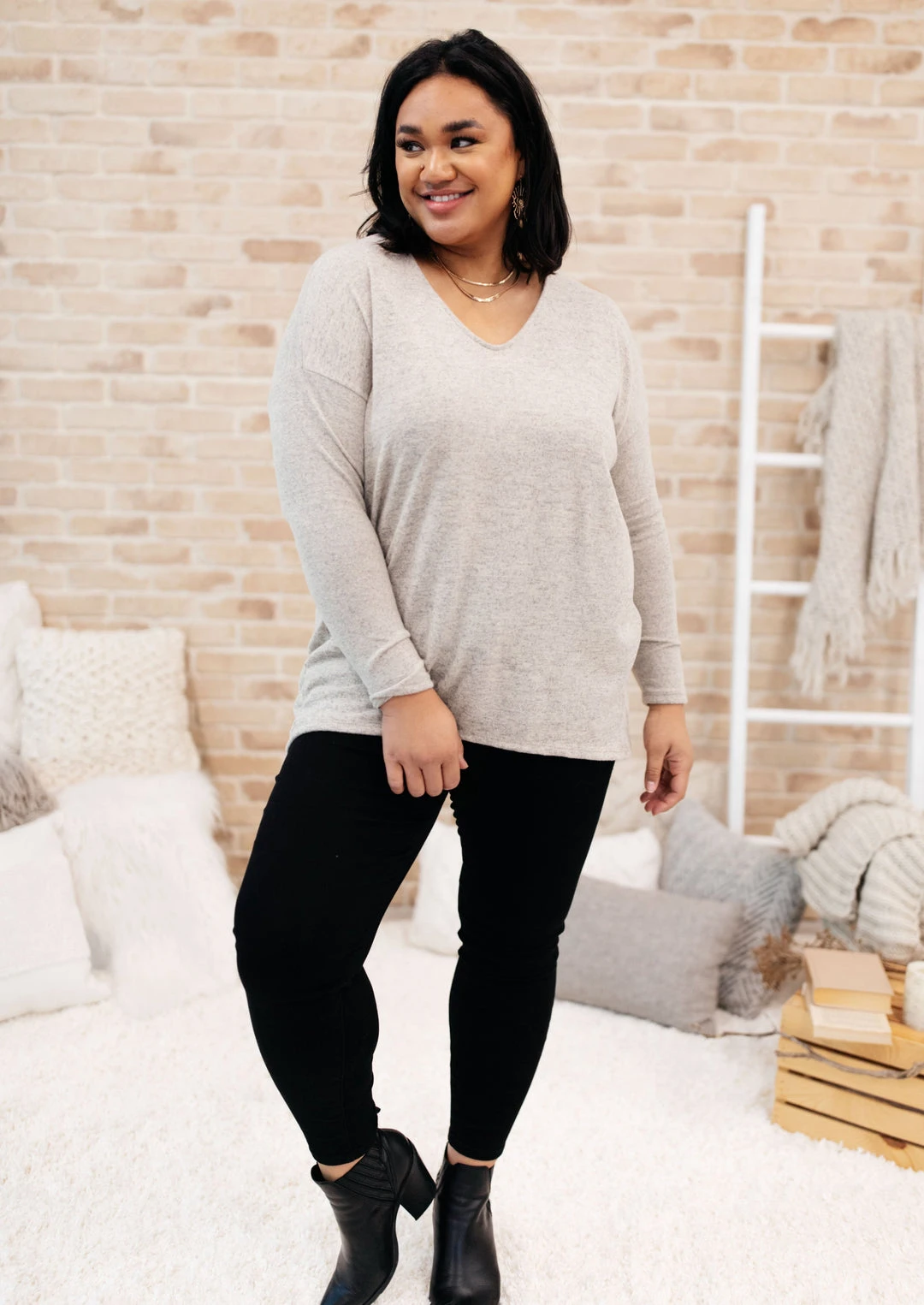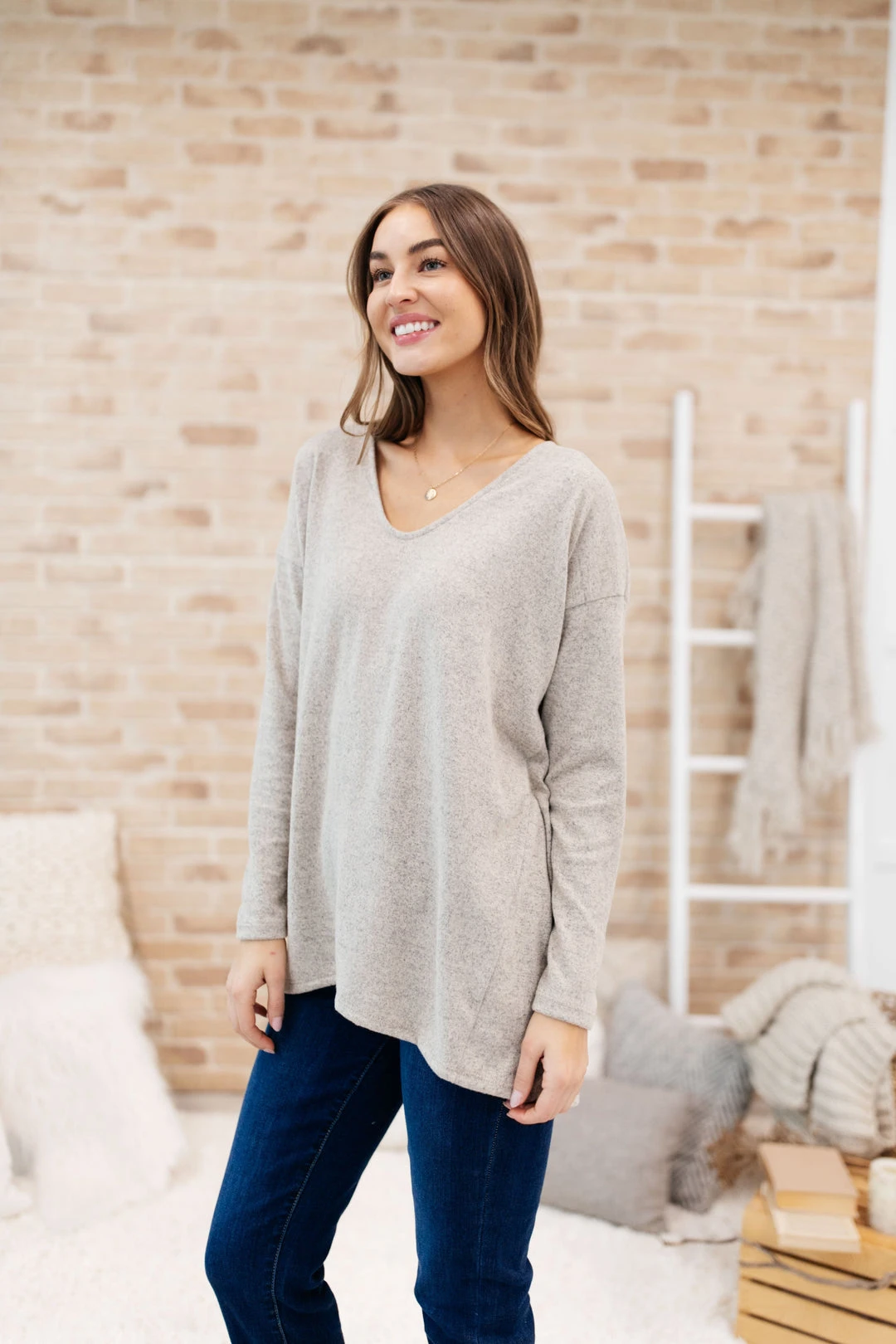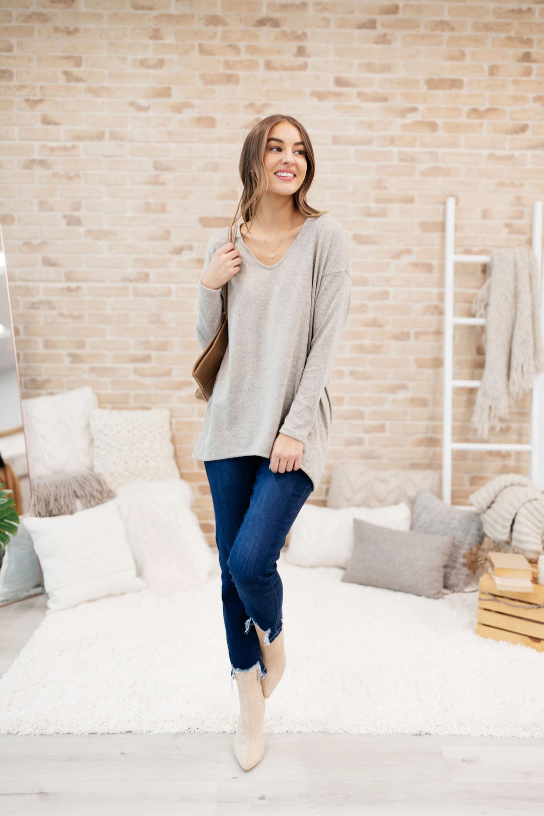 Keywords: Long Sleeve Top, Beige Top, Tan Top, Relaxed Top