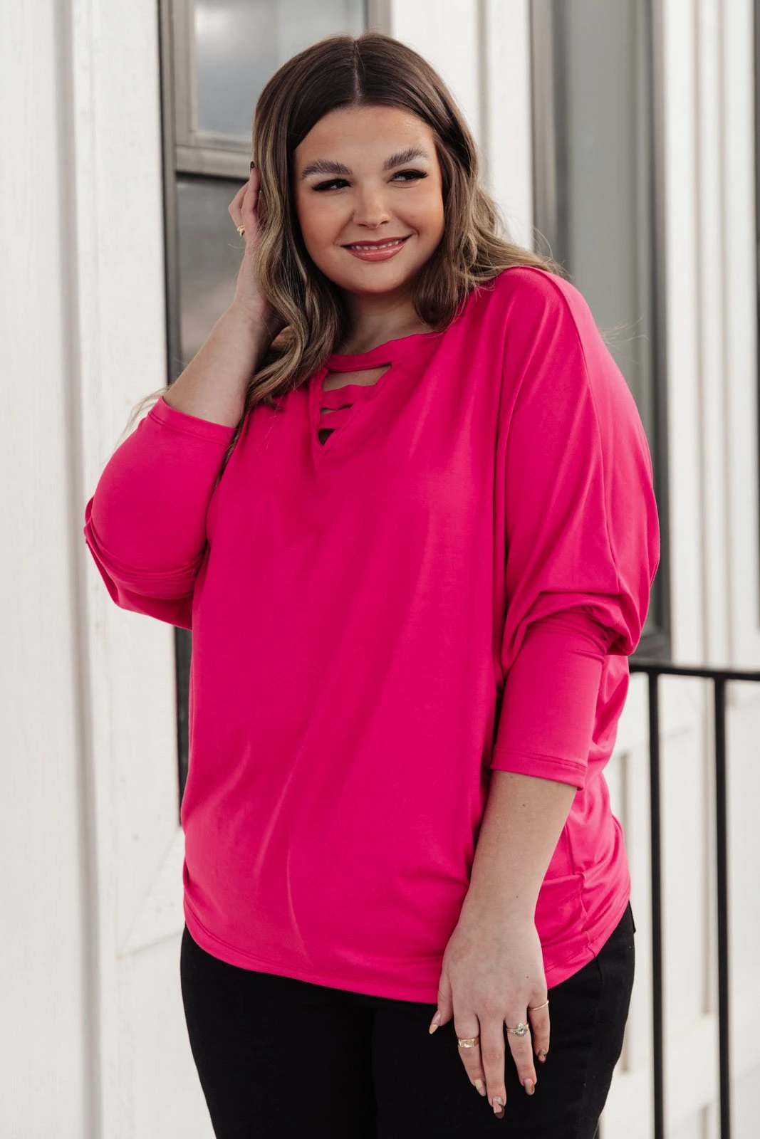 A pop of color does a body good! We love the fun vibe this adorable fuschia pink dolman top has. The ladder neck detail, soft stretchy fabric & full-saturation color makes this your coziest statement top yet. Pair with your favorite skinnies and leggings and you’re unstoppable!