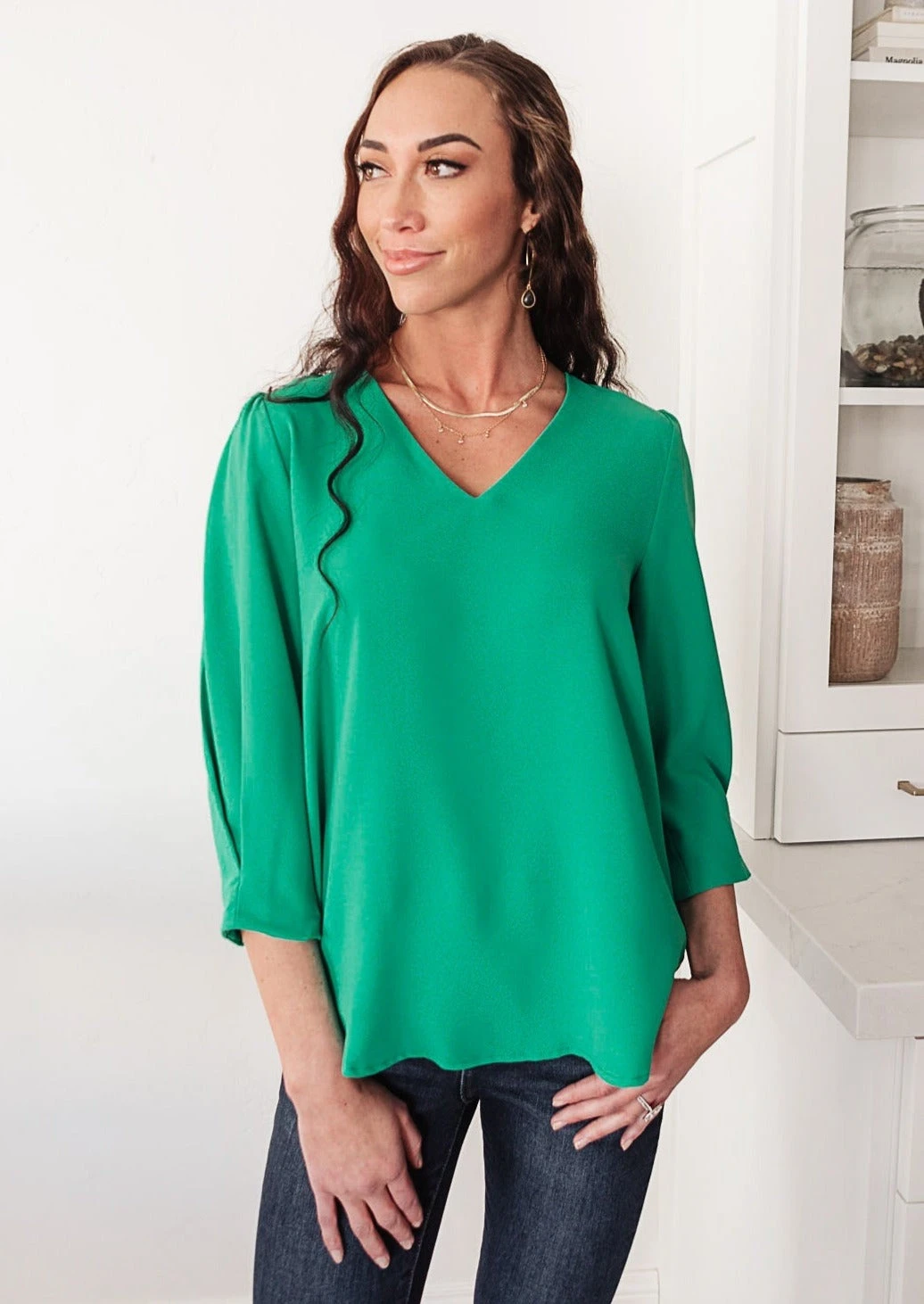 Keywords: Green Top, V-Neck, Balloon Sleeve,
