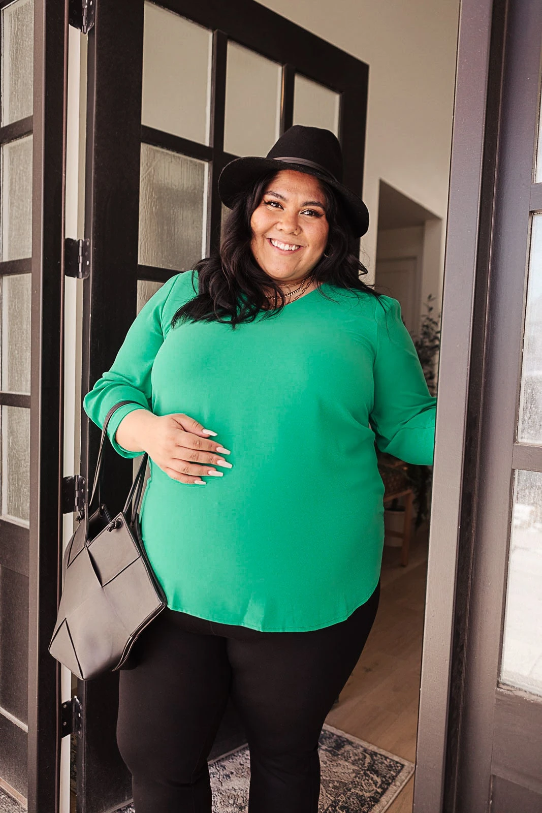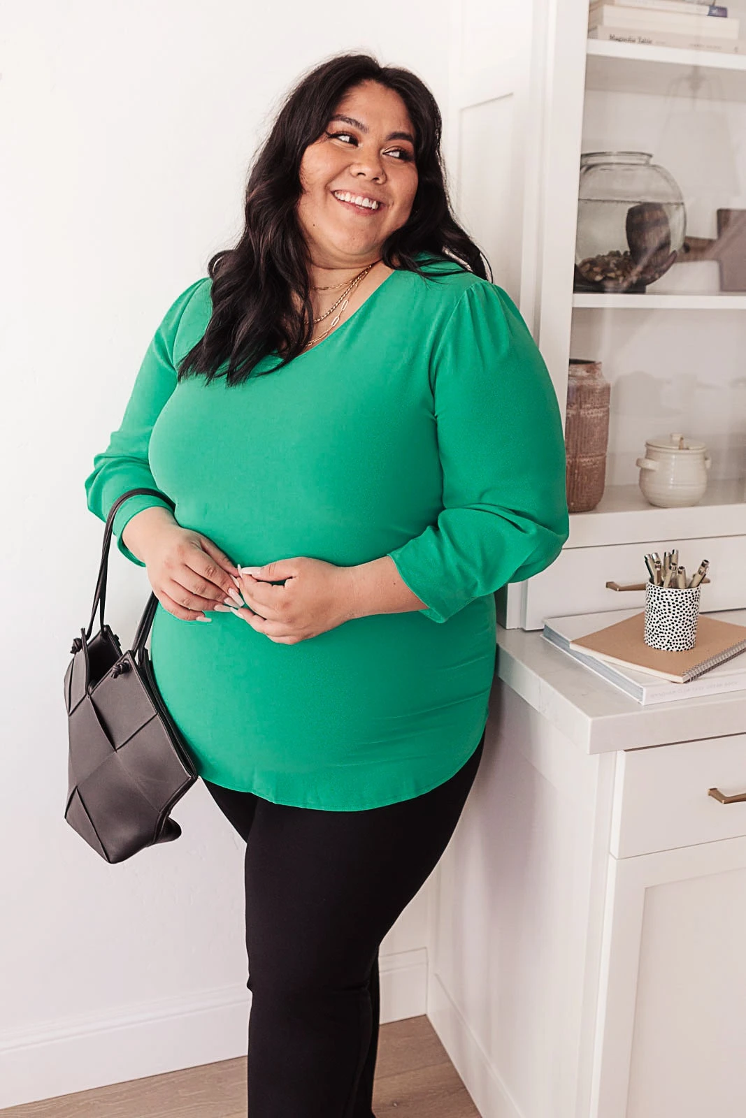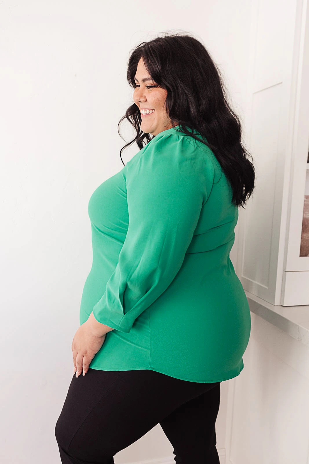It’s easy to look put together in our Lucky Chic Top. This Top features a deep v-neckline and three-quarter sleeve that slightly gathers at the shoulder creating a beautiful balloon effect with a rounded hemline. The cuff of the sleeve also has a pleated detail that dresses up this simple yet stunning blouse. It is the perfect shade of green that will look good on anyone!