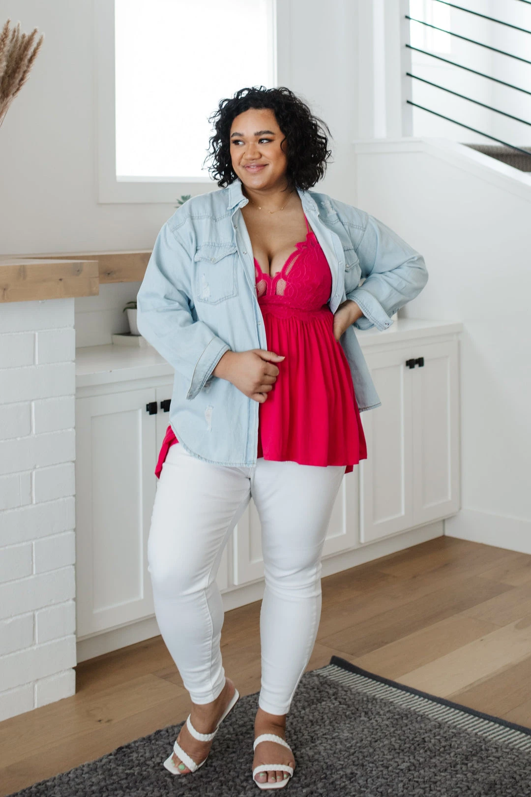 A whole new way to wear your favorite bralette! The Magic Touch Tank In Fuchsia is the most romantic little top, with its sheer crochet lace bodice, lined triangle cups, and high-low silhouette. Such a flowy, lightweight top perfect for those hot summer days! Pair with white jeans, and nude sandals for a complete look!