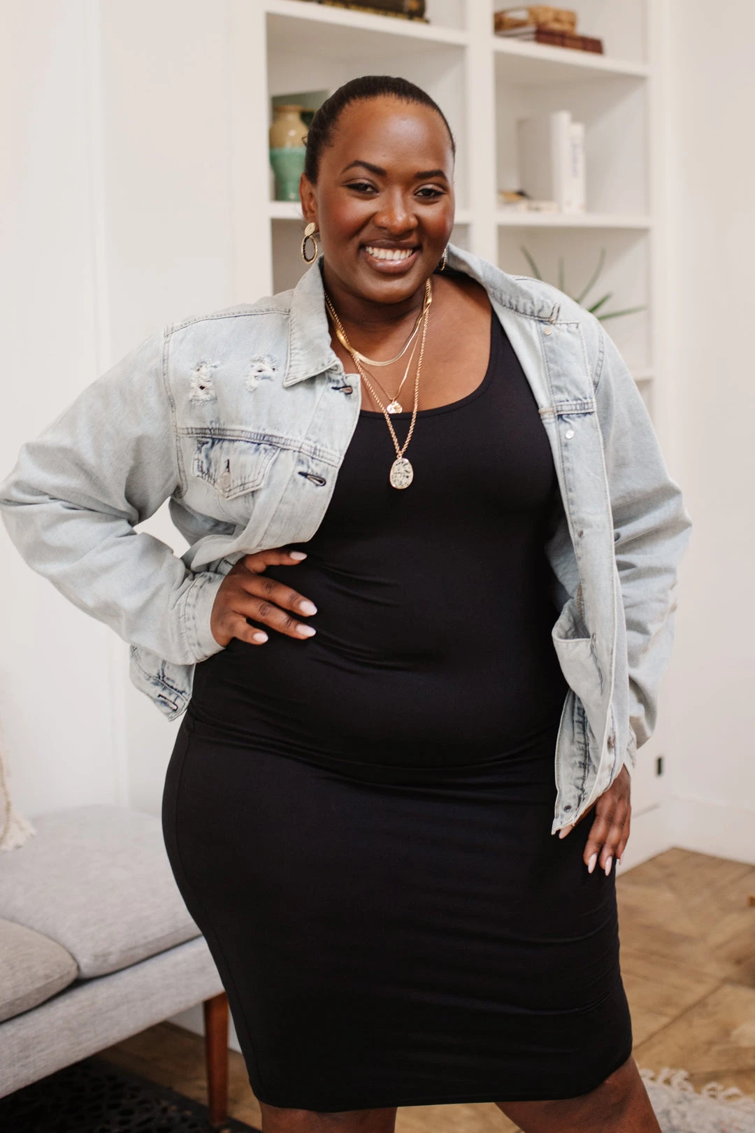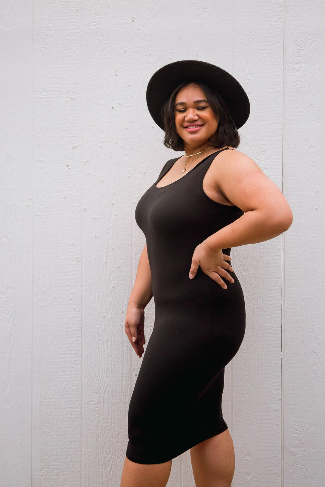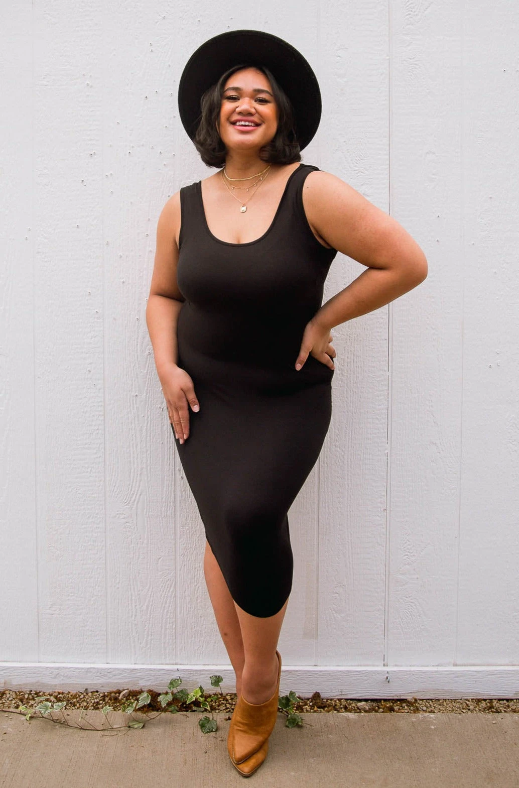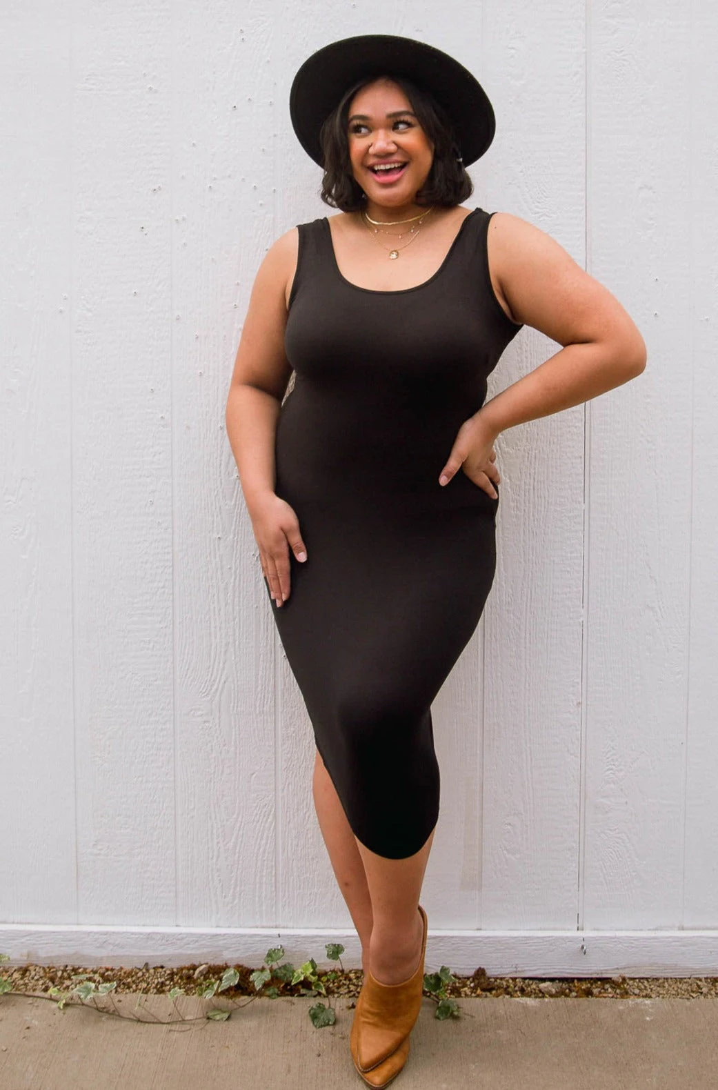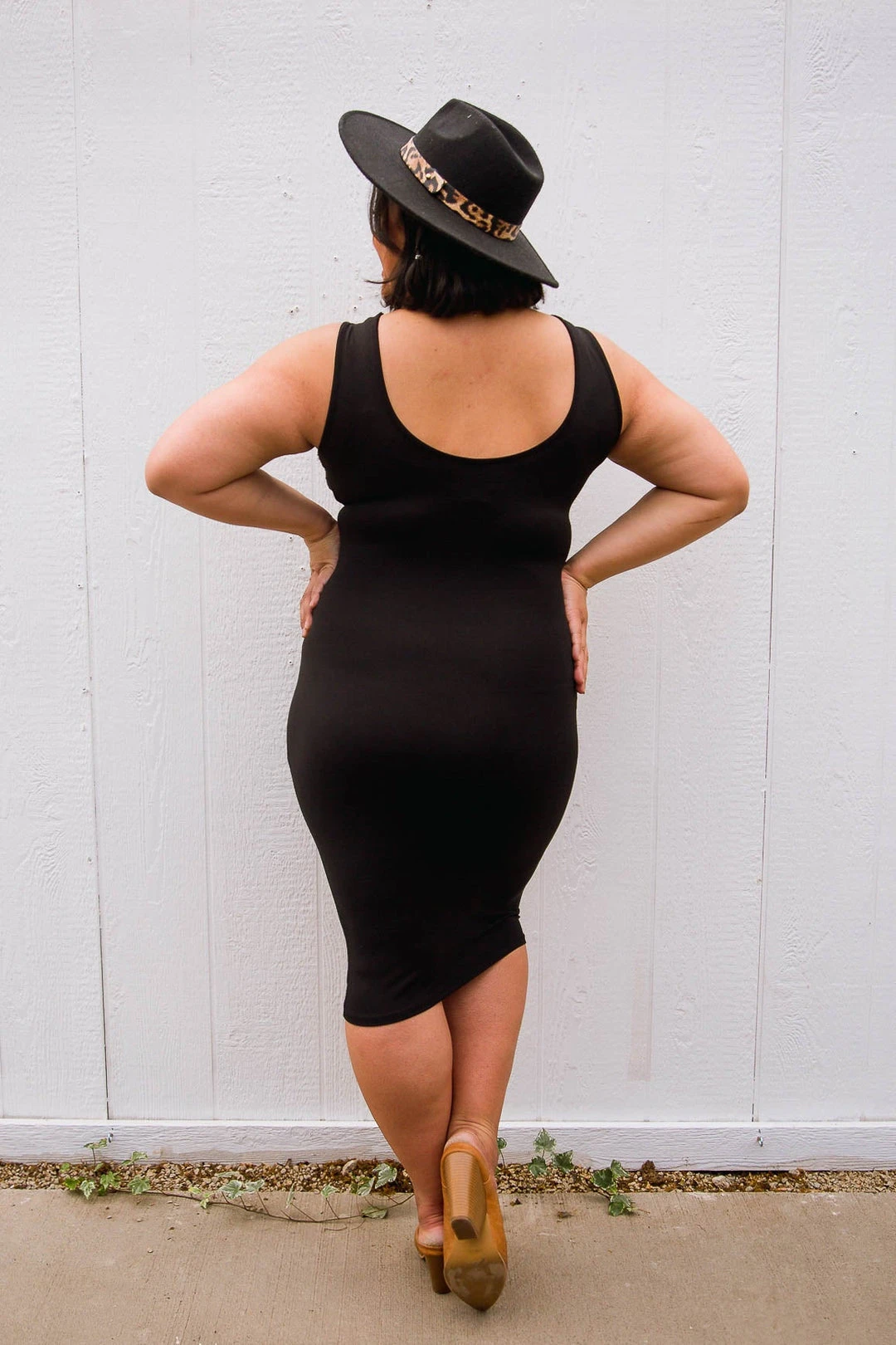Everyone needs a basic black dress in their wardrobe! Truly a piece you can never go wrong with. The Meet Me In The Middle Dress will become your new closet staple. Thanks to its classic tank design, sleeveless cut, midi length, and bodycon silhouette, feeling confident has never been easier!