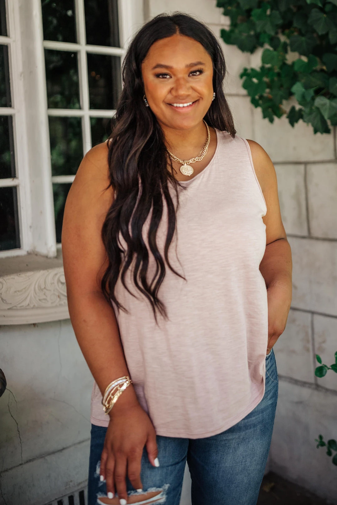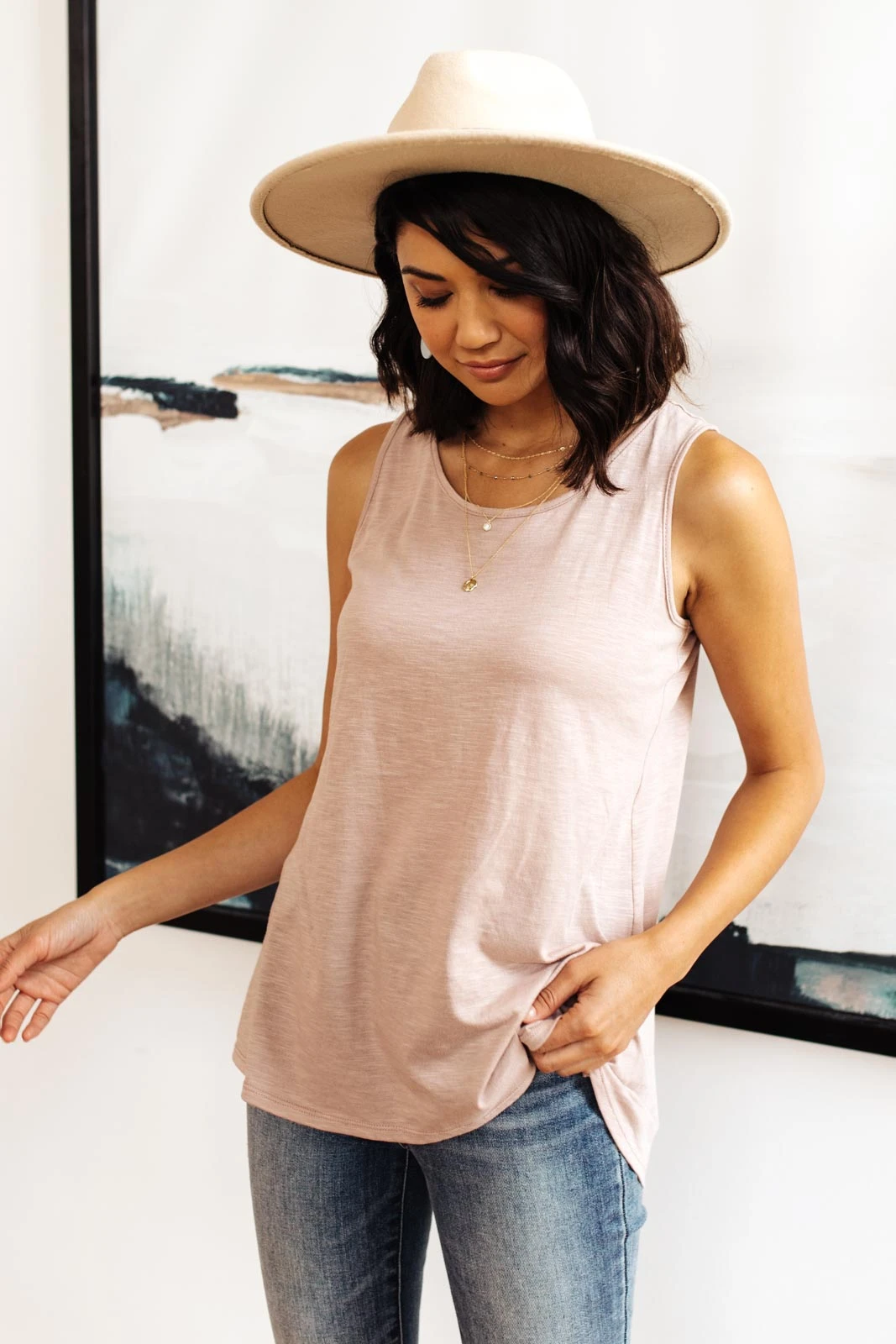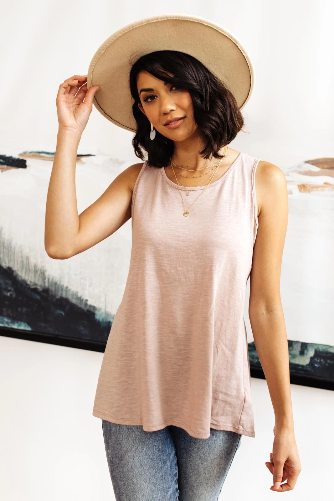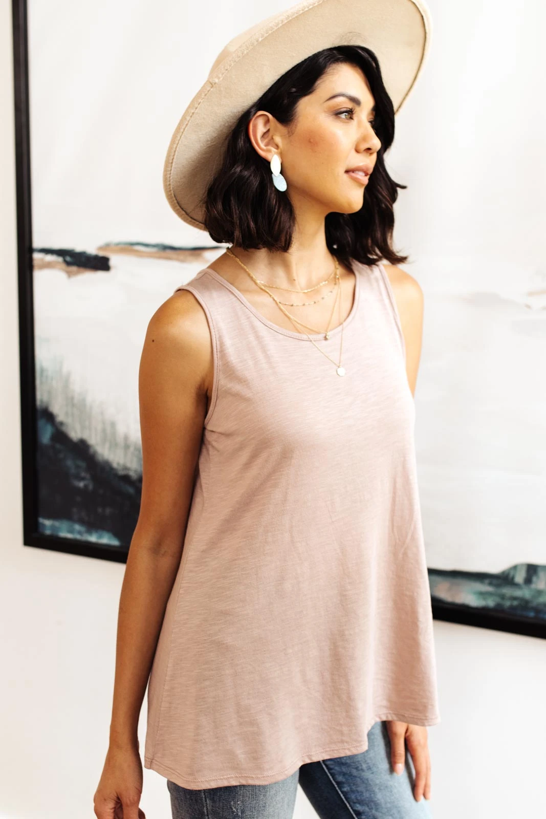 For a wardrobe staple with a feminine touch, look to the Mocha Mirage Tank. This simple sleeveless top is knit for a semi-relaxed sleeveless silhouette and features a flattering round neckline. Pair it with a simple cardigan for a chic daytime ensemble and don’t forget to add accessories for a bit of sparkle, too.