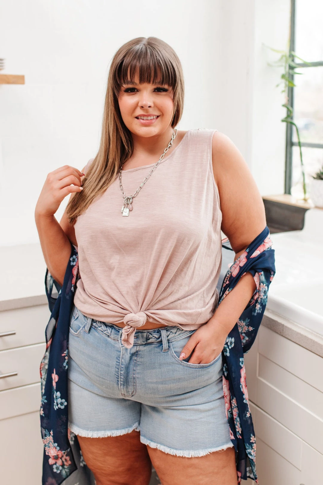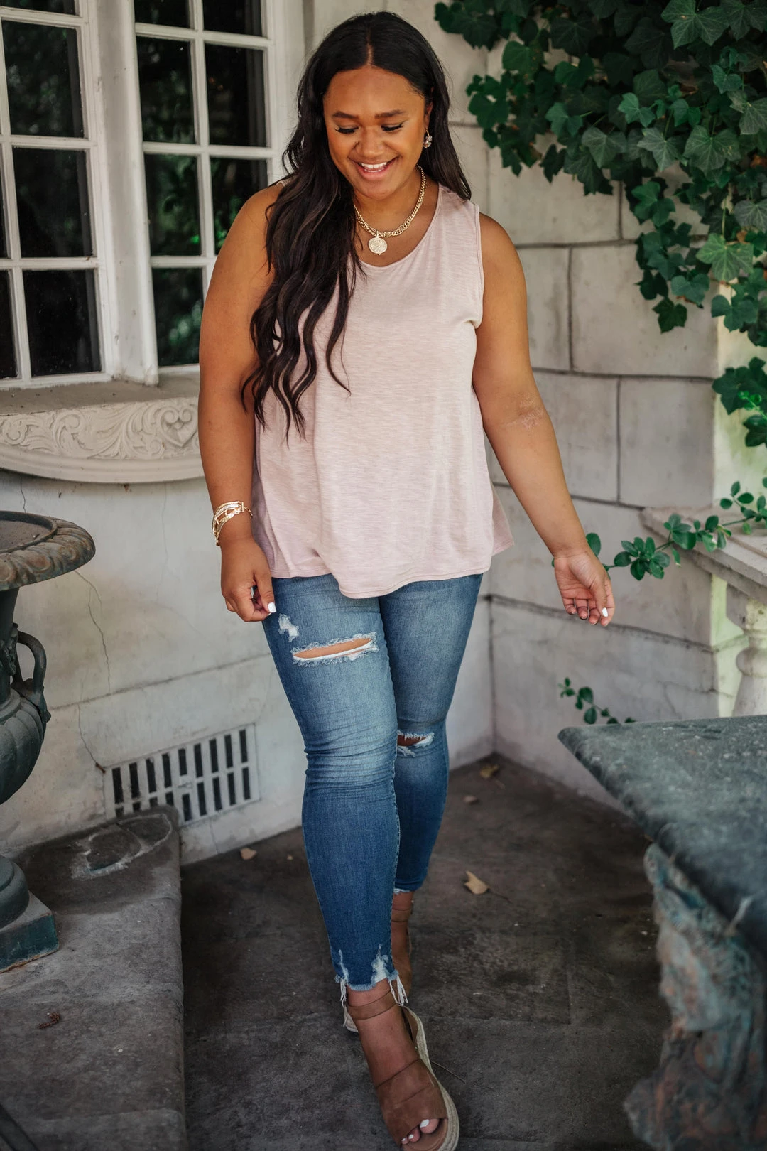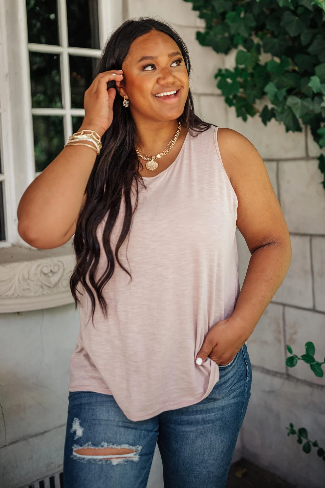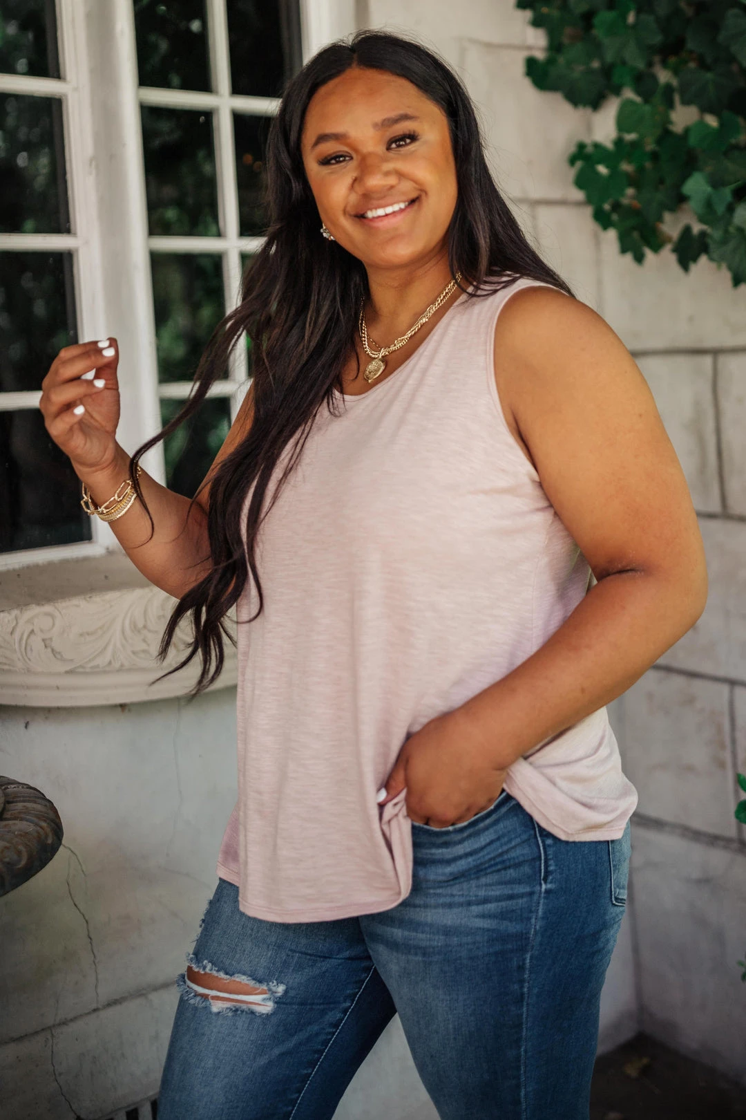 For a wardrobe staple with a feminine touch, look to the Mocha Mirage Tank. This simple sleeveless top is knit for a semi-relaxed sleeveless silhouette and features a flattering round neckline. Pair it with a simple cardigan for a chic daytime ensemble and don’t forget to add accessories for a bit of sparkle, too.