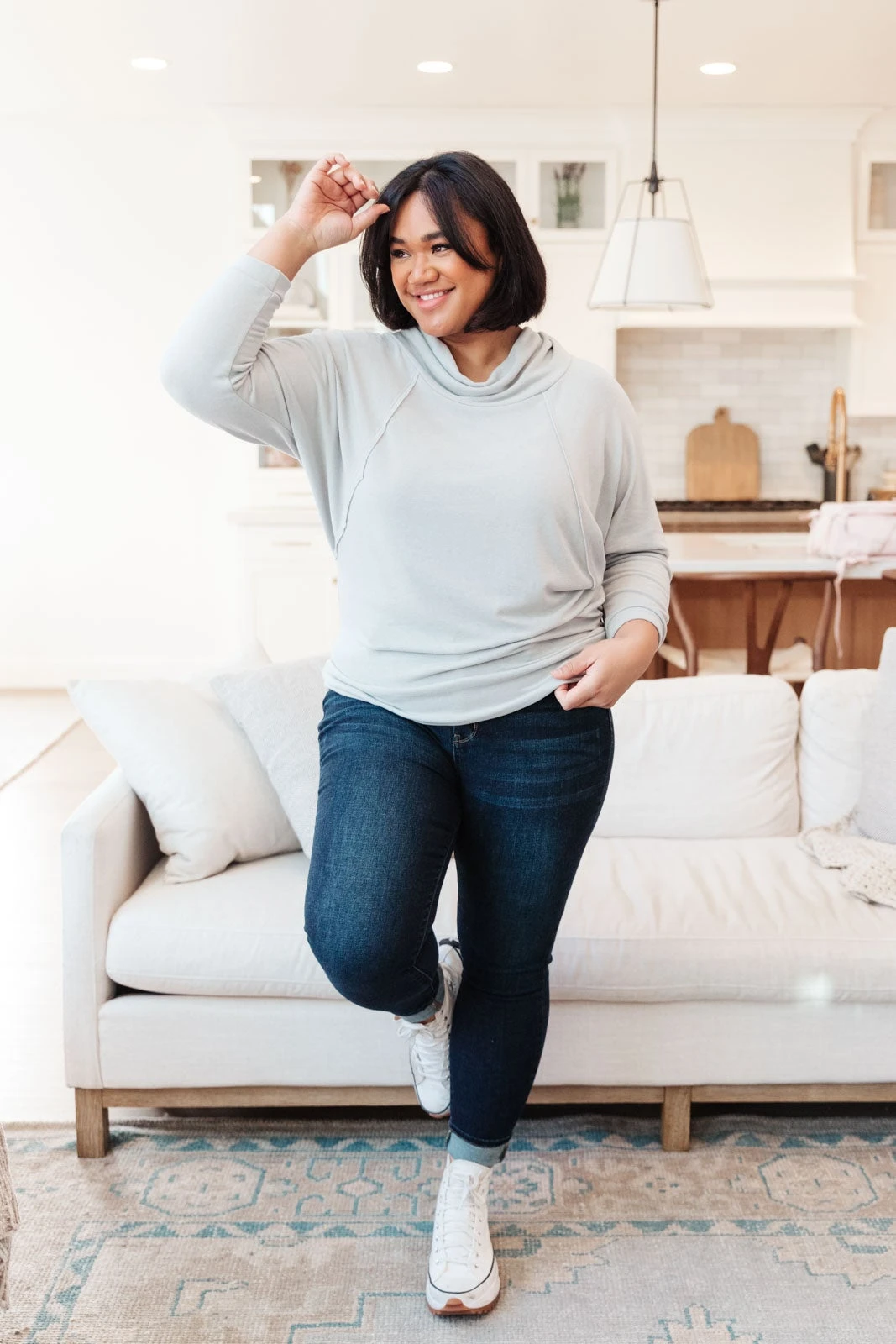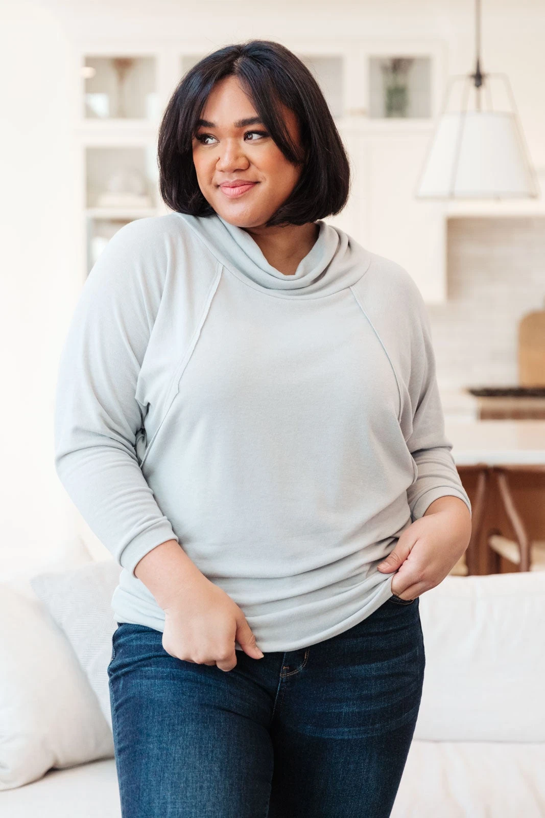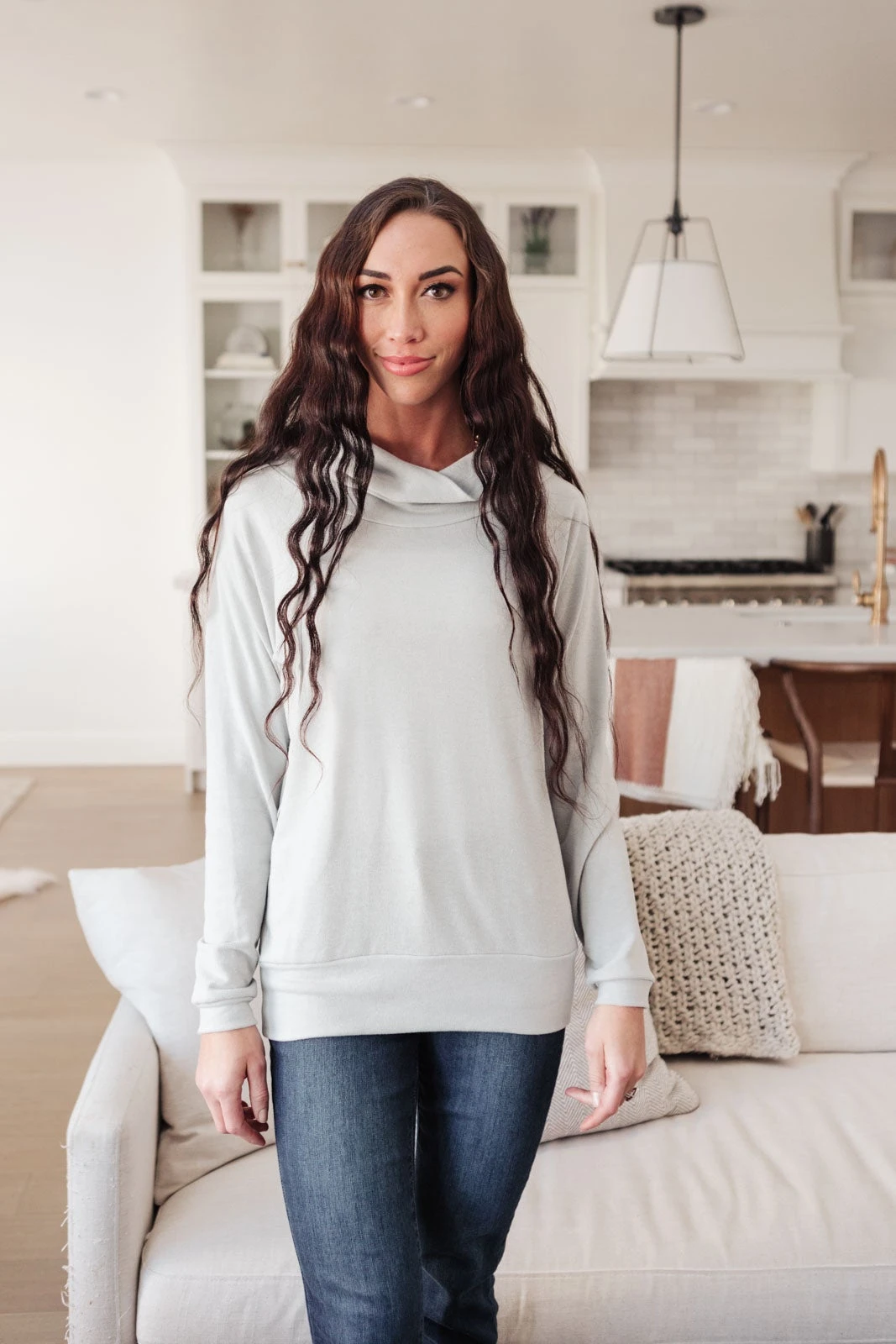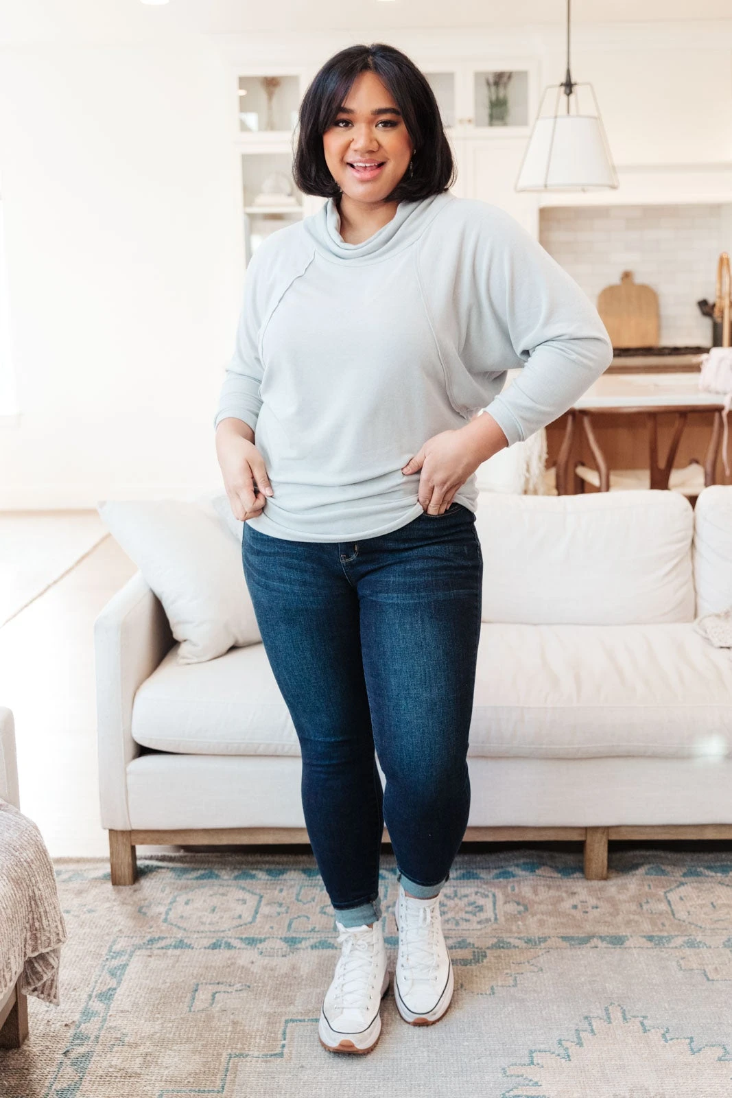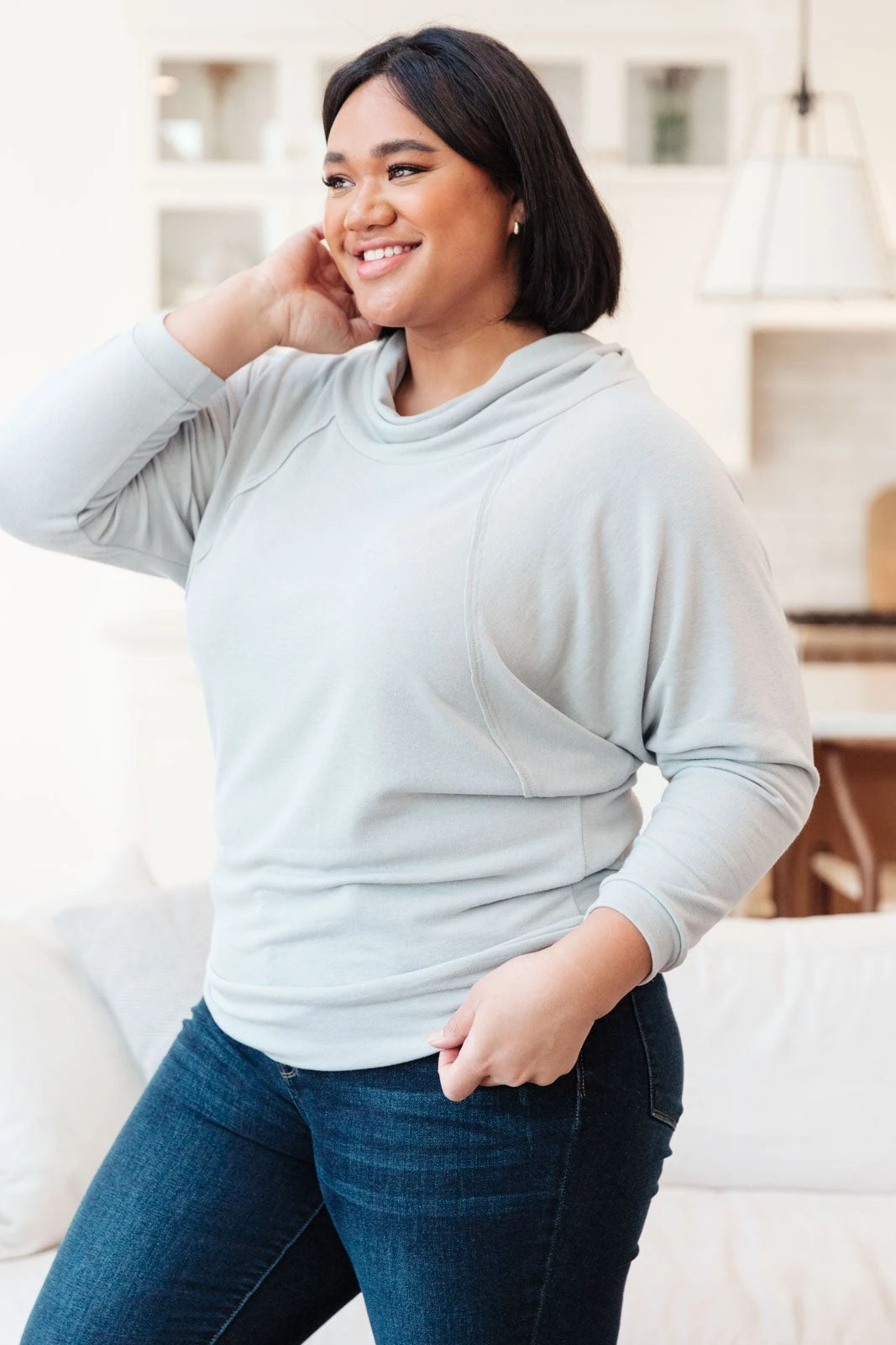 Our Modern Scene Cowl Neck Sweater is so soft and cozy we could live in it for days. This sweater makes for the perfect lounge wear or dress it up with some fun layers such as a denim jacket. It features bat wing sleeves with a lovely inside out seam detail framing the bodice. It is more fitted towards the hem but with it’s super soft and stretchy material, we know you’ll love this top just as much as we do!