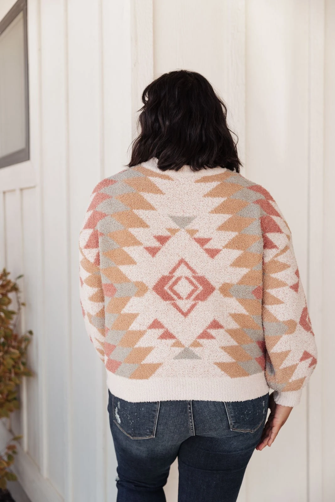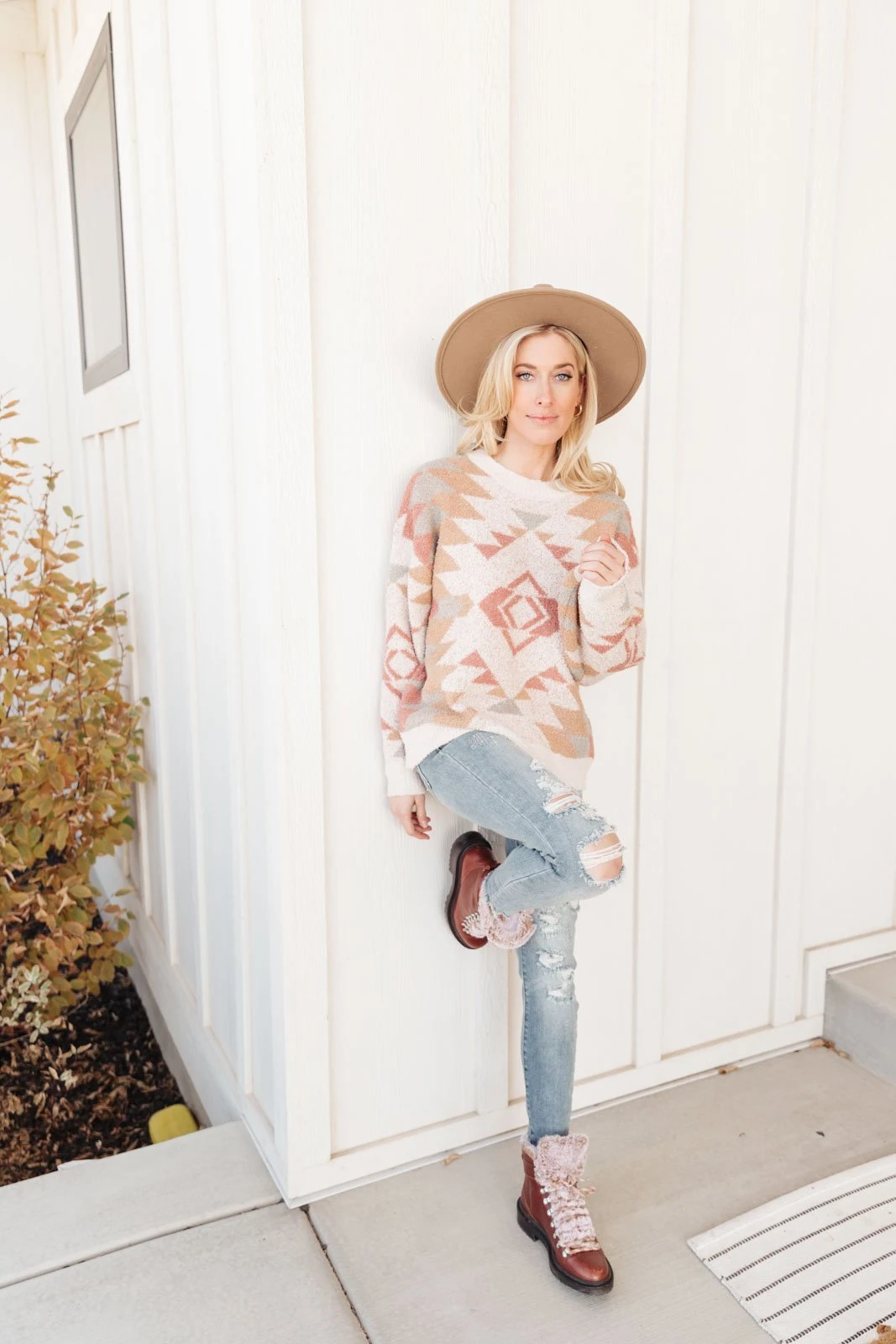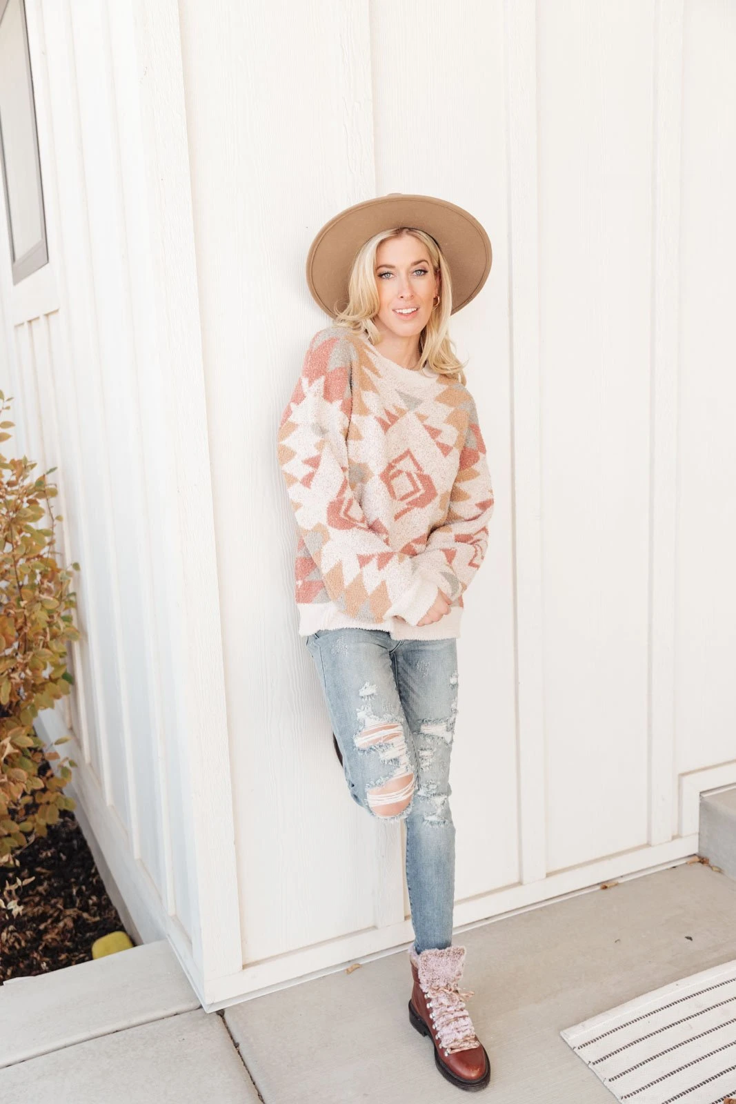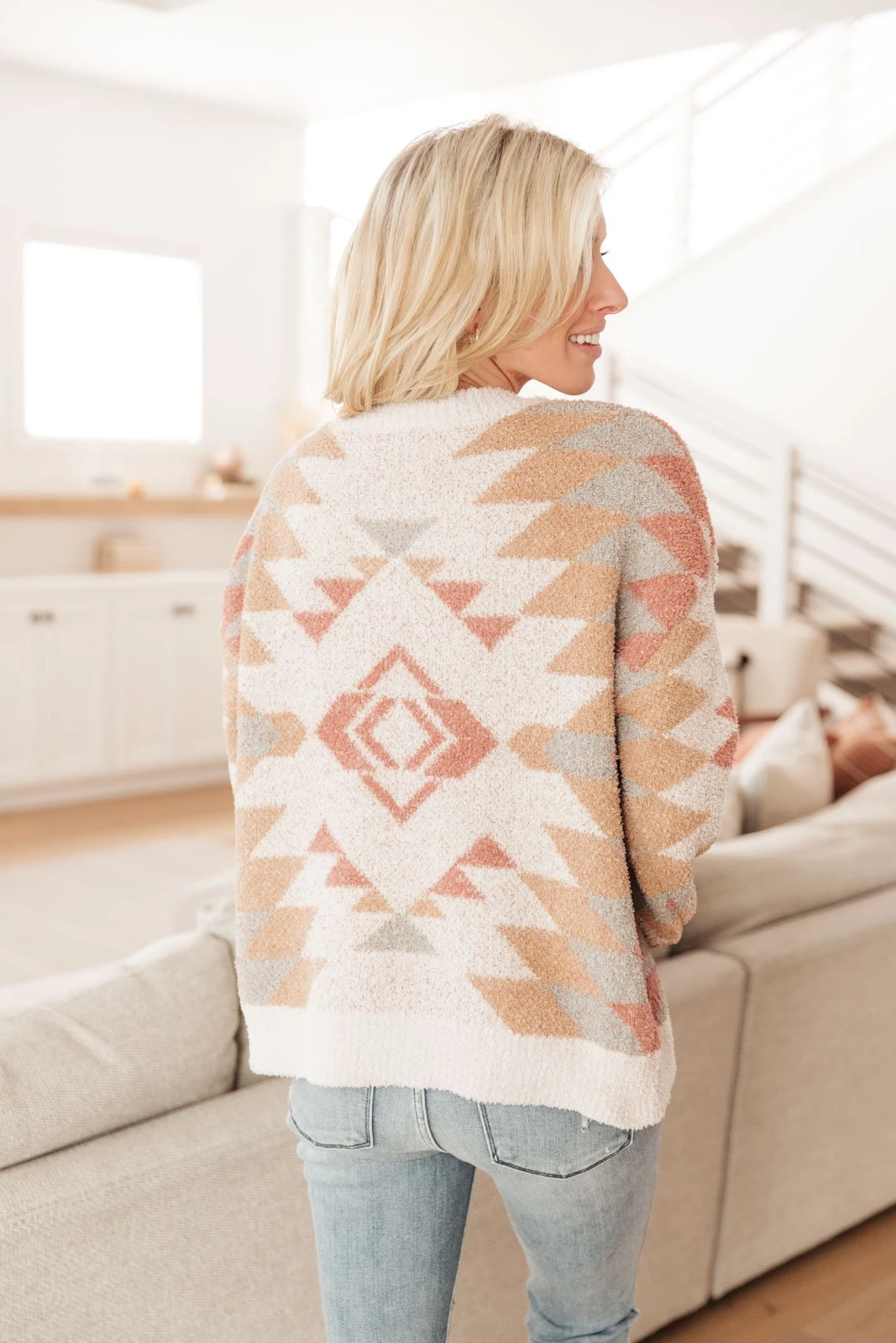 The Mojave Sweater will have you ready for adventures all year. The gorgeous desert inspired print will bring your outfit to life. The incredible plush knit material will keep you comfortable and cozy. Wear this piece with a neutral bag and your favorite denim, skirts and more.Â
