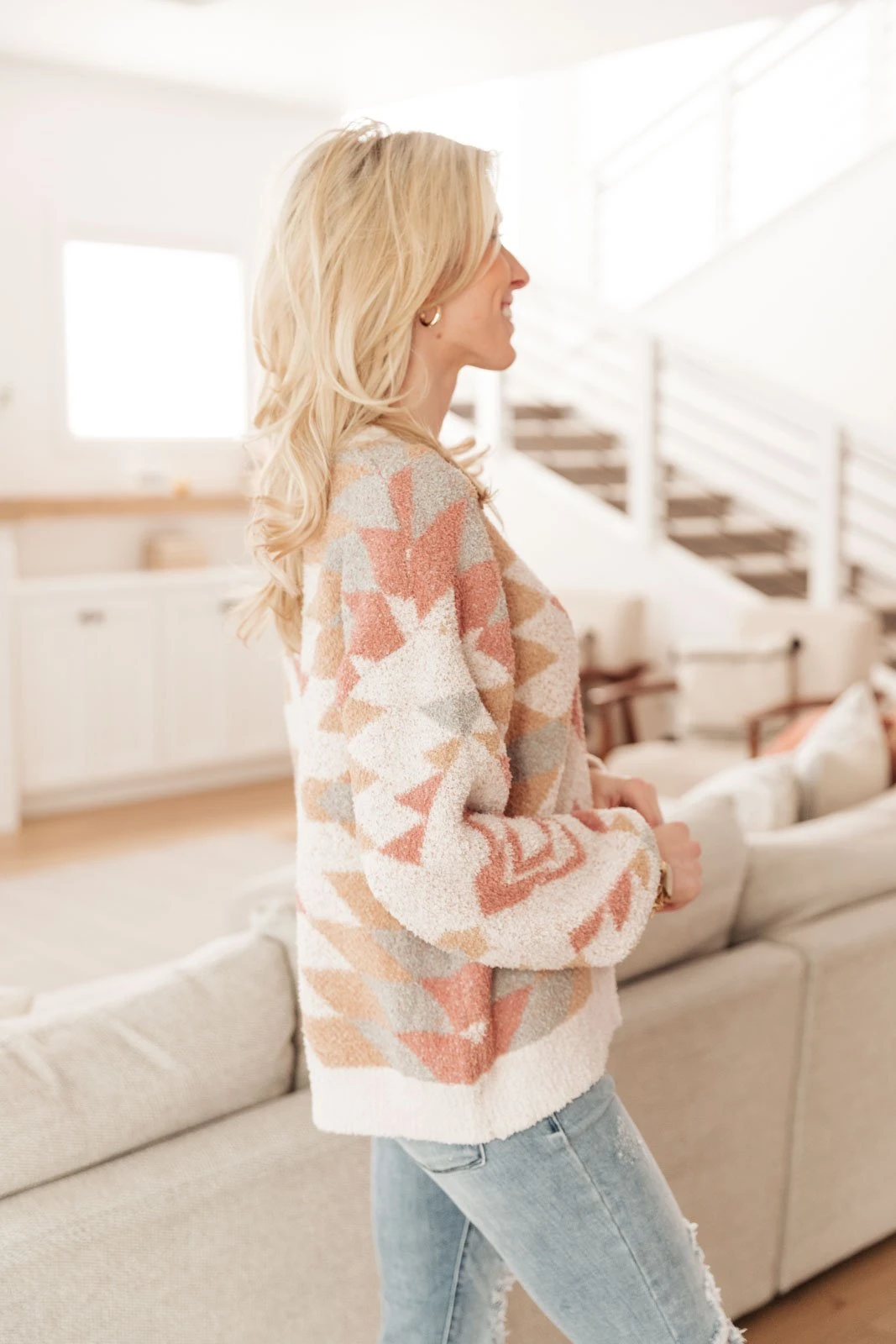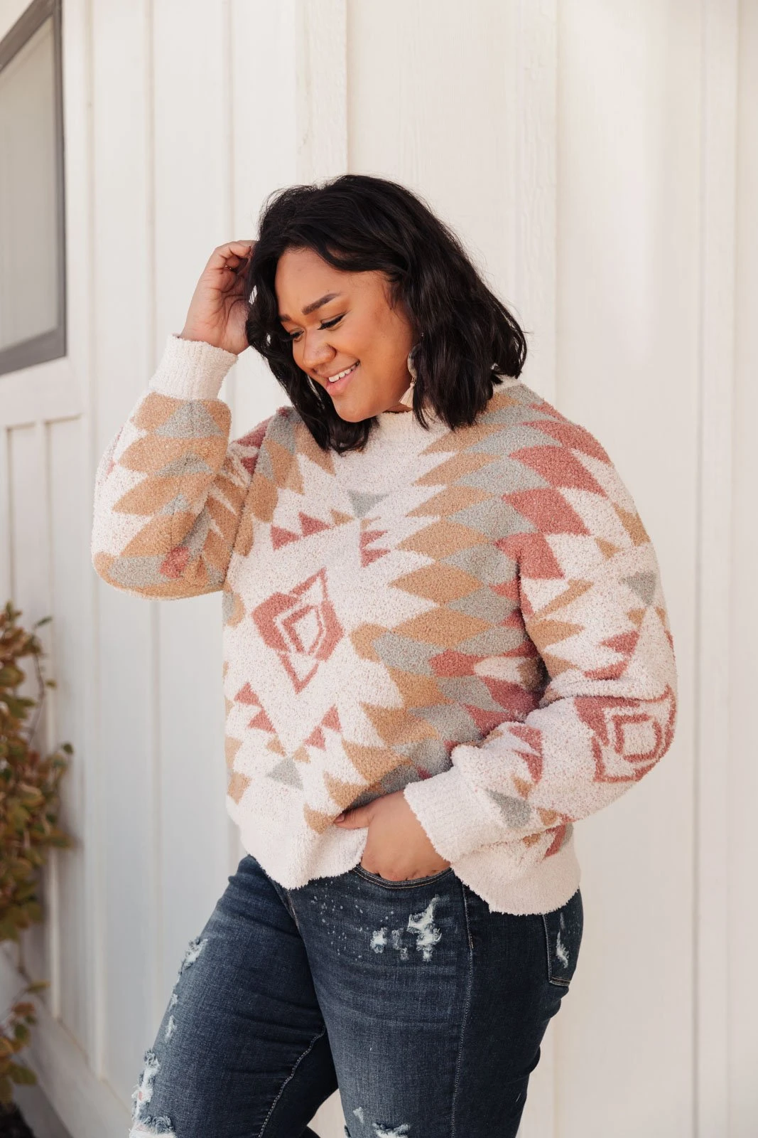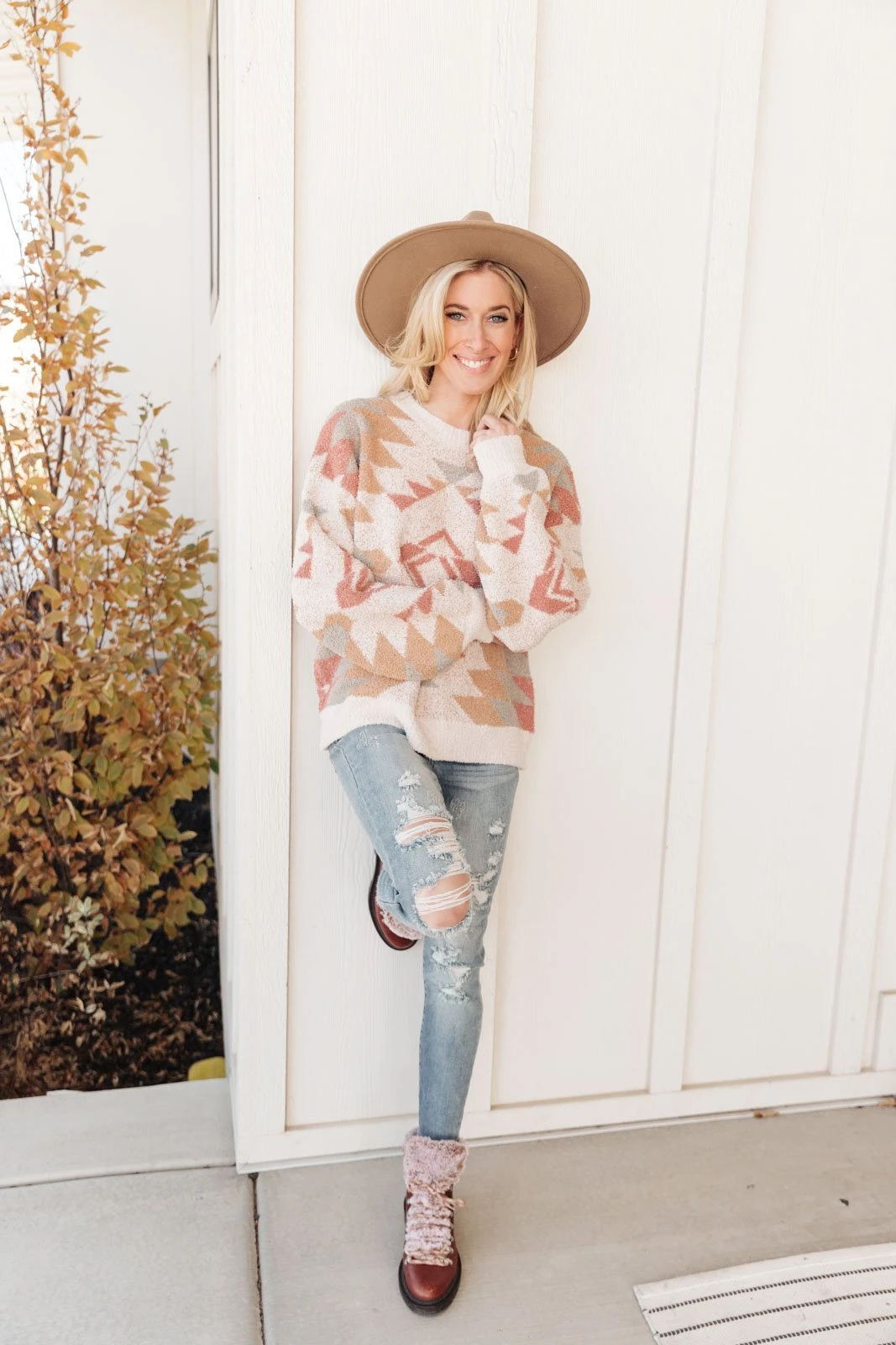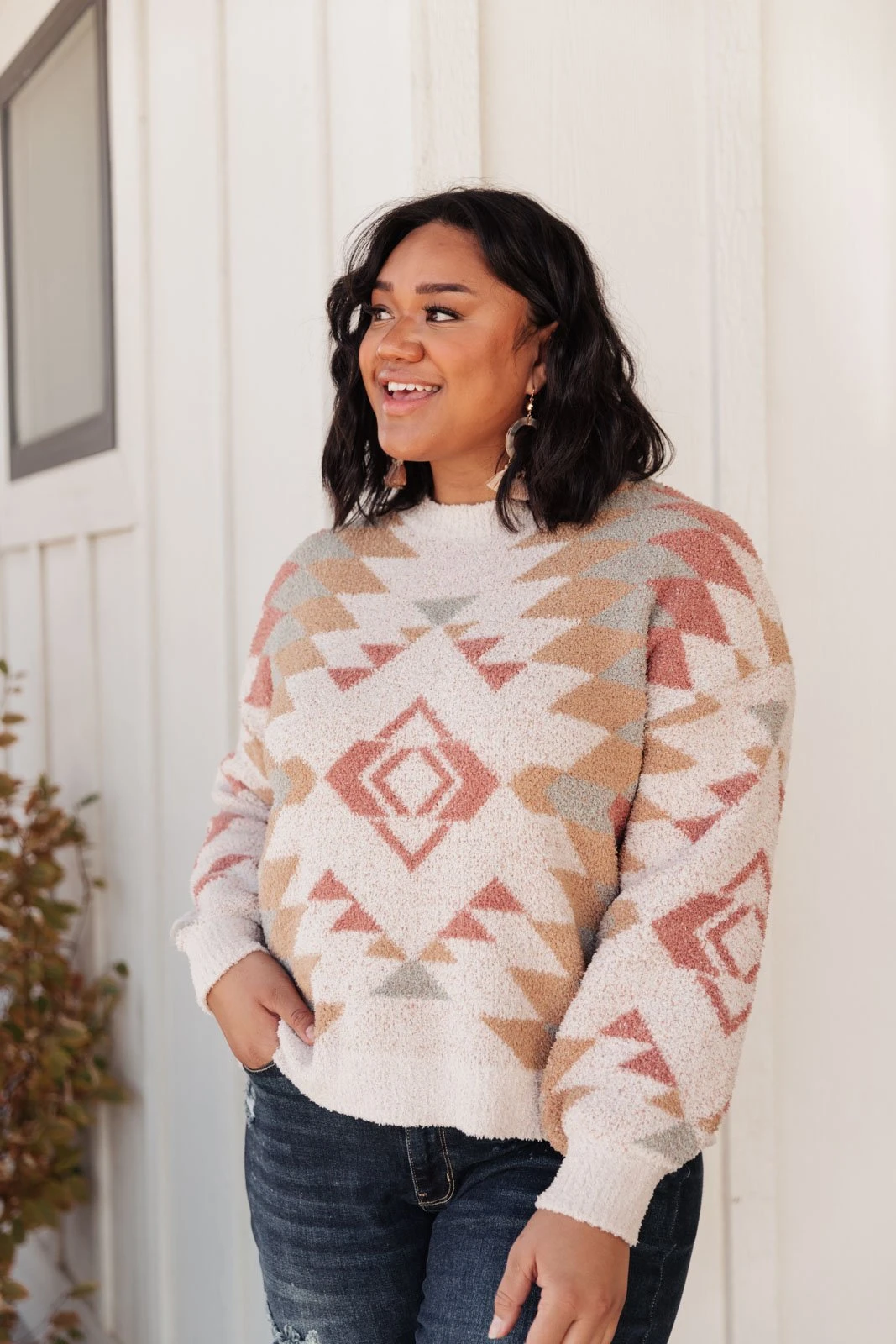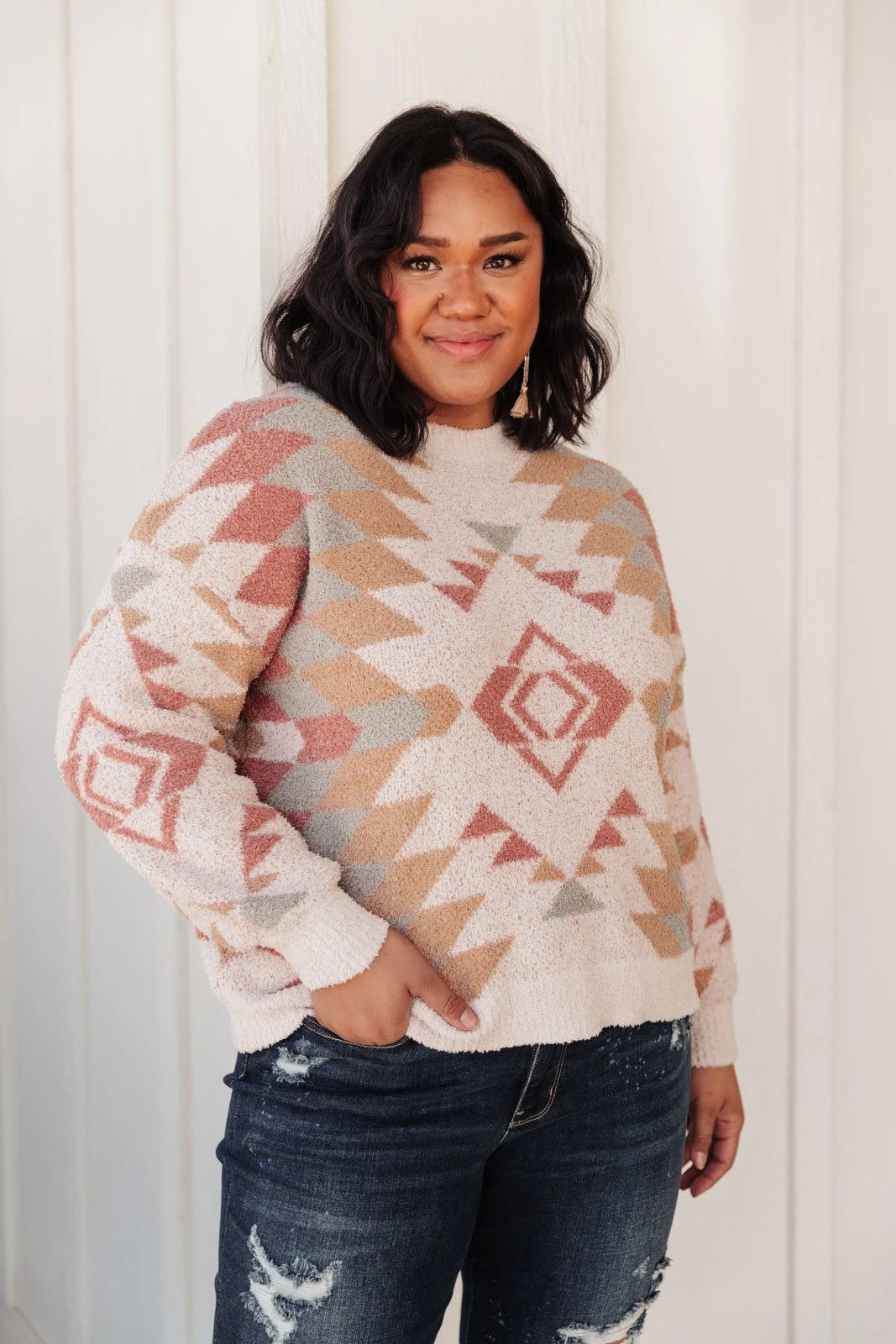 The Mojave Sweater will have you ready for adventures all year. The gorgeous desert inspired print will bring your outfit to life. The incredible plush knit material will keep you comfortable and cozy. Wear this piece with a neutral bag and your favorite denim, skirts and more.Â