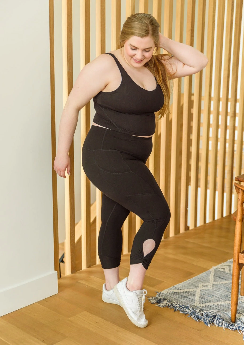 Move in style with the Move With Me Black Leggings! A buttery soft fabric shapes an ankle length pant, keyhole detail, high waistband, and outer thigh pockets. Pair with a crop top and sneakers for an on the go look!
