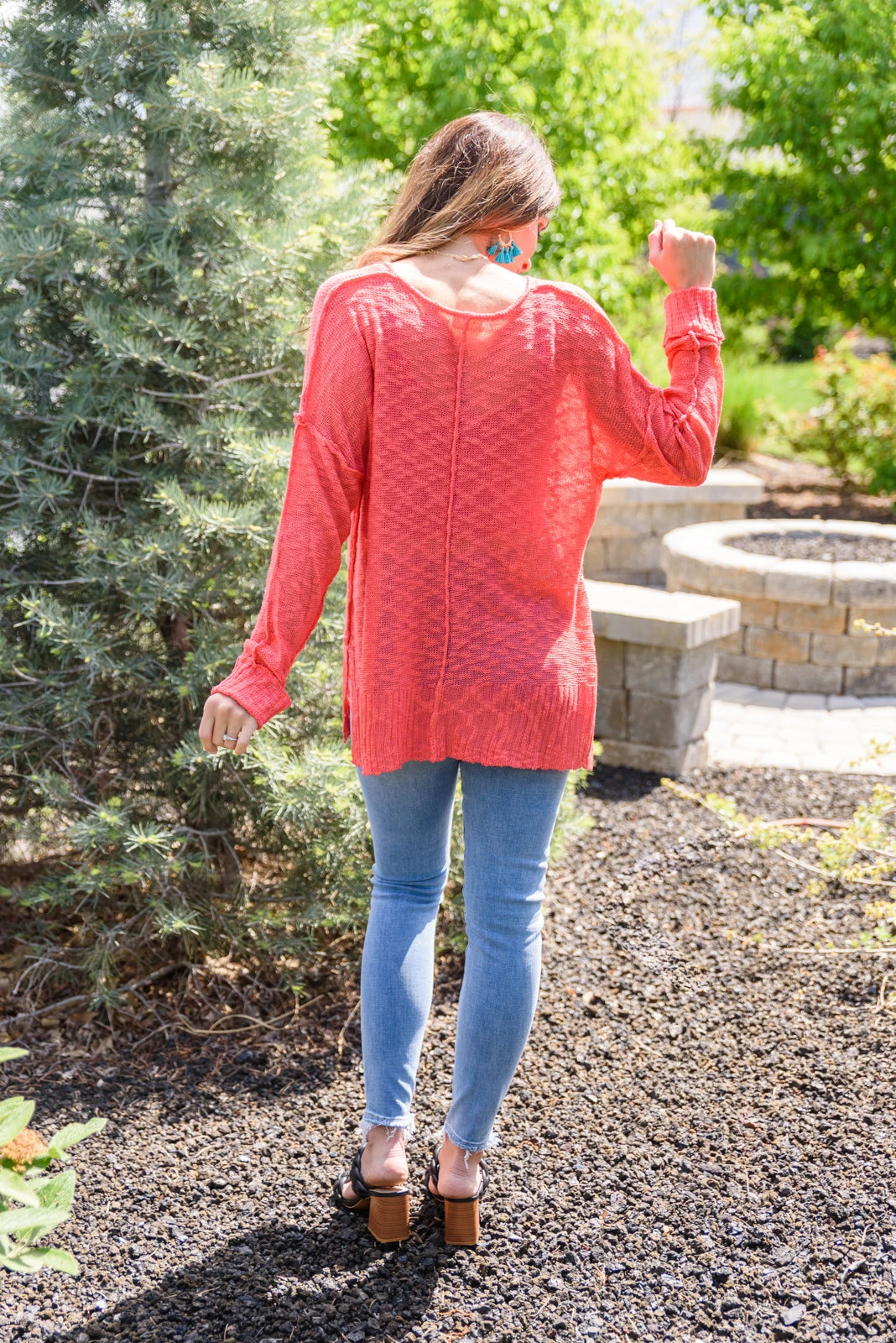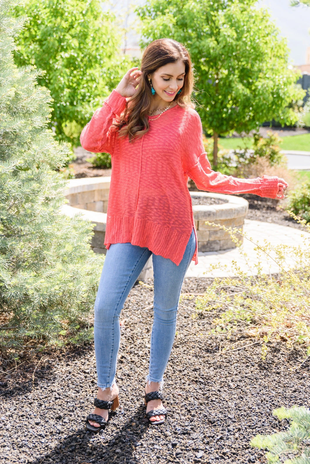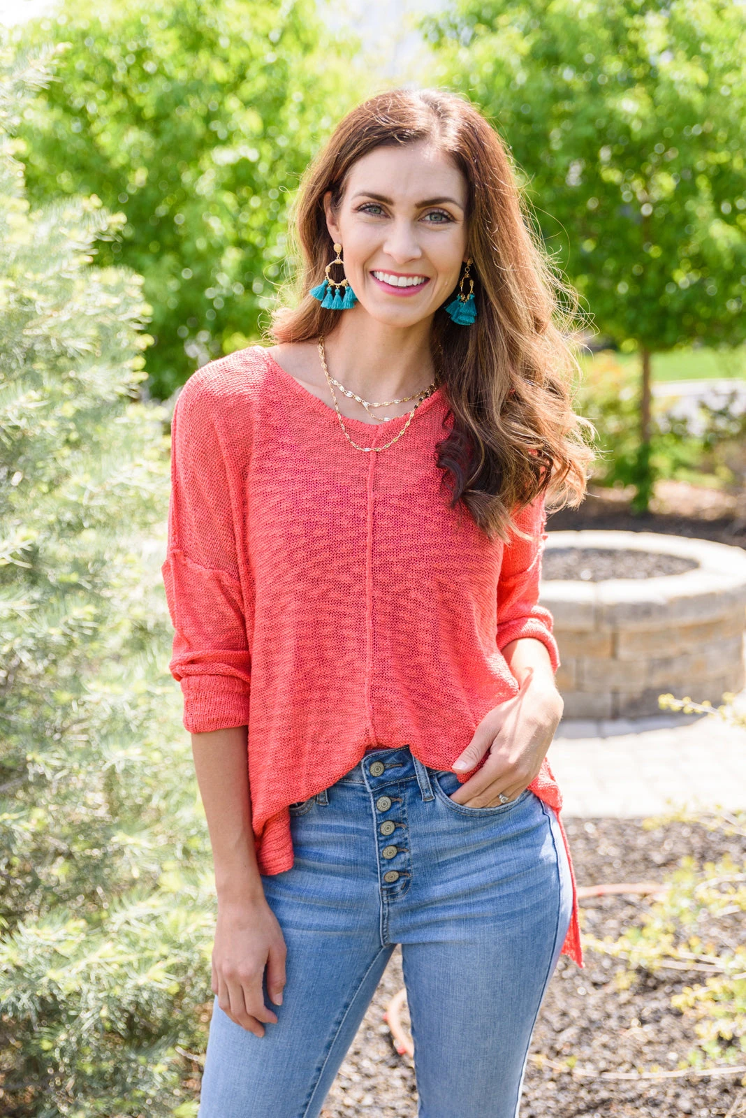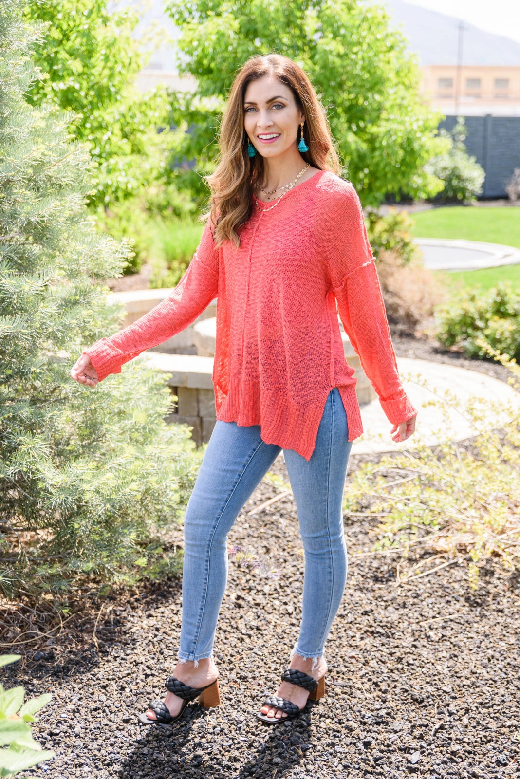 Whether it’s a breezy summer night or a swimsuit cover up, the Ask Away Top will be successful in creating a cute and fun summer look! The pop of orange, exposed seam details, and split hem makes this light summer sweater a statement piece that is so versatile!