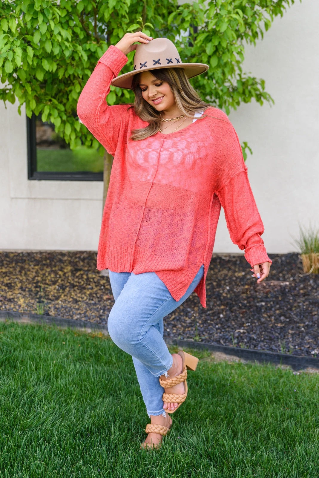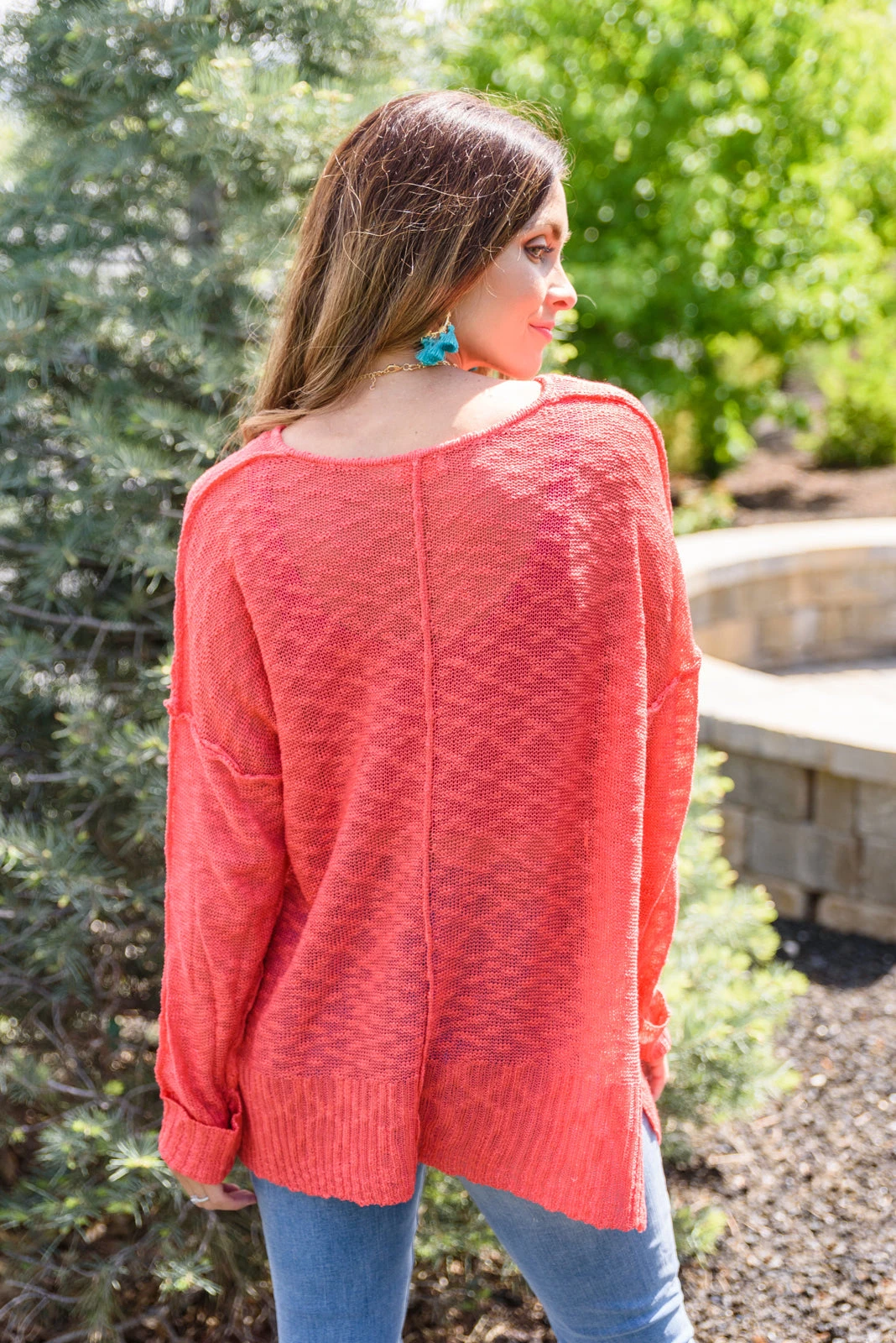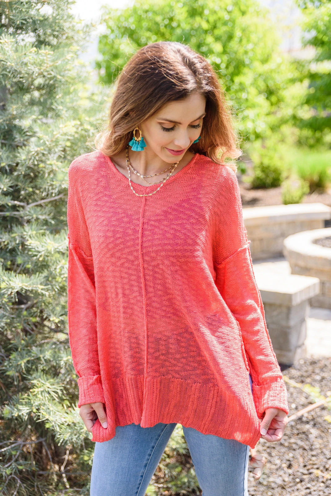 Whether it’s a breezy summer night or a swimsuit cover up, the Ask Away Top will be successful in creating a cute and fun summer look! The pop of orange, exposed seam details, and split hem makes this light summer sweater a statement piece that is so versatile!
