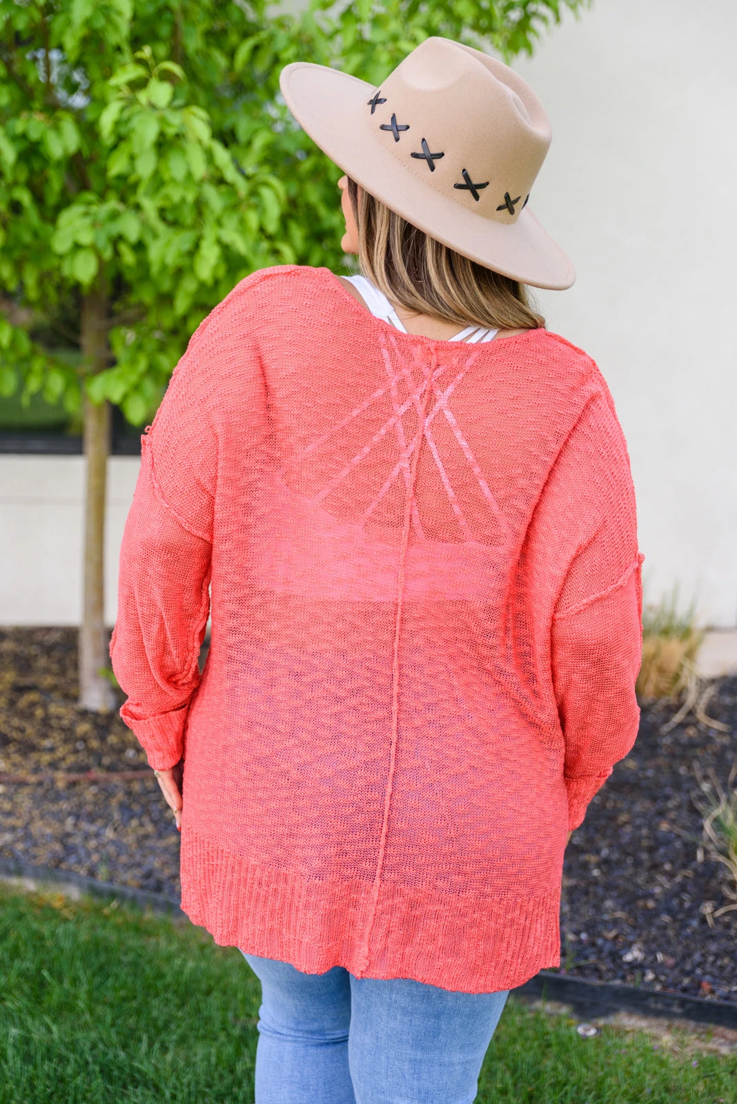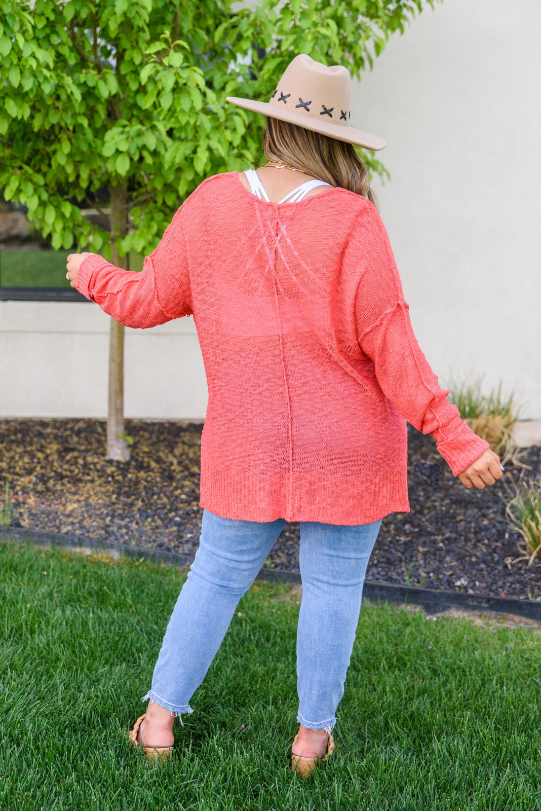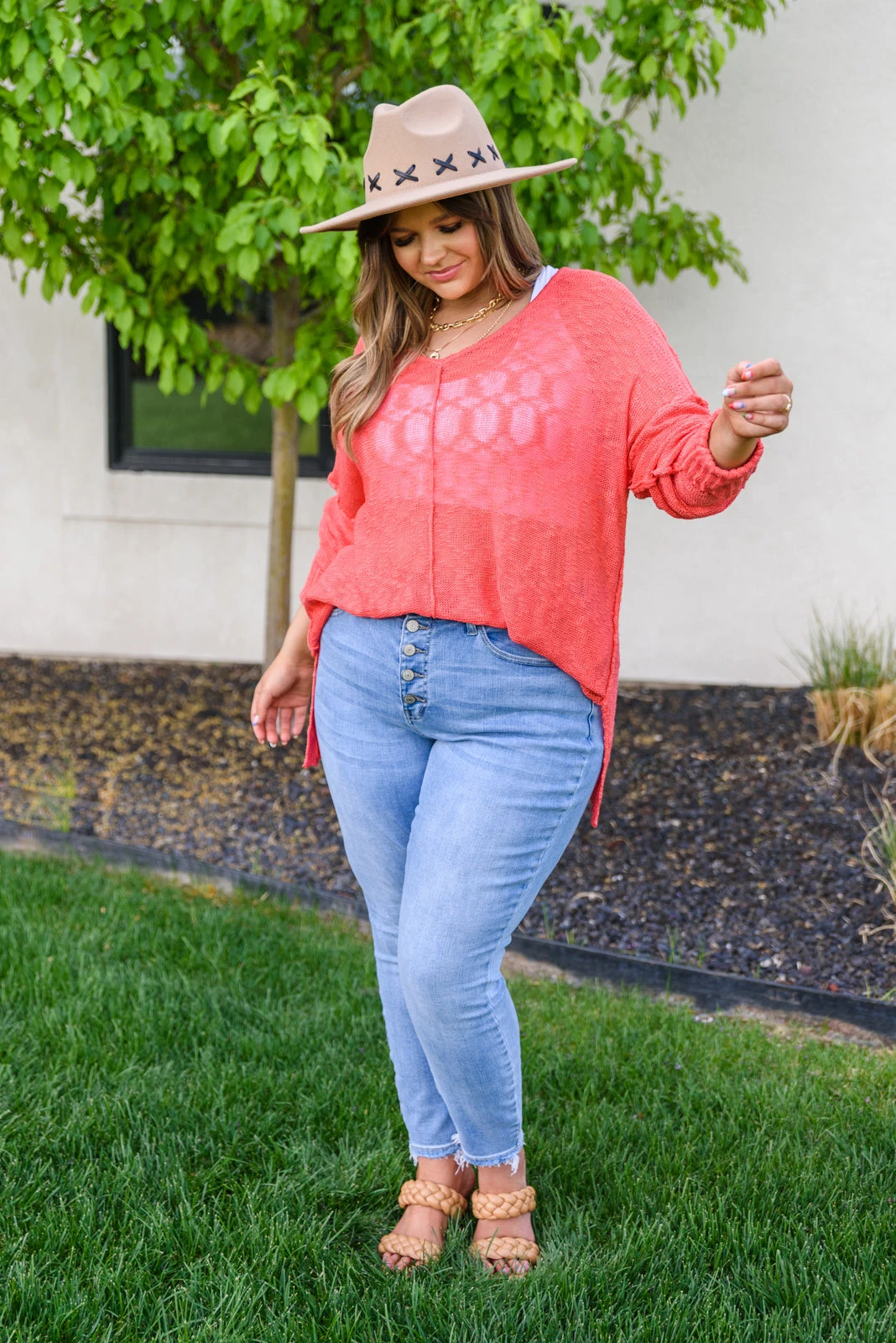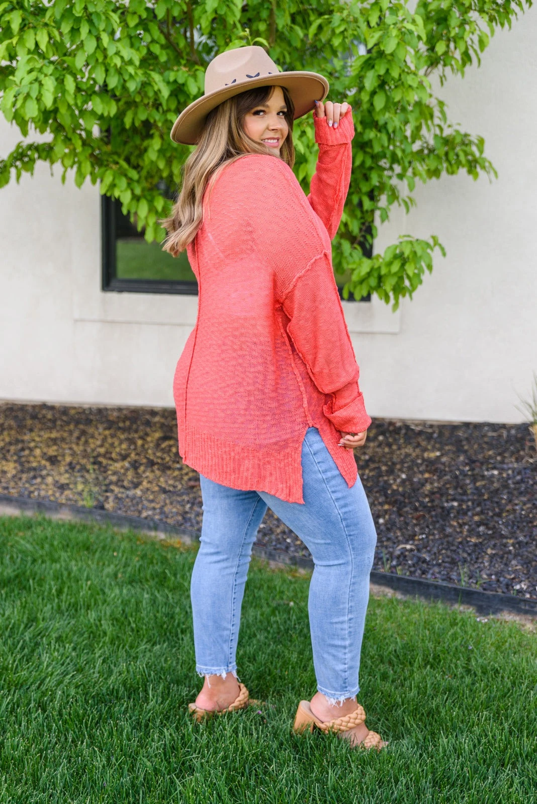 Whether it’s a breezy summer night or a swimsuit cover up, the Ask Away Top will be successful in creating a cute and fun summer look! The pop of orange, exposed seam details, and split hem makes this light summer sweater a statement piece that is so versatile!