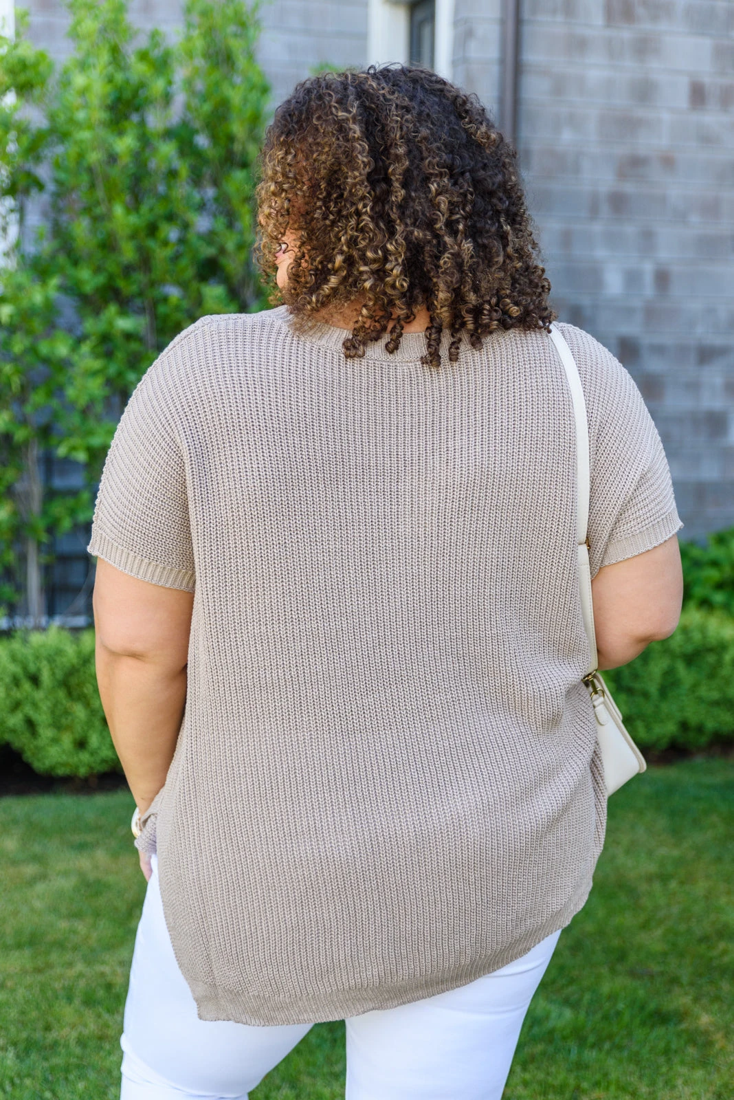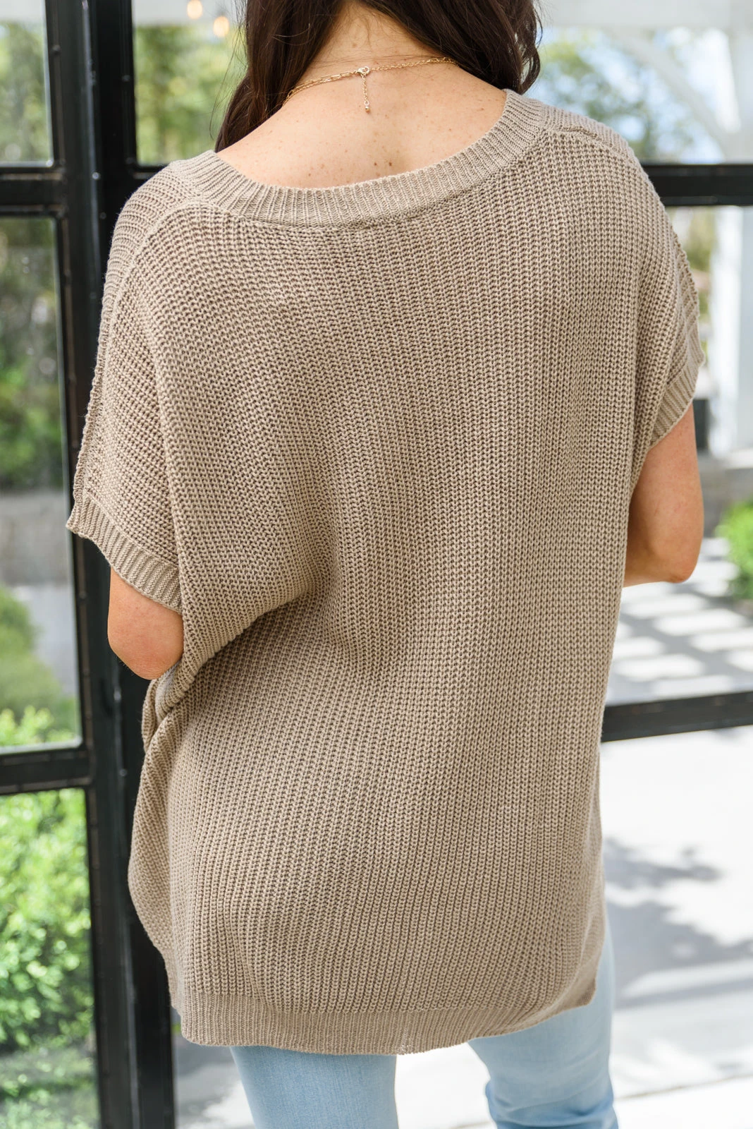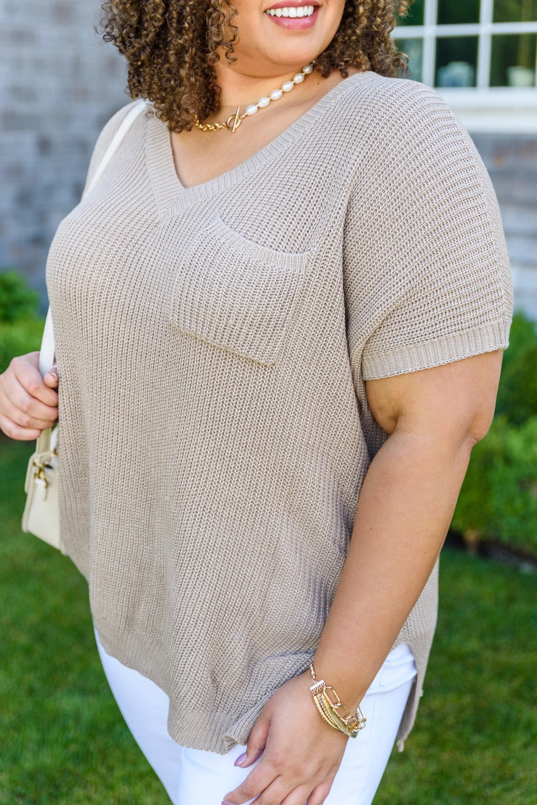 Keywords: Knit, V-Neck, Short Sleeve, Tan, Taupe