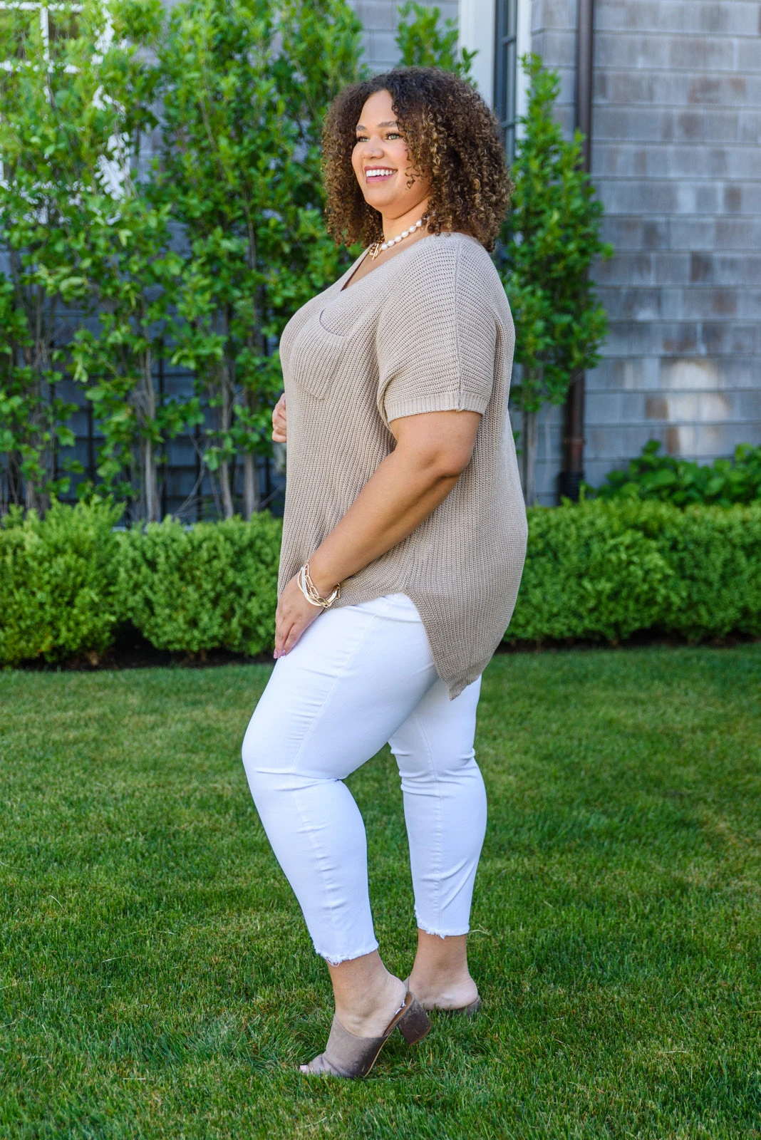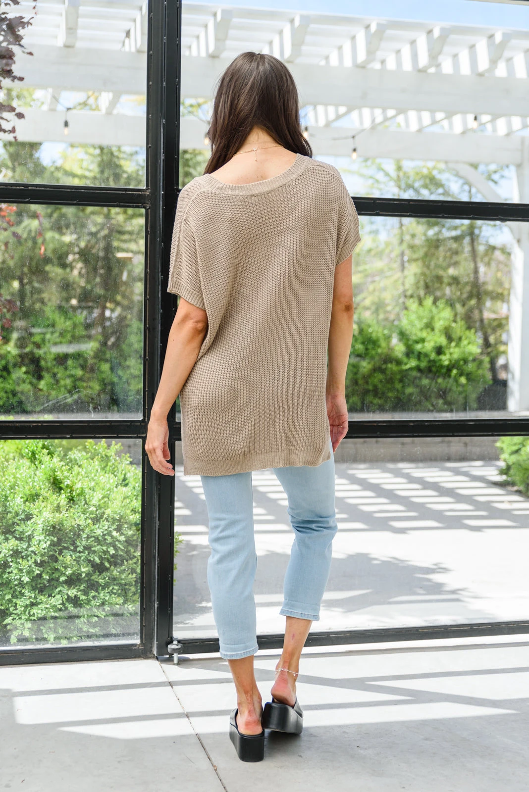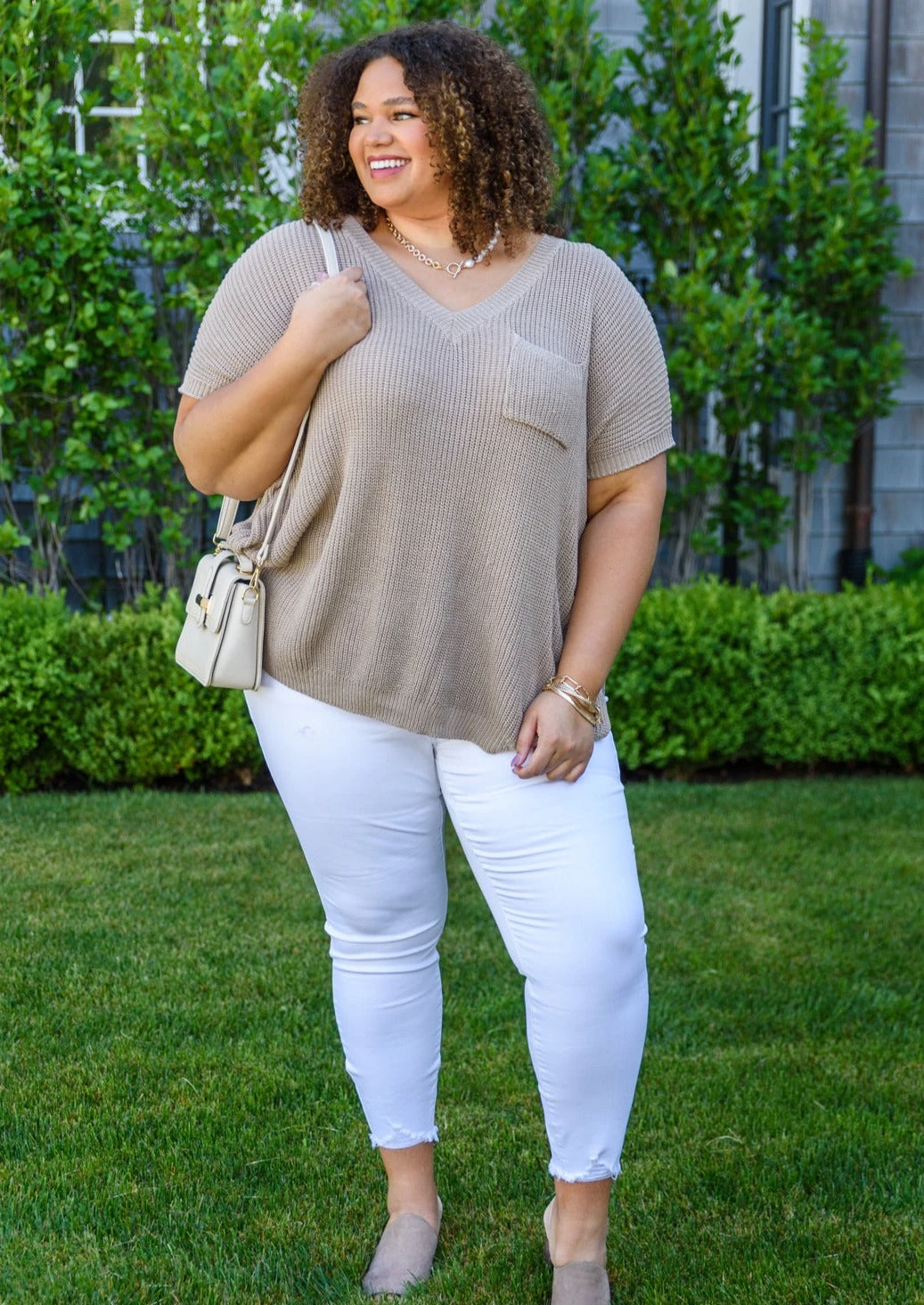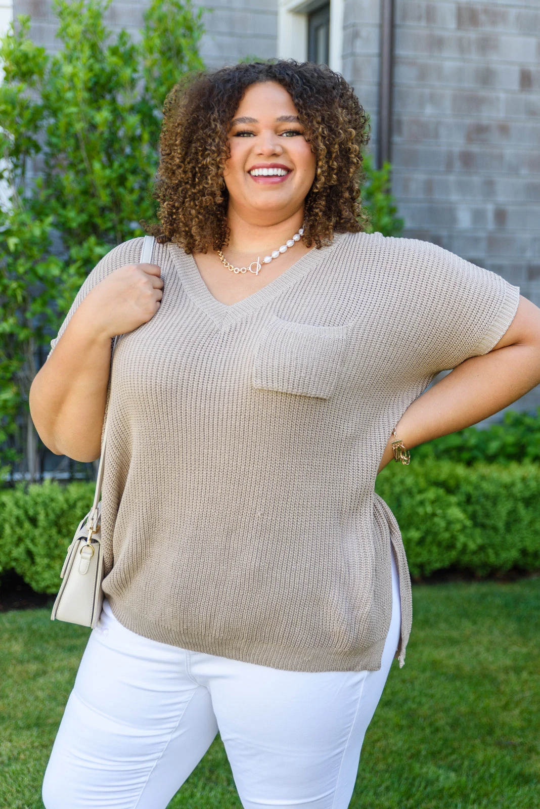Keywords: Knit, V-Neck, Short Sleeve, Tan, Taupe