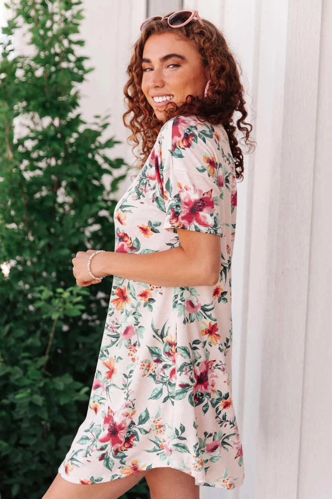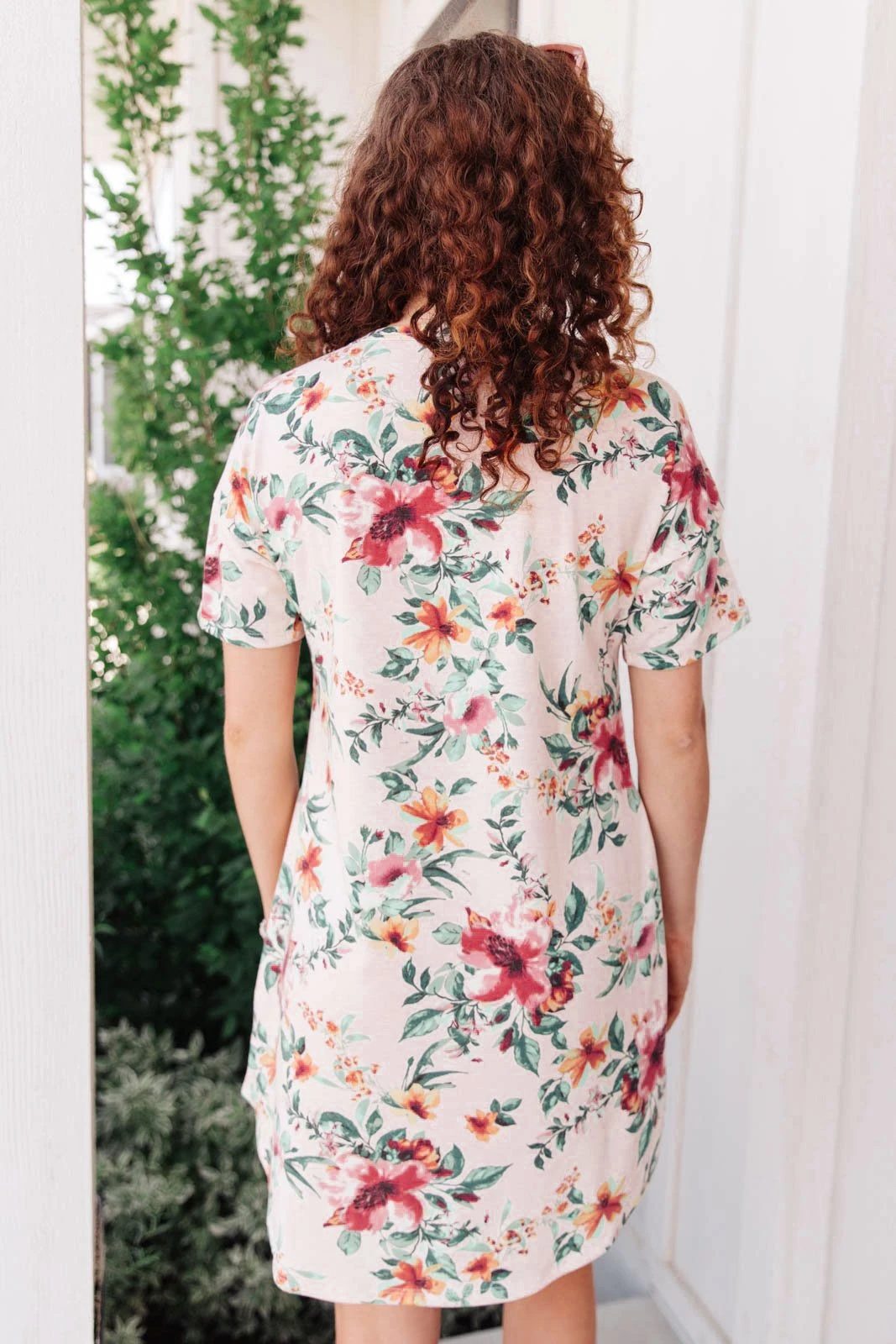 The Watercolor Blossoms Dress brings an artistic twist to a comfy t-shirt dress. This dress features beautiful blossoms and a cutout v neckline. Pair this dress with some cute flats or sneakers for a laid back look.
