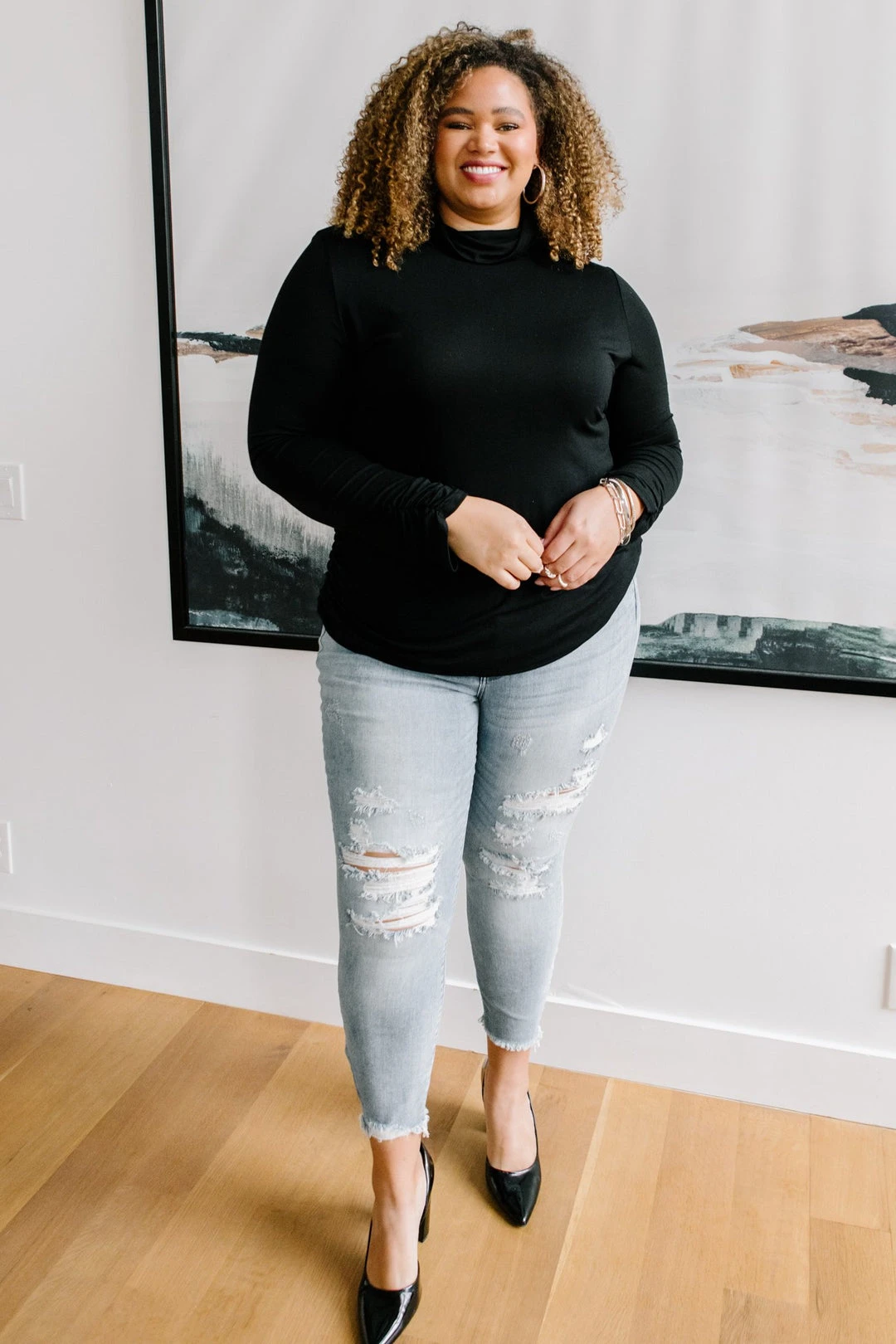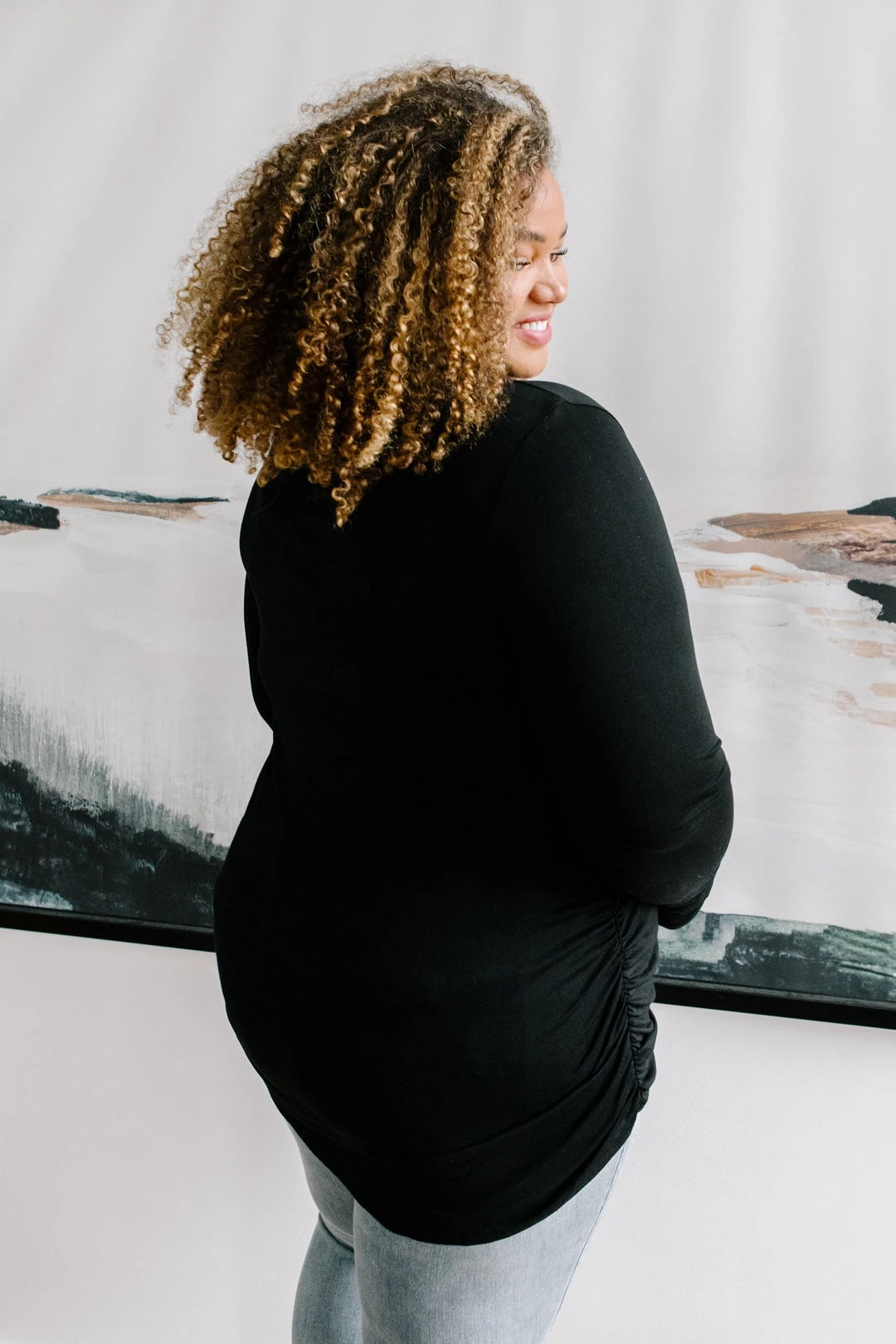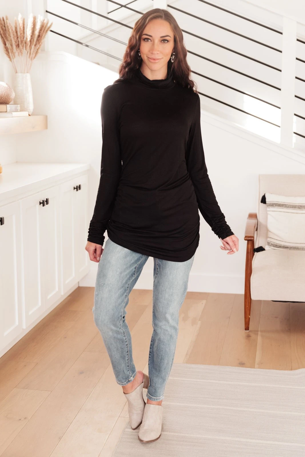 The Rushed And Ready Cowl Neck Top is a must-have item for every closet! This cowl neck top is lightweight and stretchy, which makes it perfect for wearing under jackets and coats. The rushed details on the hips and sleeves help to create a form fitting, flattering silhouette. Pair this top with jeans, skirts, or leggings.