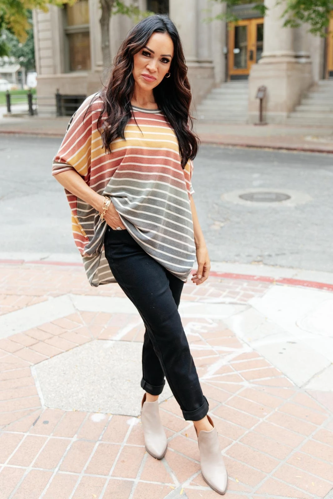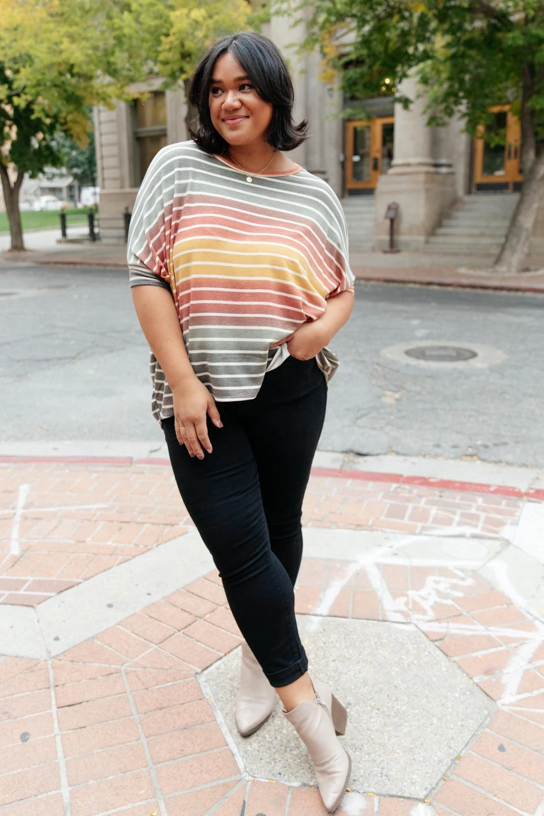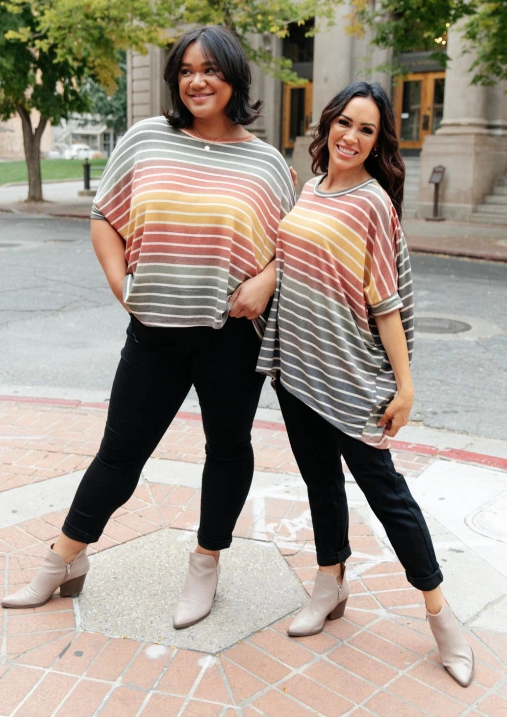 The Weekend Wonder Top is going to be your new favorite oversized tee! This adorable striped top features a dolman sleeve with a cuff at the elbow. This soft top pairs perfectly with jeans or leggings.