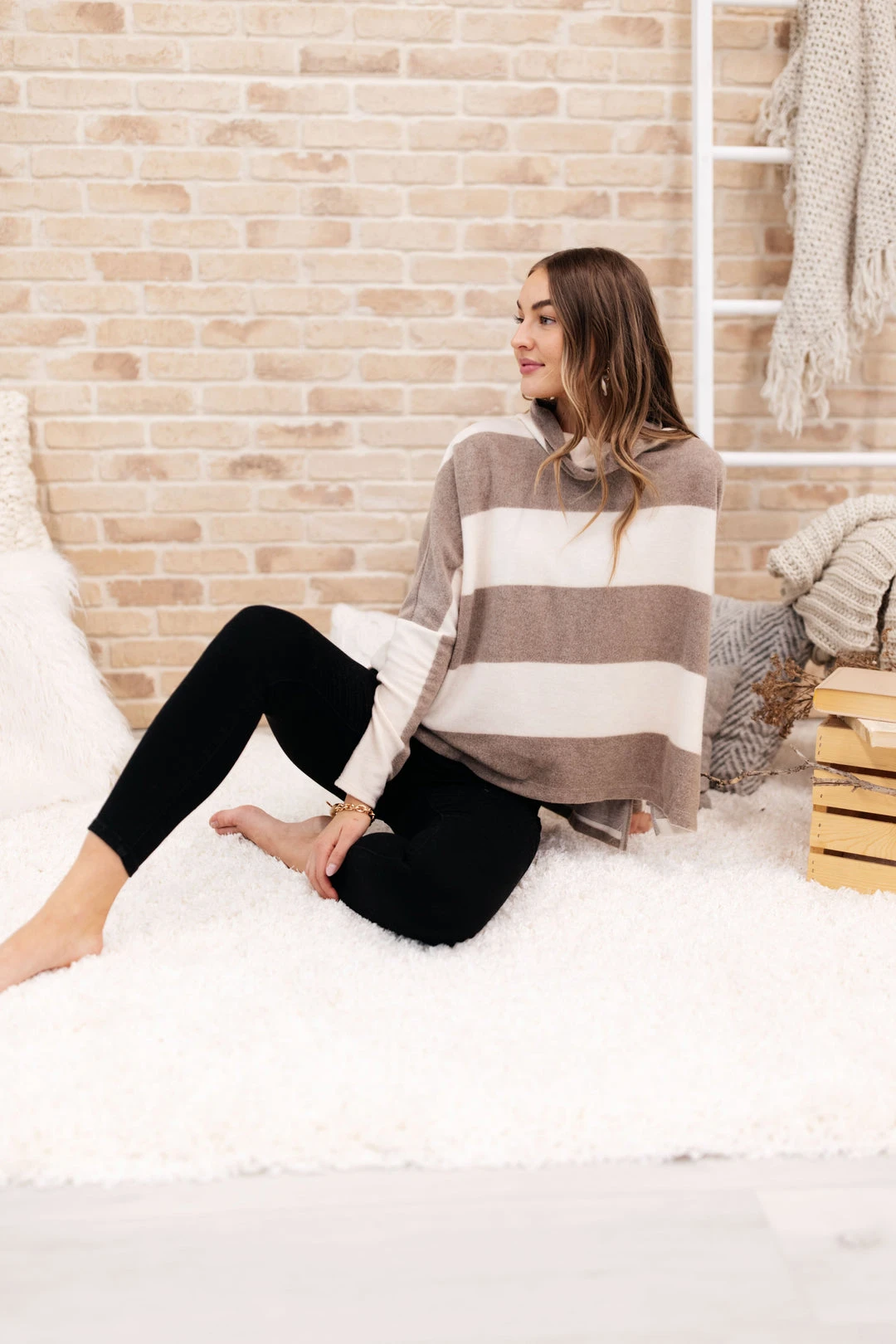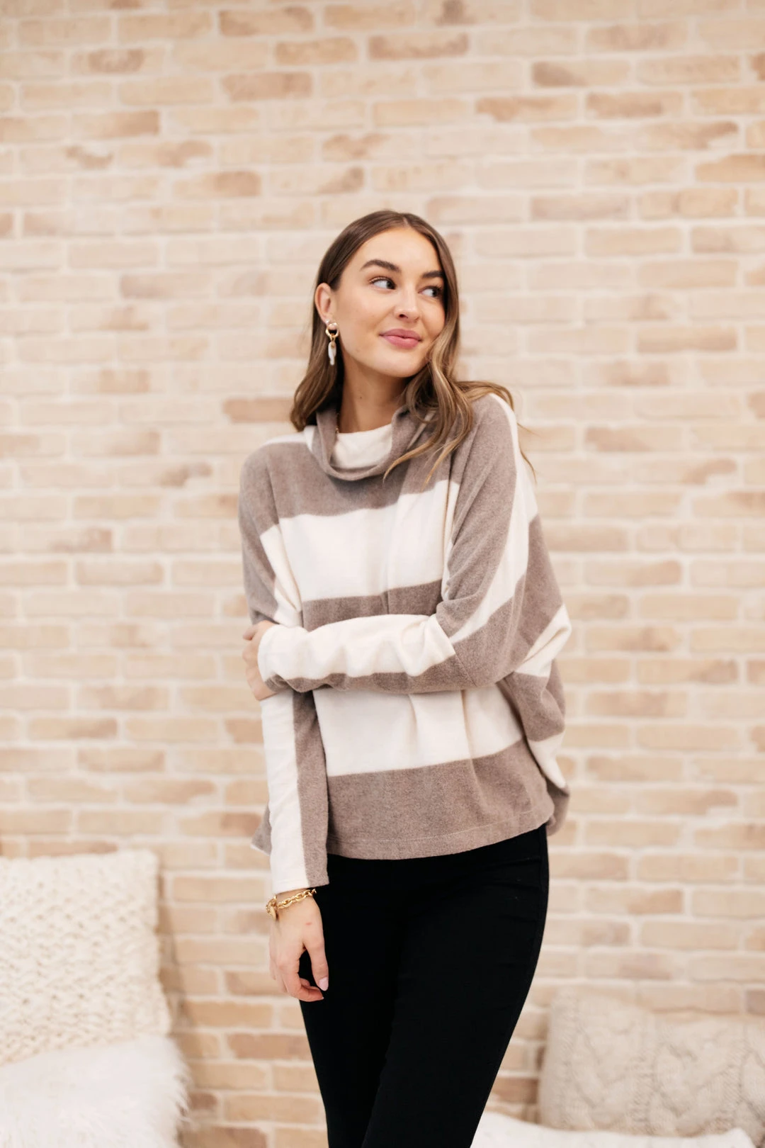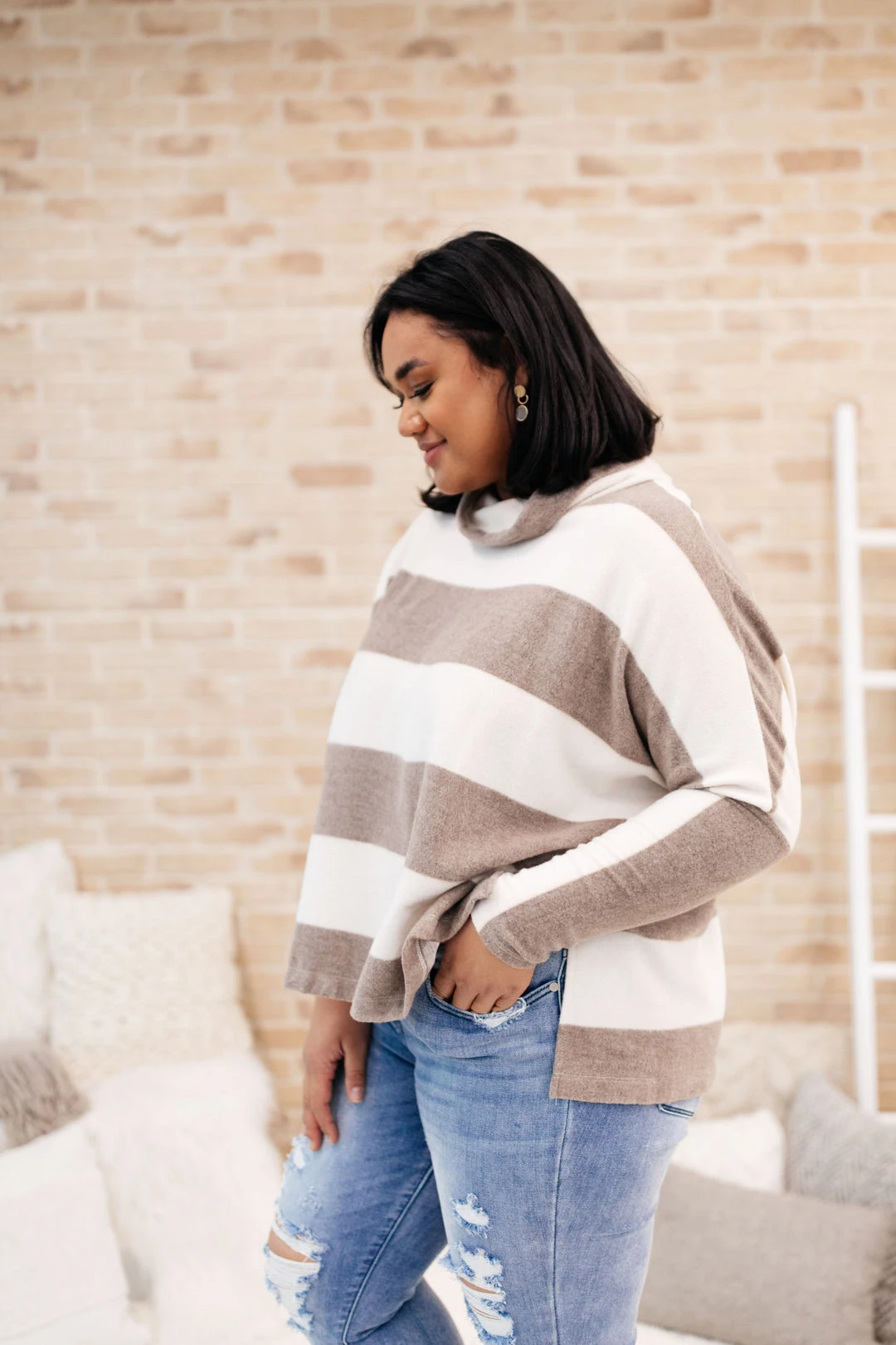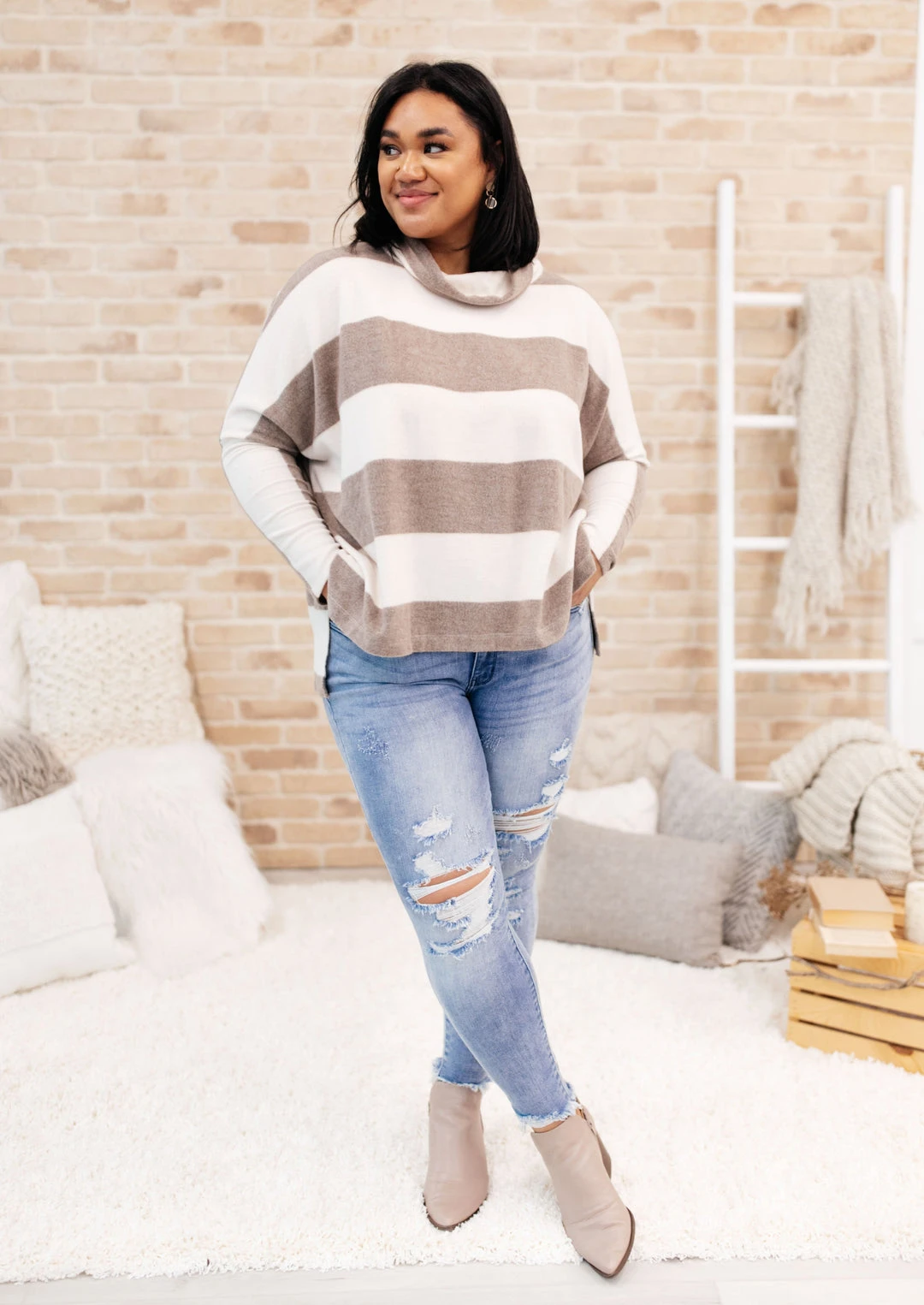 Keywords: Tan Sweater, Cowl Neck, Turtleneck, Sweater, Stripes
