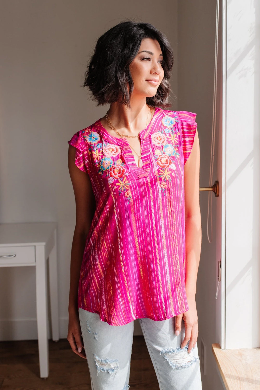 Keywords: Pink, Top, Ruffle, Floral, Embroidery