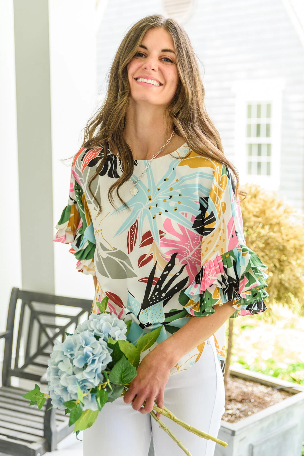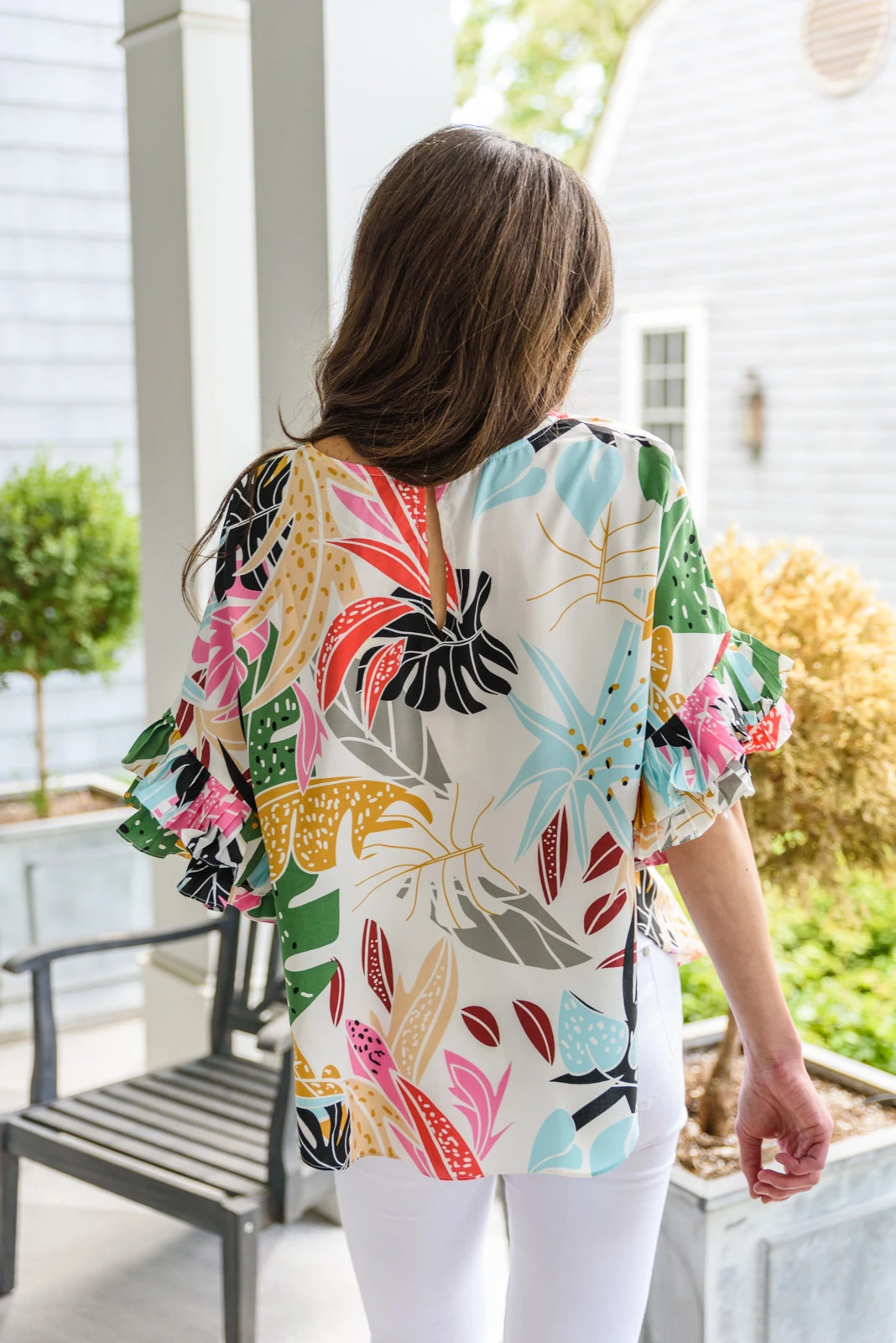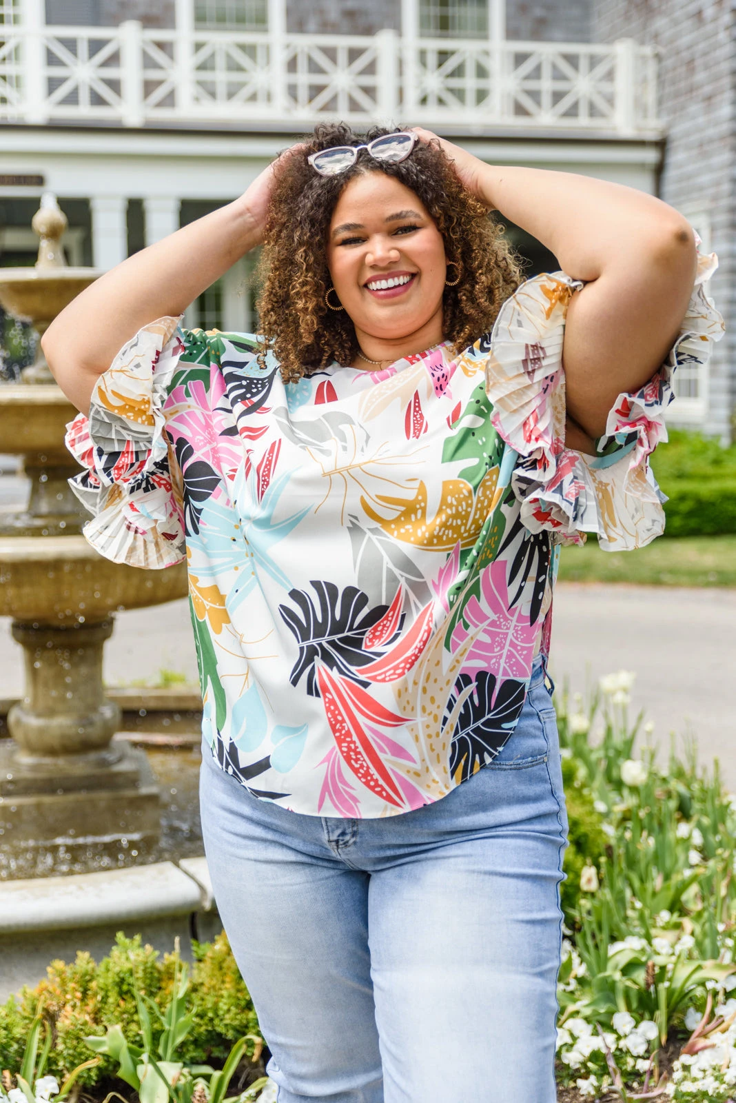 Keywords: Top, Leaf Print, Colorful, Ruffle, Pleated