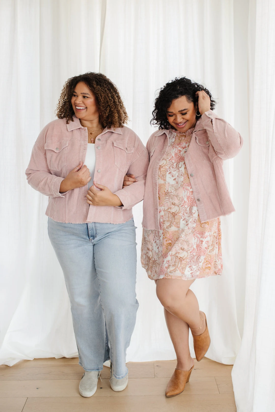 Step out in style this season in the One To Remember Shacket. This lightweight shirt-meets-jacket is composed of a classic corduroy fabric in a stunning mauve color. Shaped by a collared neckline and long sleeves with button cuffs and two front flap pockets. The slightly oversized bodice has a functional button placket down the center and ends at an uneven raw hem.