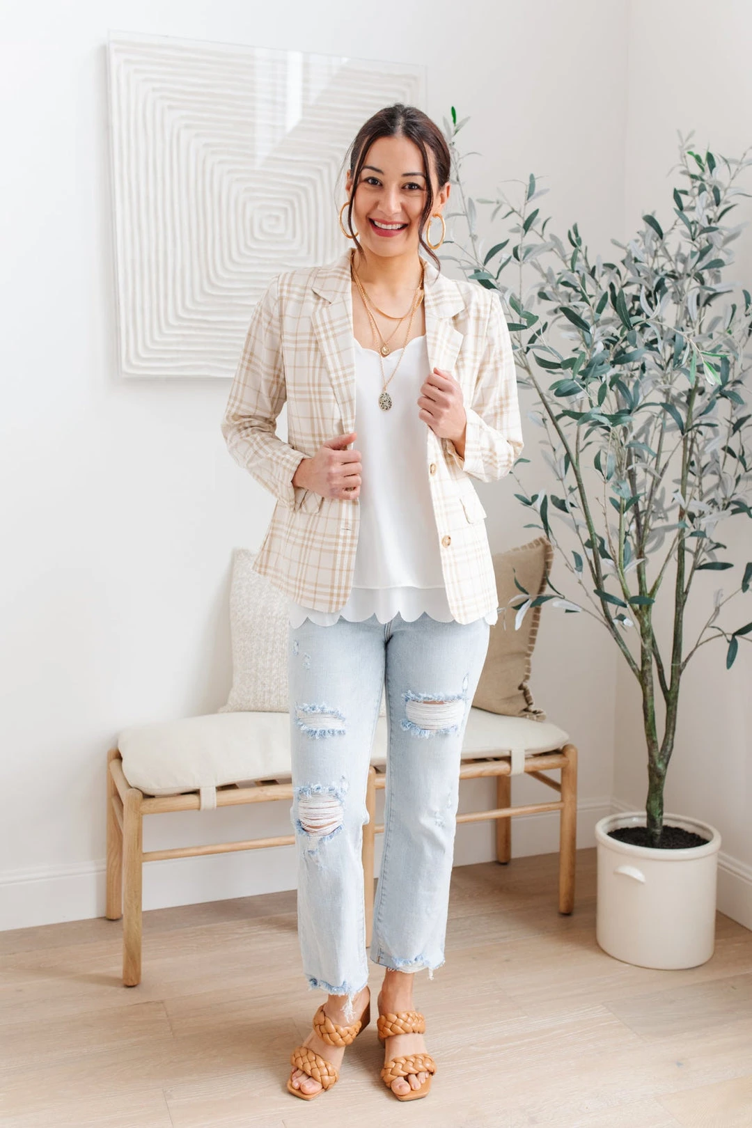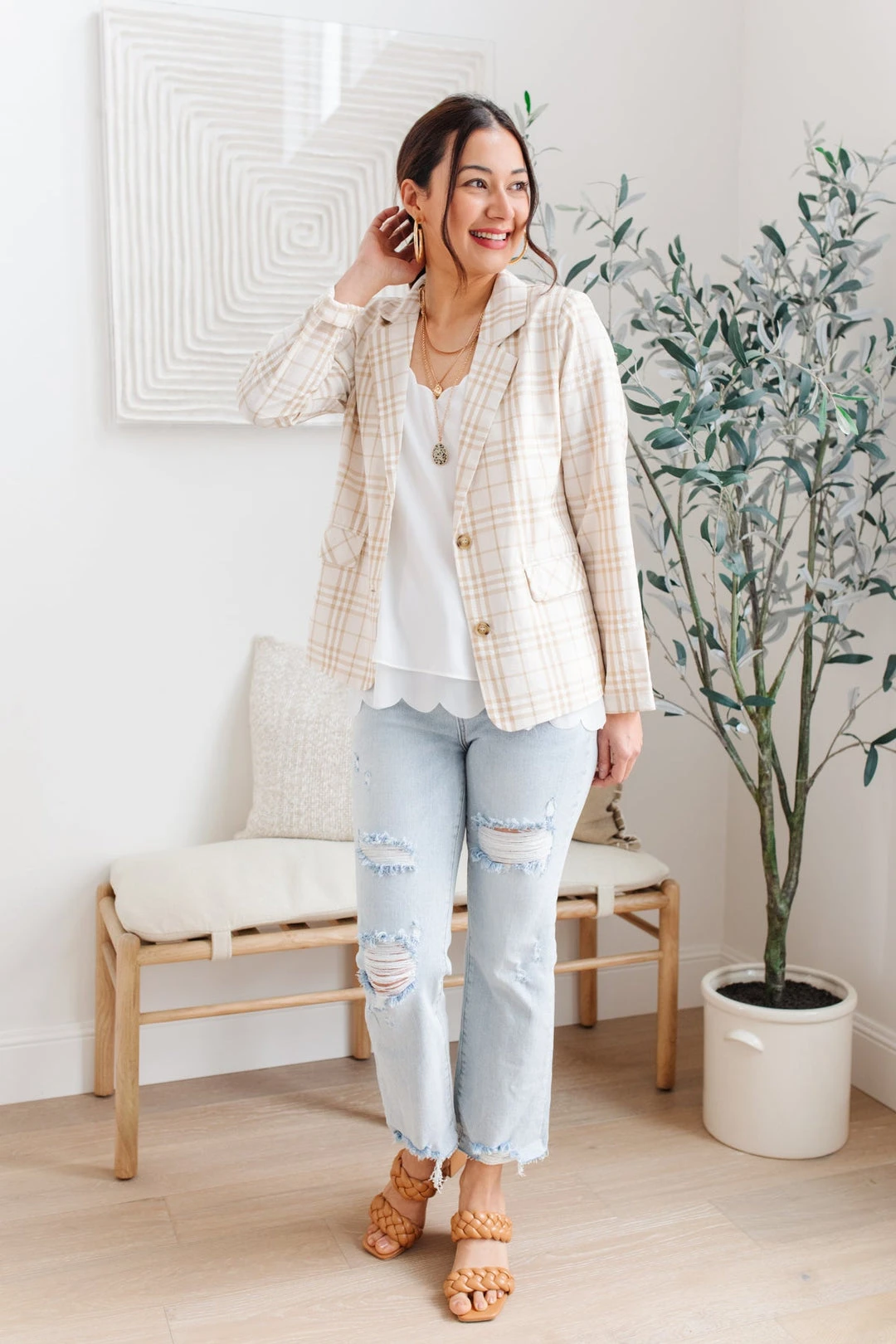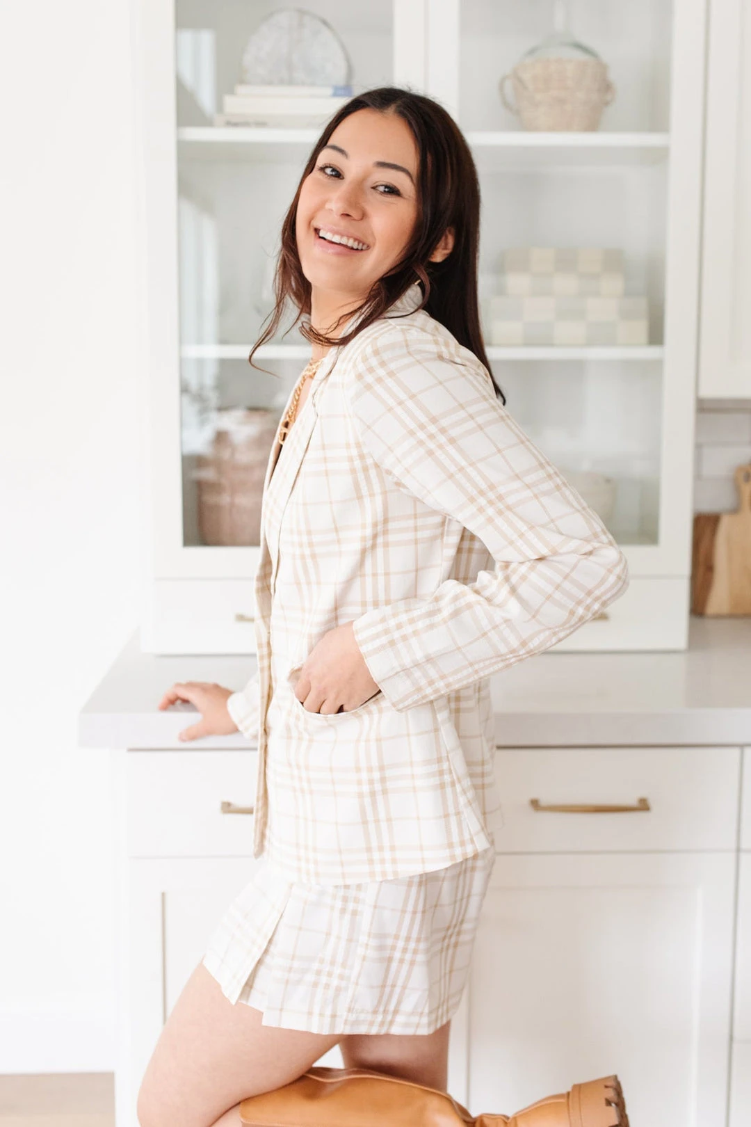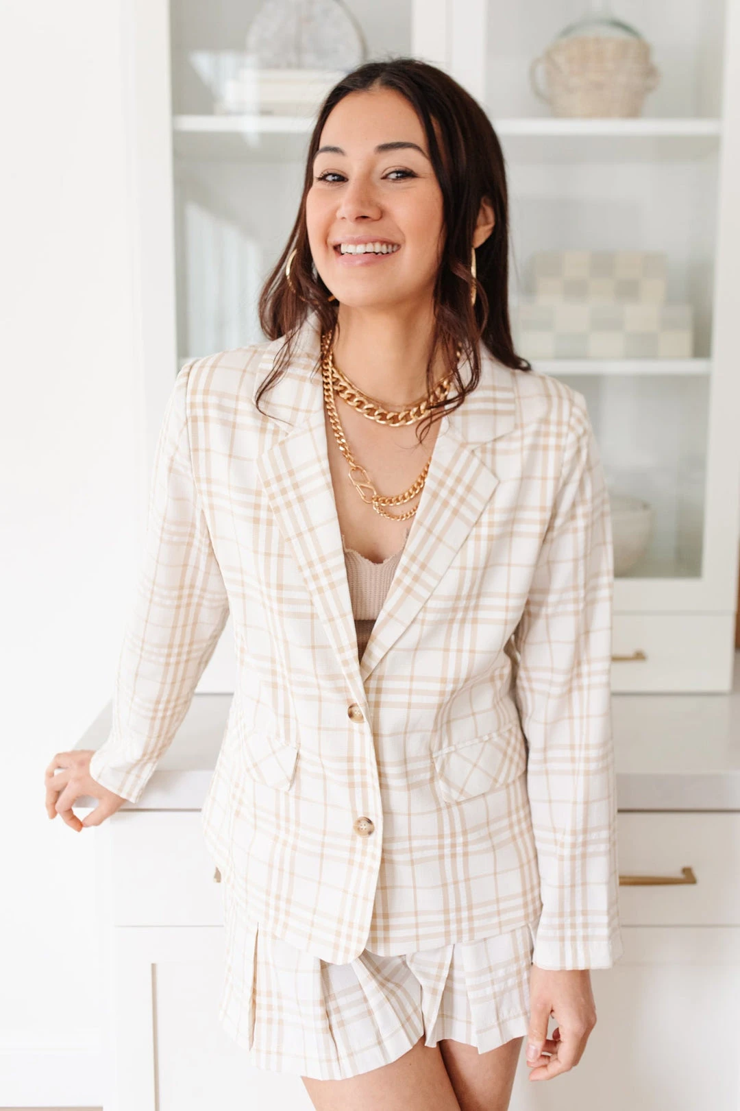 Chic and timeless in the Dressed In Plaid Blazer. This stunning piece is shaped by an open front with lapel collar, two front flap pockets, shoulder pads, and relaxed silhouette. Pair with denim and loafers for an office chic look, or layer over a dress and heels for a day to night outfit!