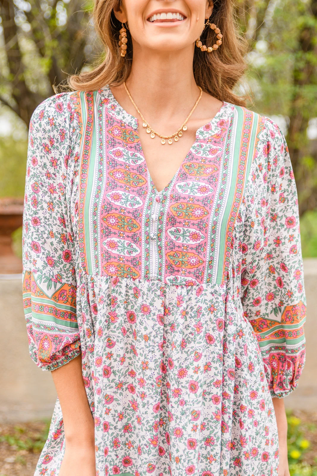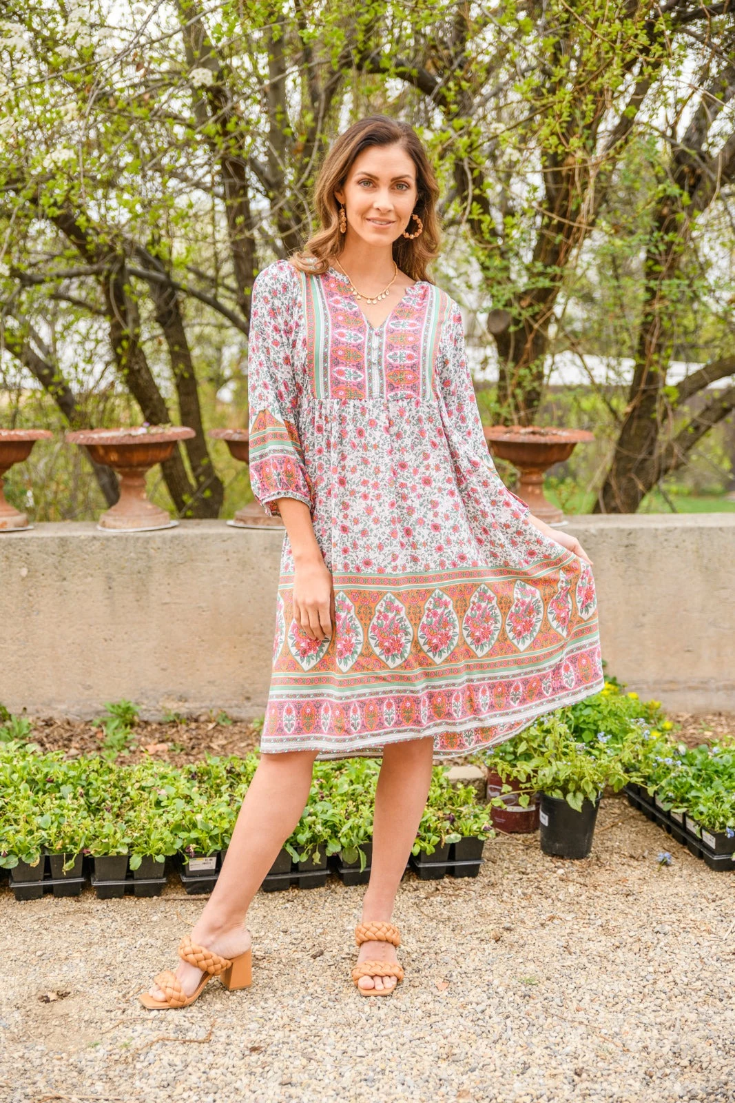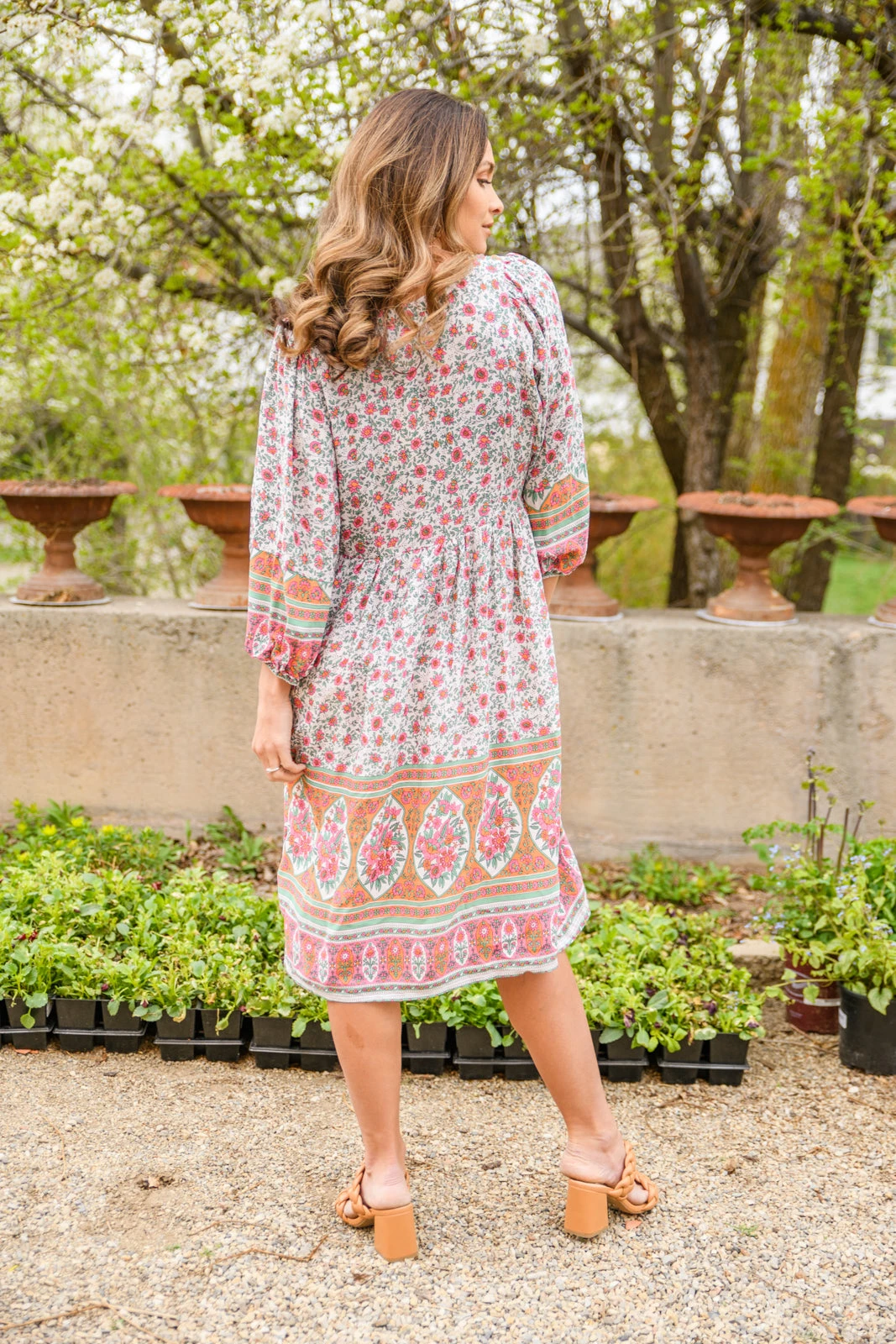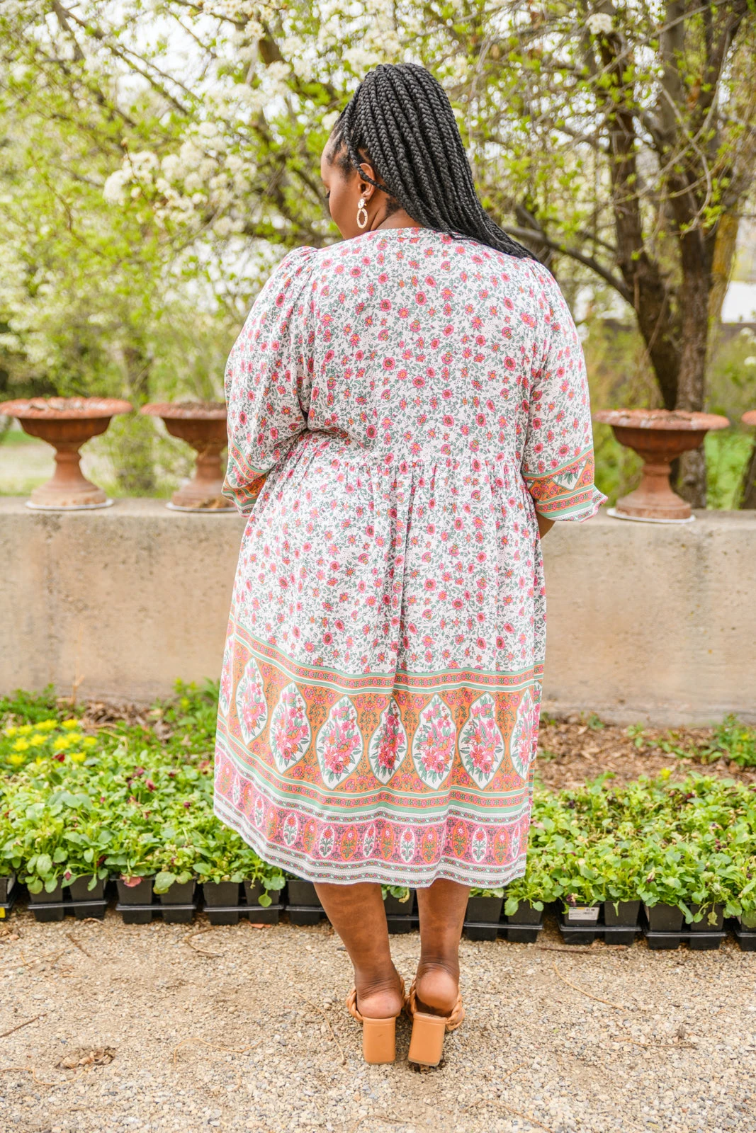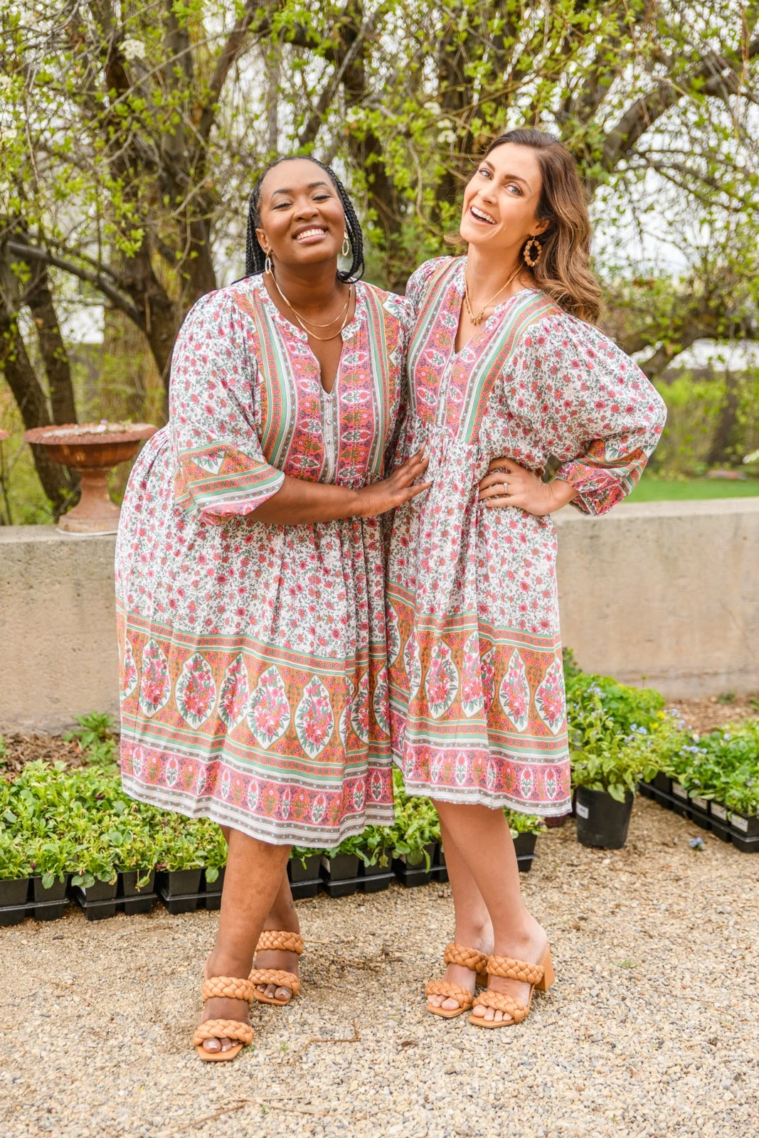 If you need a little arm coverage but still need to stay cool look no further than the Ready To Garden Dress! Featuring 3/4 length balloon sleeves with an elasticated cuff and covered buttons on the bust! The greens, pinks, and oranges live harmoniously in an intricate printed design. Wear with some sandals or wedges for a dreamy garden party!