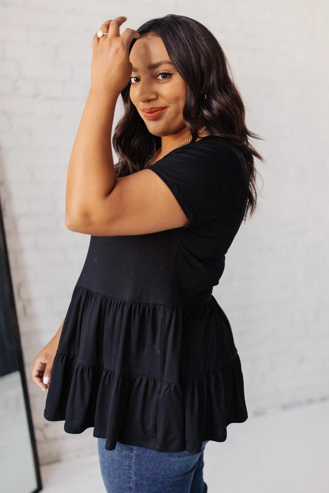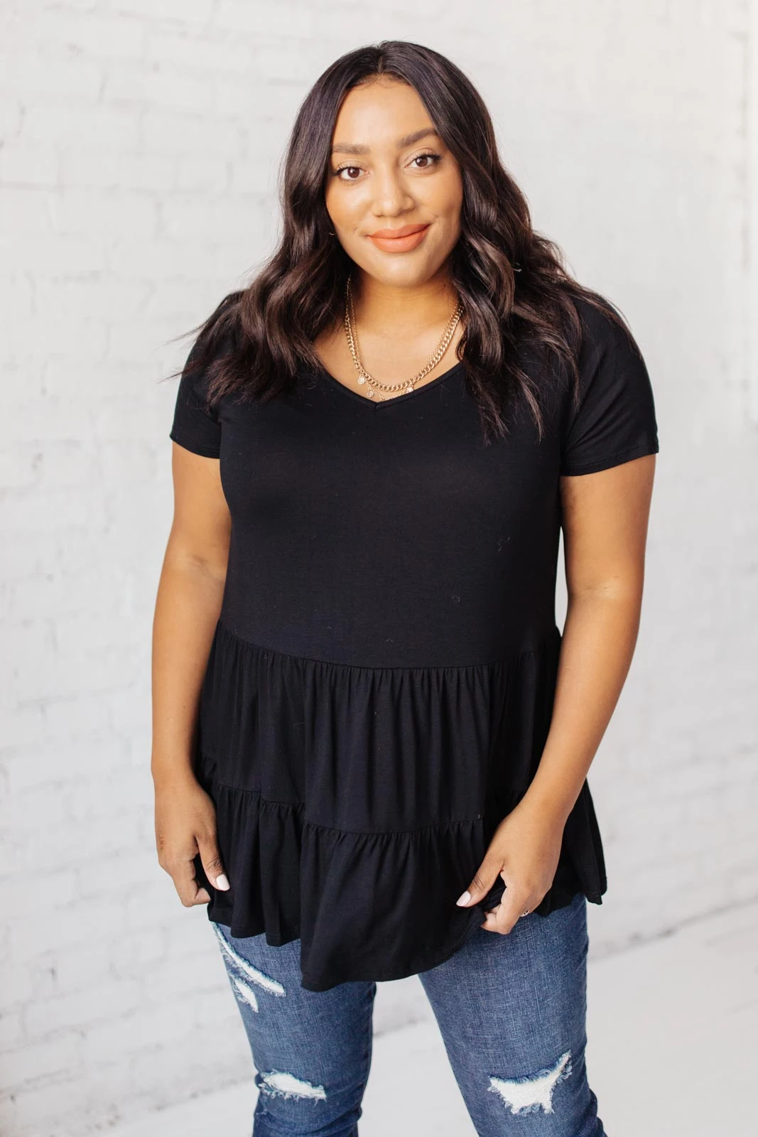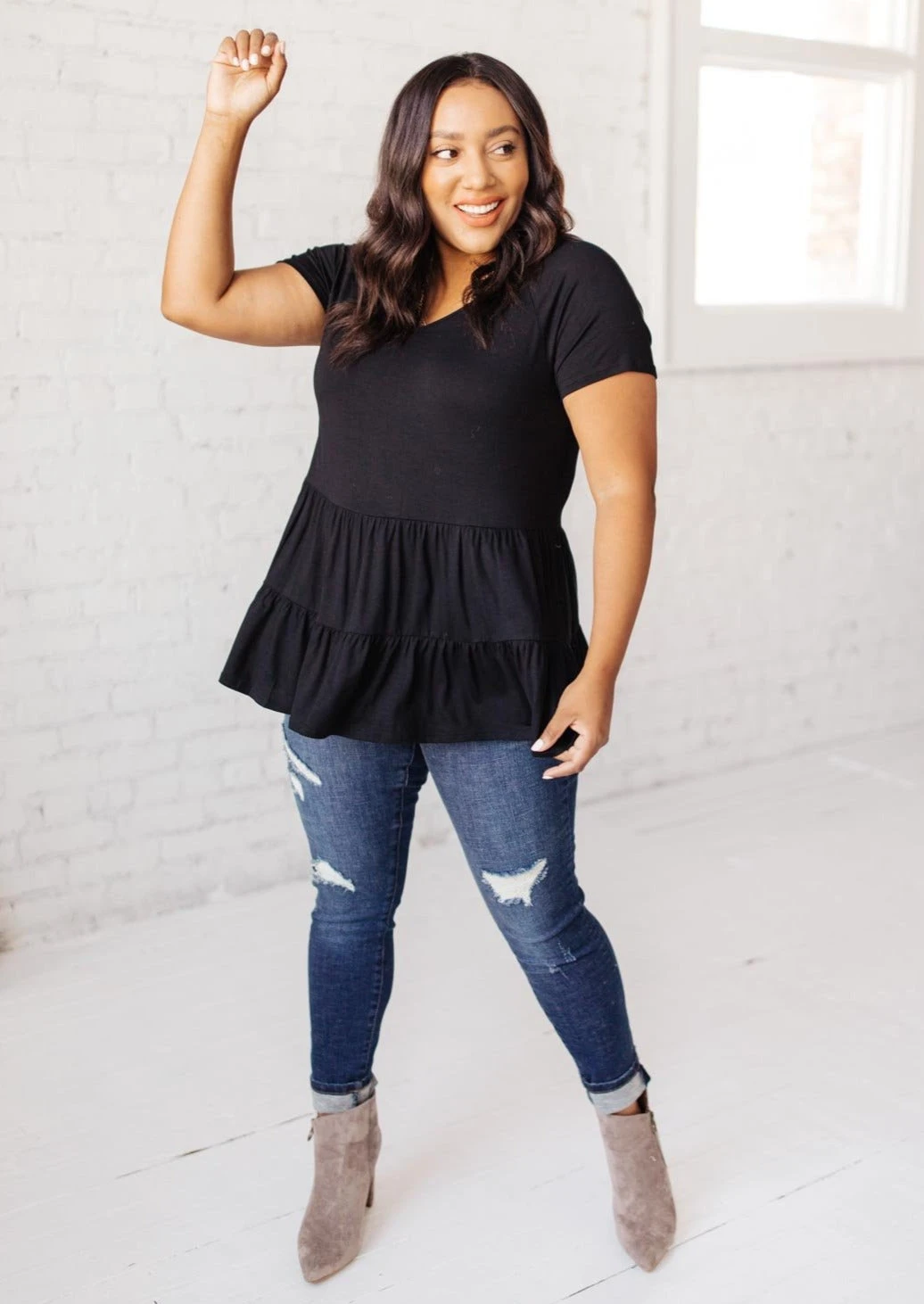 Keywords: Short Sleeve Top, T Shirt, V Neck Top, Tiered Top, Peplum, Black Top