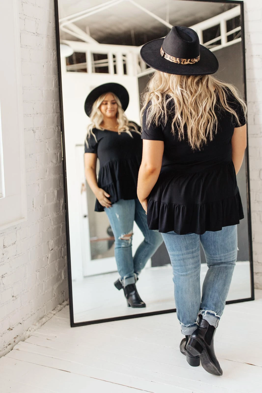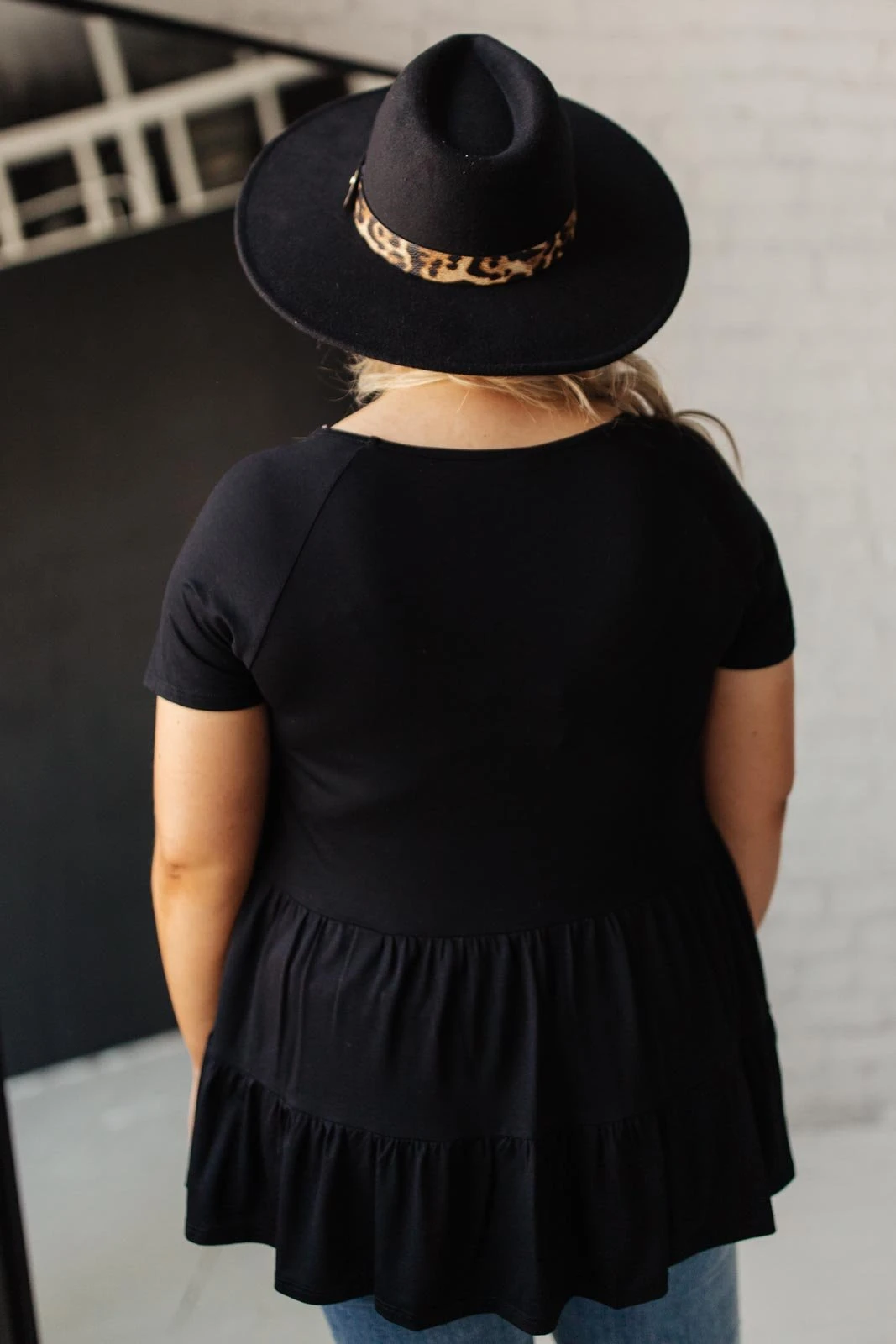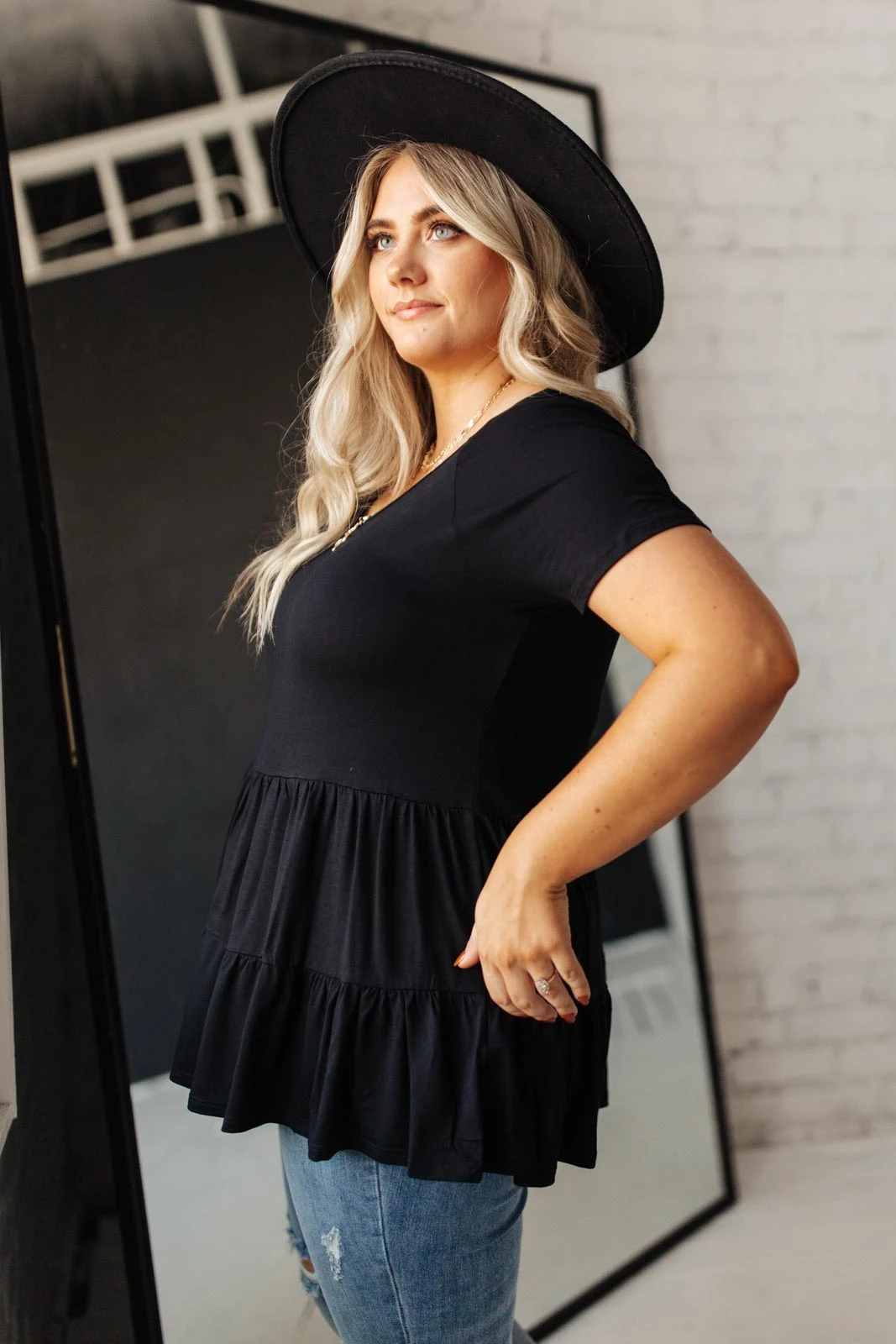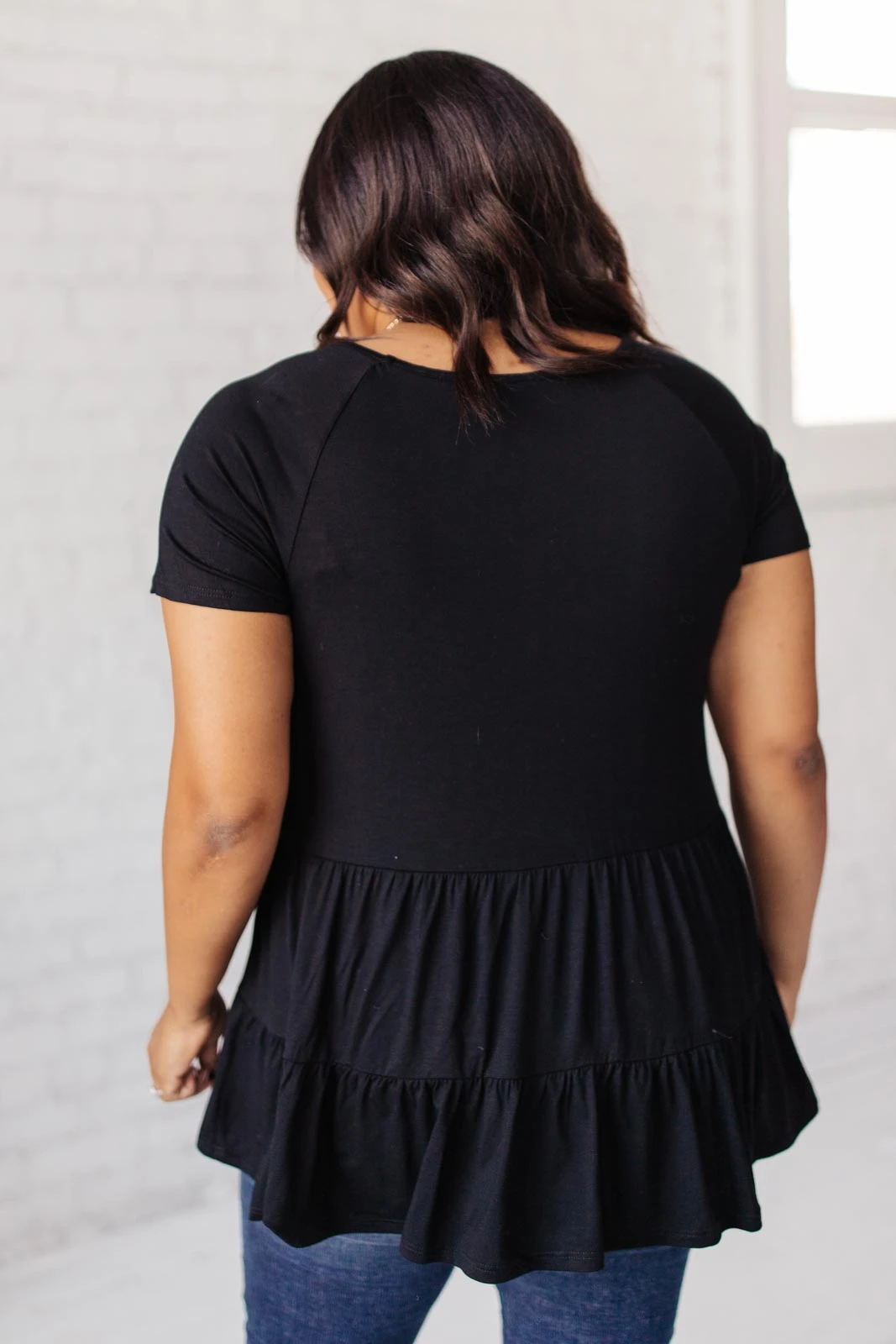 Keywords: Short Sleeve Top, T Shirt, V Neck Top, Tiered Top, Peplum, Black Top