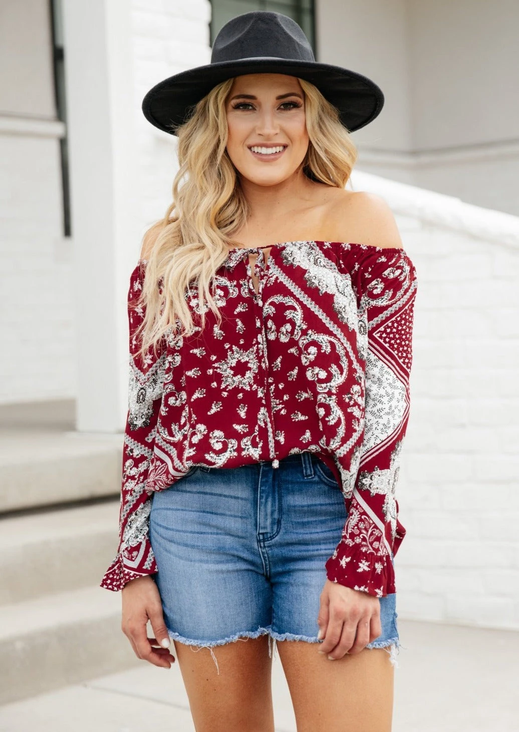 The bandana print on the Runaway Top is perfect for fall time! This bright top shows off your shoulders and has a ruffle detail at the wrist. Pair this top with denim shorts or jeans and a wide brim hat.