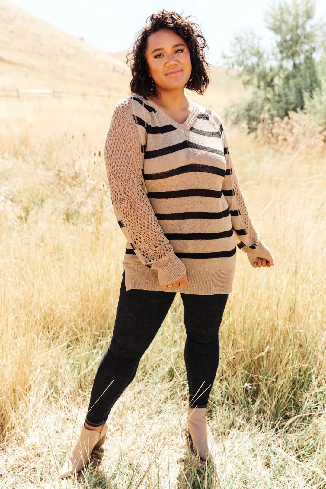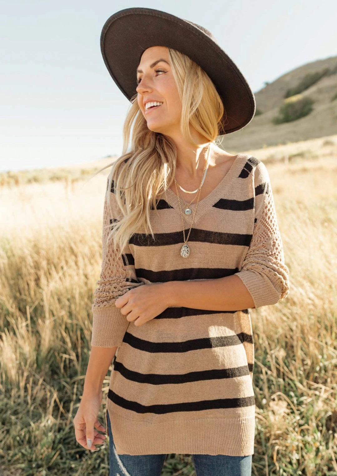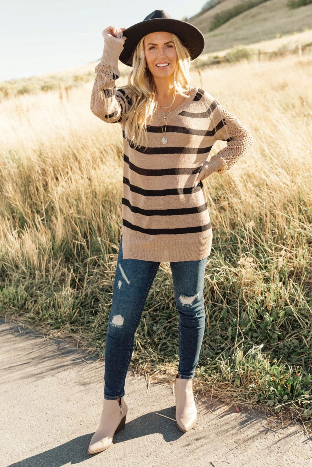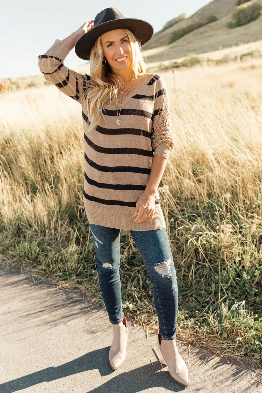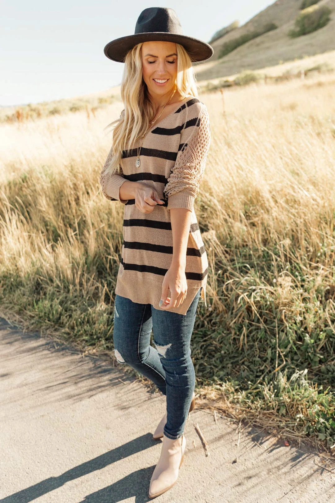 You can’t go wrong with neutral stripes! The Safe And Sound Striped Top mixes stripes with a beautiful open knit sleeve design. This long length sweater will have you feeling cozy and put together all season long. Pair it with a flared jean and gold jewelry.