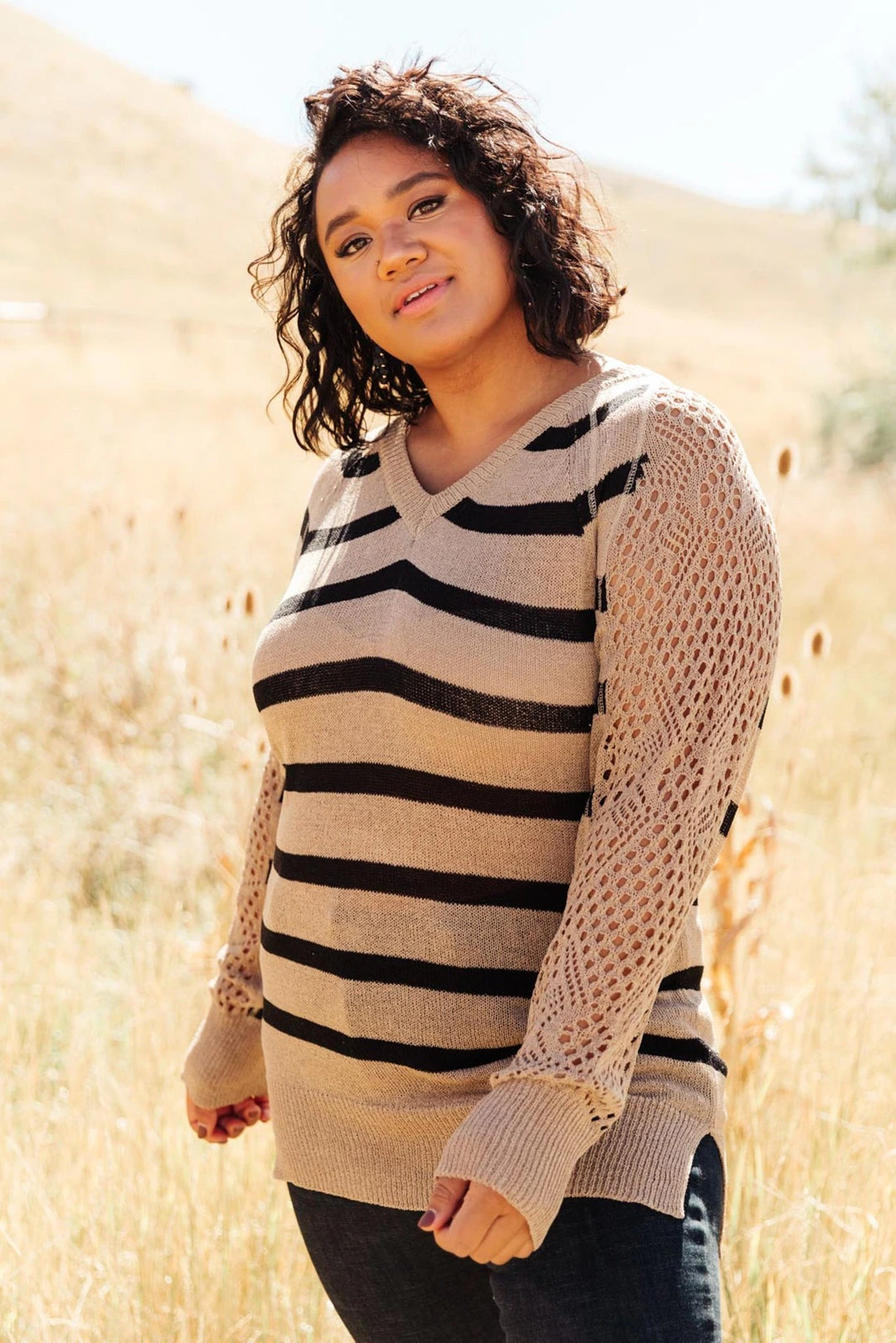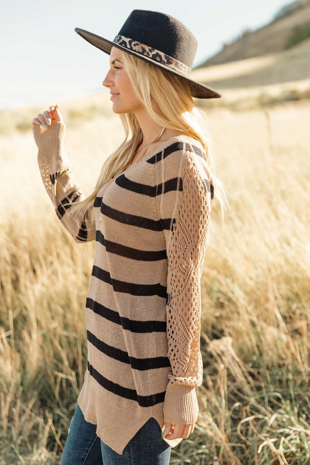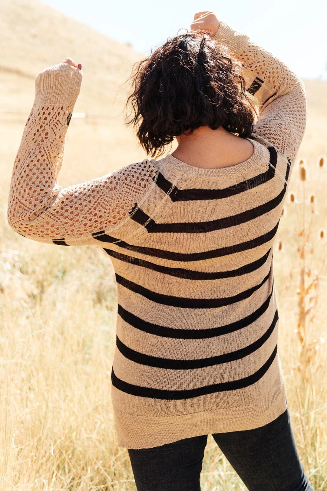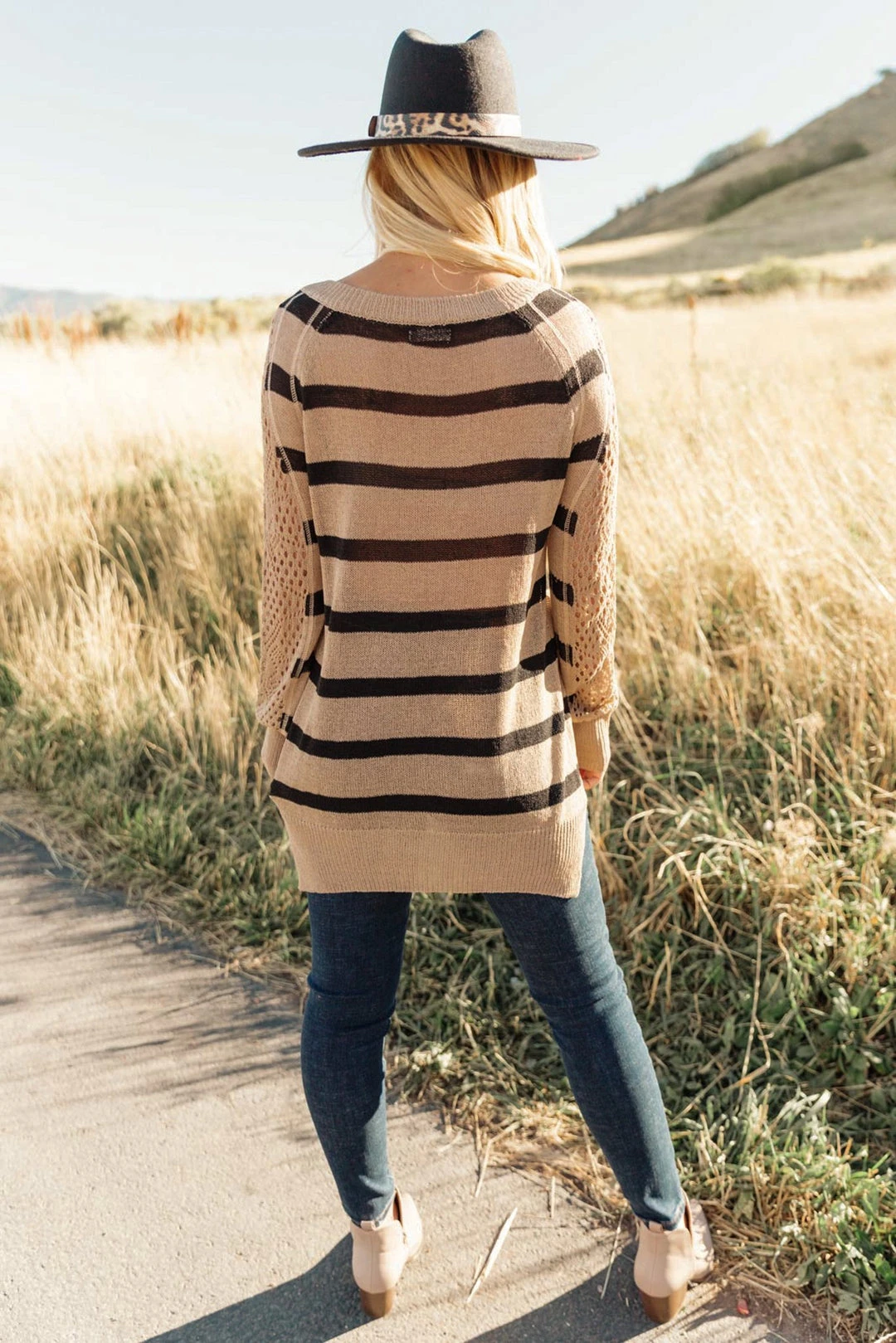 You can’t go wrong with neutral stripes! The Safe And Sound Striped Top mixes stripes with a beautiful open knit sleeve design. This long length sweater will have you feeling cozy and put together all season long. Pair it with a flared jean and gold jewelry.
