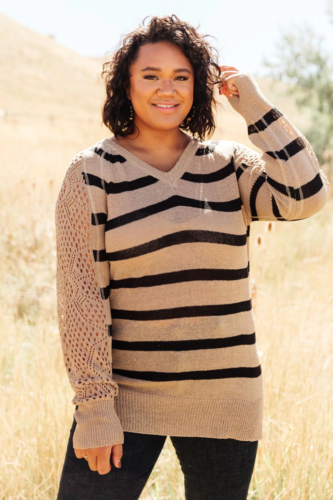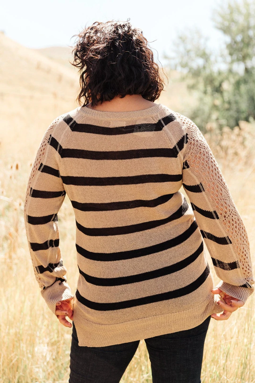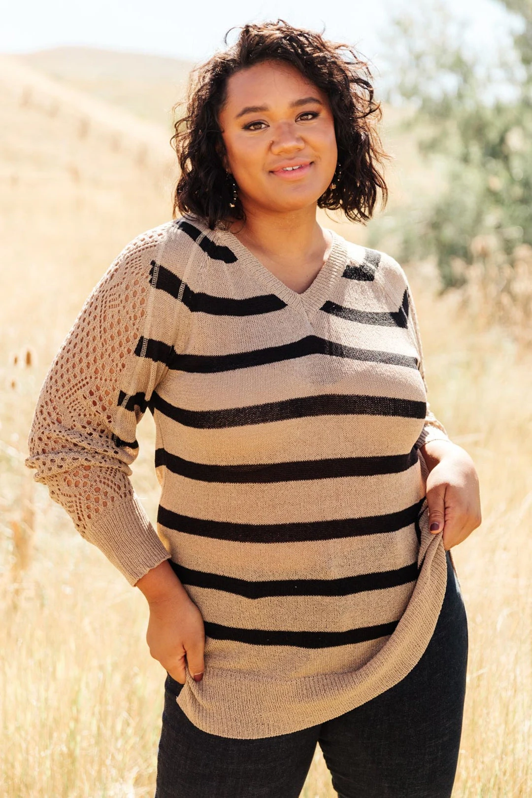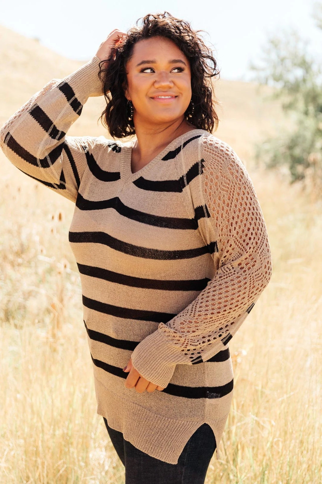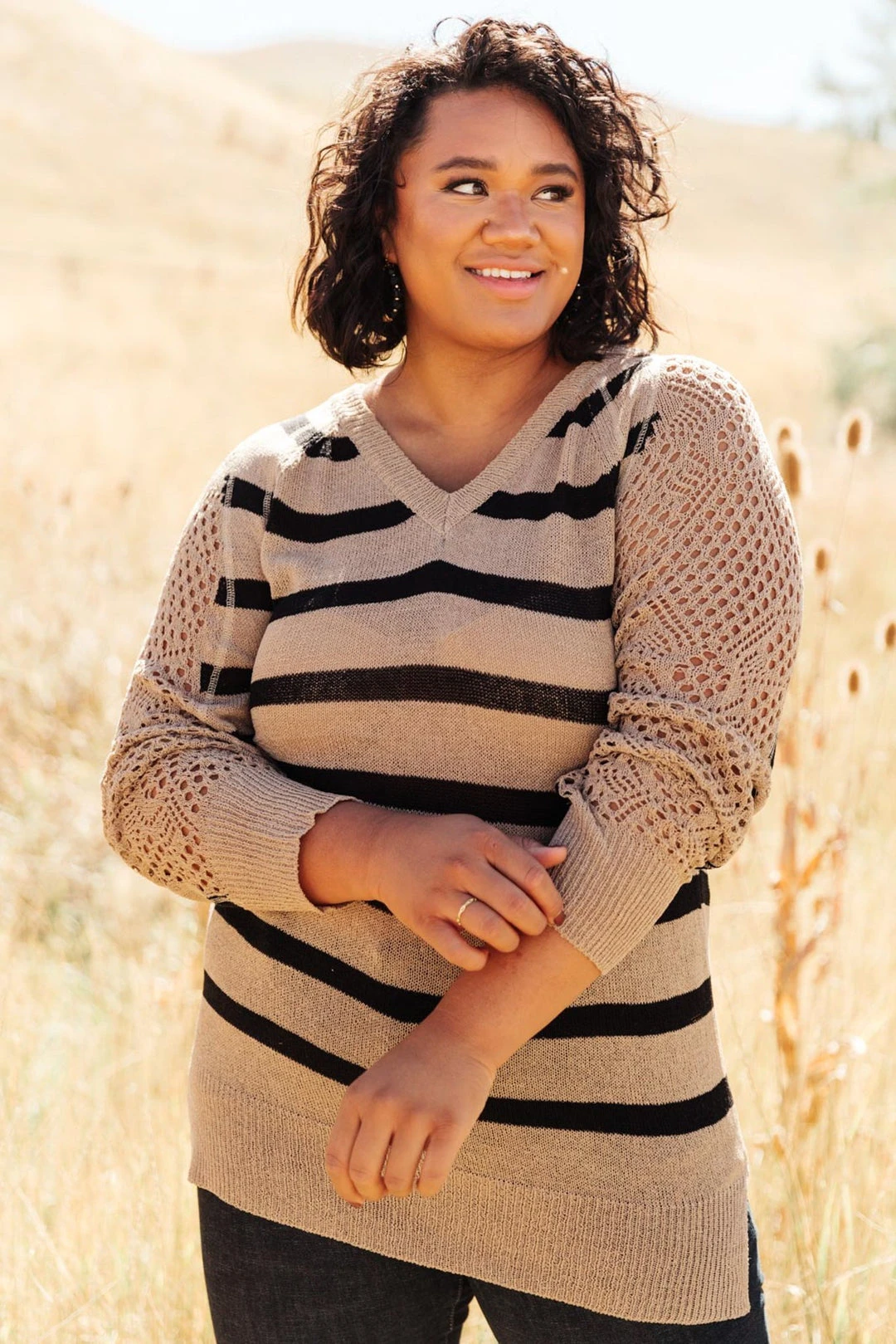 You can’t go wrong with neutral stripes! The Safe And Sound Striped Top mixes stripes with a beautiful open knit sleeve design. This long length sweater will have you feeling cozy and put together all season long. Pair it with a flared jean and gold jewelry.